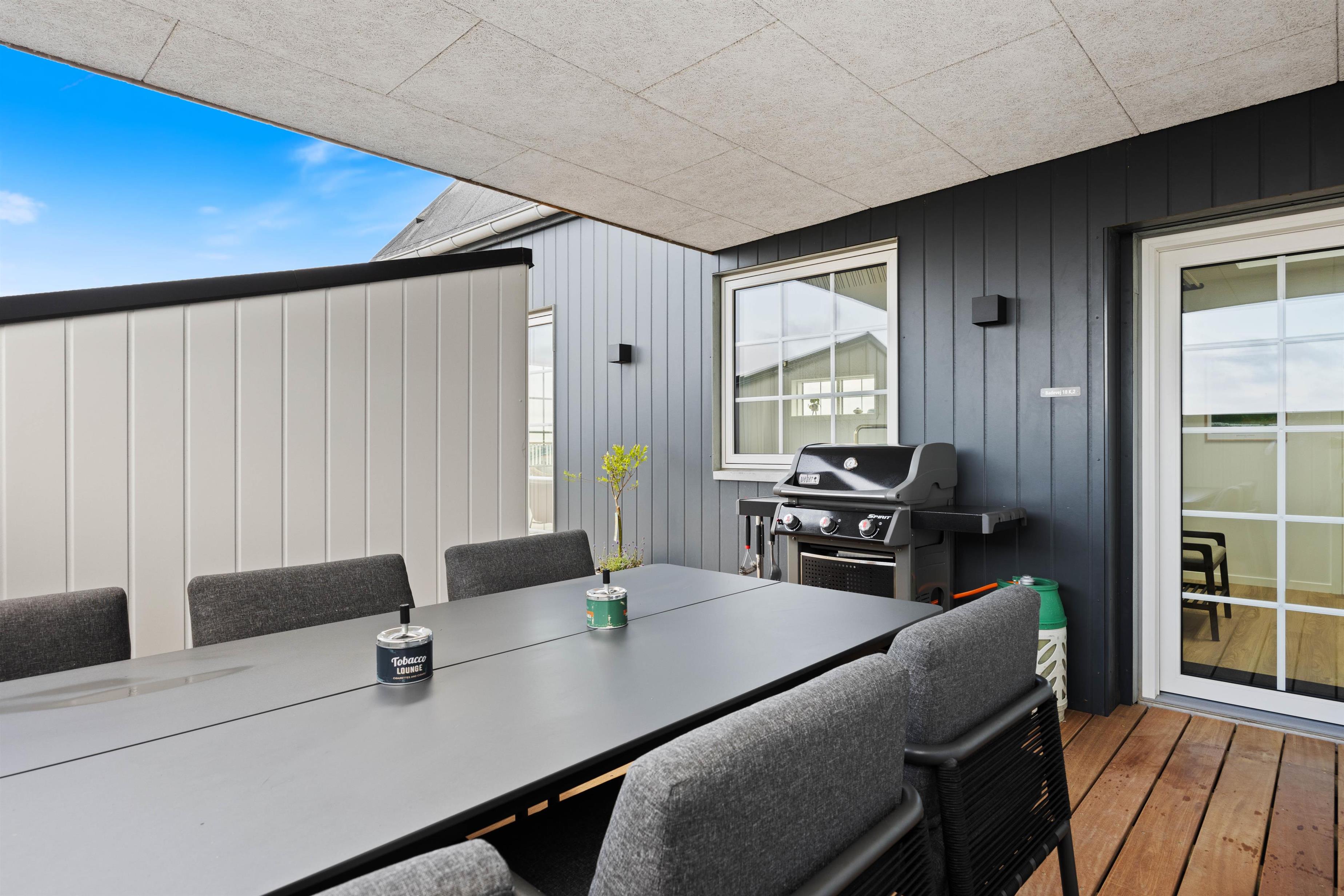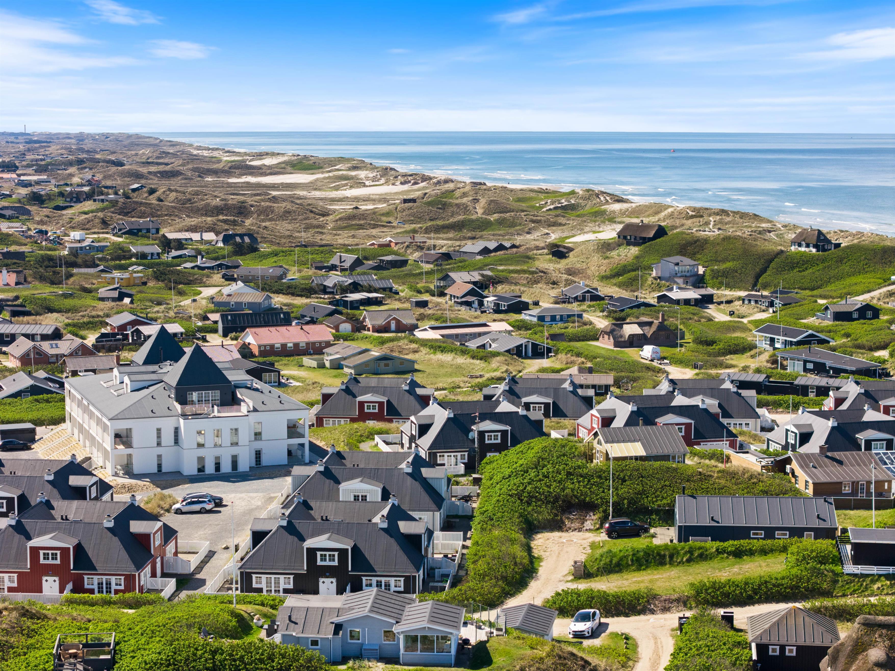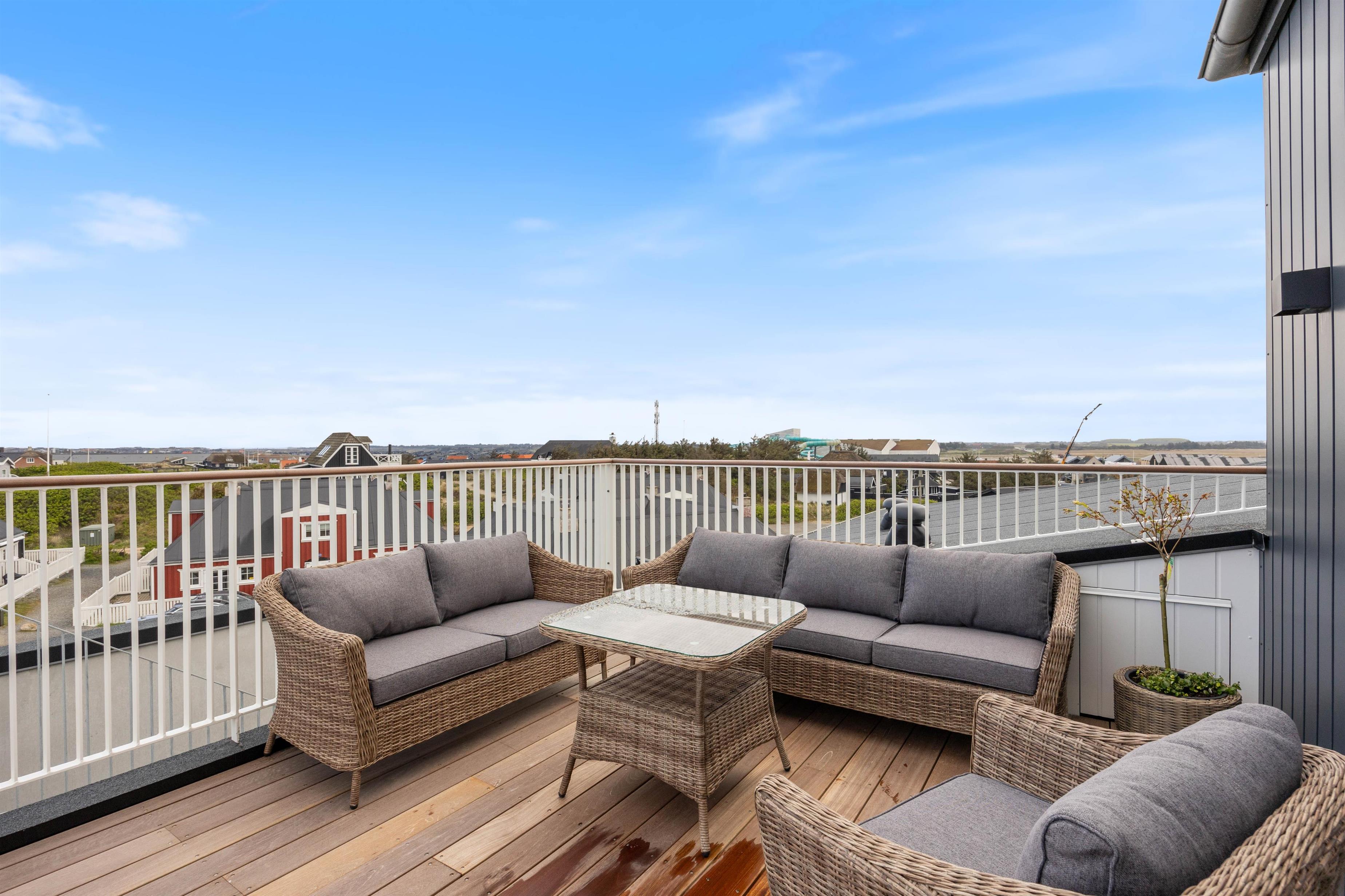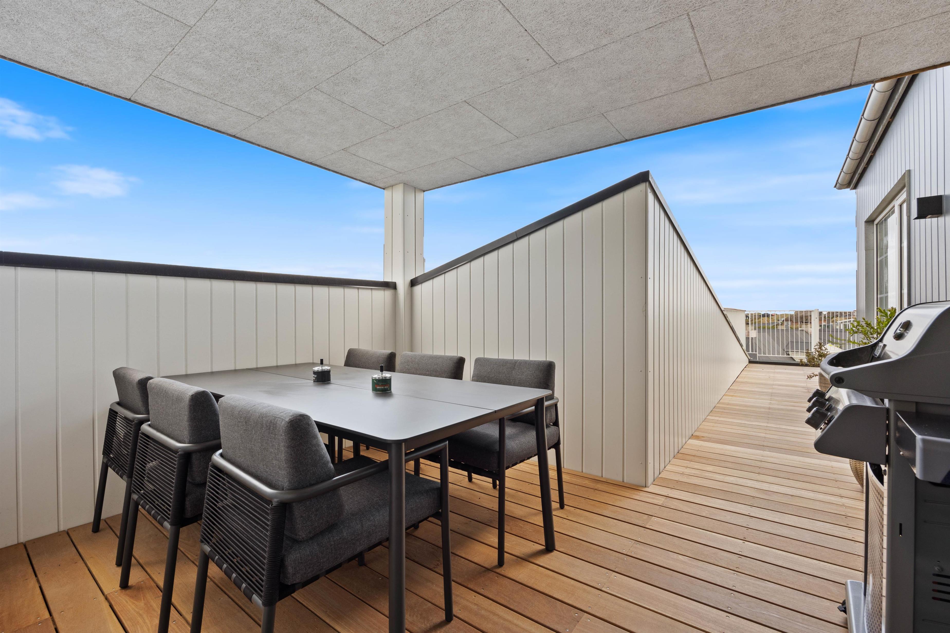 På den afskærmede tagterrasse på 212 m2 kan I hygge jer, selv når vejret ikke viser sig fra sin bedste side. Om I vil nyde et måltid mad, solbade eller tage et spil kort, så kan denne tagterrasse garantere jer de mest fantastiske rammer. Uanset vind og vejr, kan I finde et skønt sted at sidde og samles udendørs, mens I har den mest fantastiske udsigt ud over Vesterhavet og klitlandskabet. I kan bogstaveligt talt smage saltet fra Nordsøen, så tæt er I på vandet. Fra ferielejligheden kan I se både Vesterhavet, Søndervig by samt Ringkøbing Fjord med alle kitesurferne.