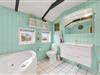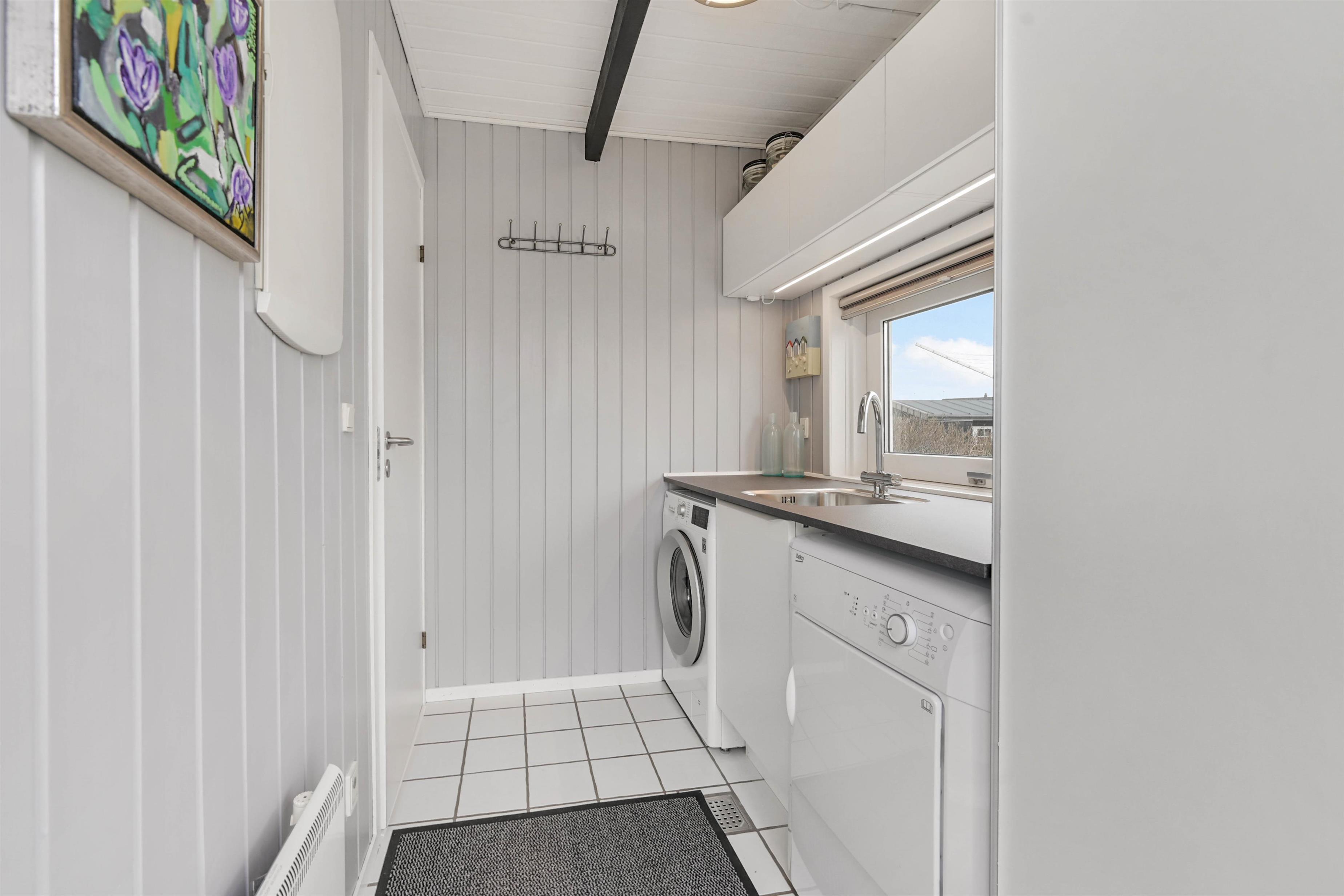 Der er to badeværelser, begge med bruseniche og gulvvarme. Sommerhuset har et dejligt og veludstyret køkken, som ligger i forlængelse af spisestue og stue. Fra den hyggelige og velindrettede stue er der udgang til huset store, lukkede og delvist overdækkede terrasse.