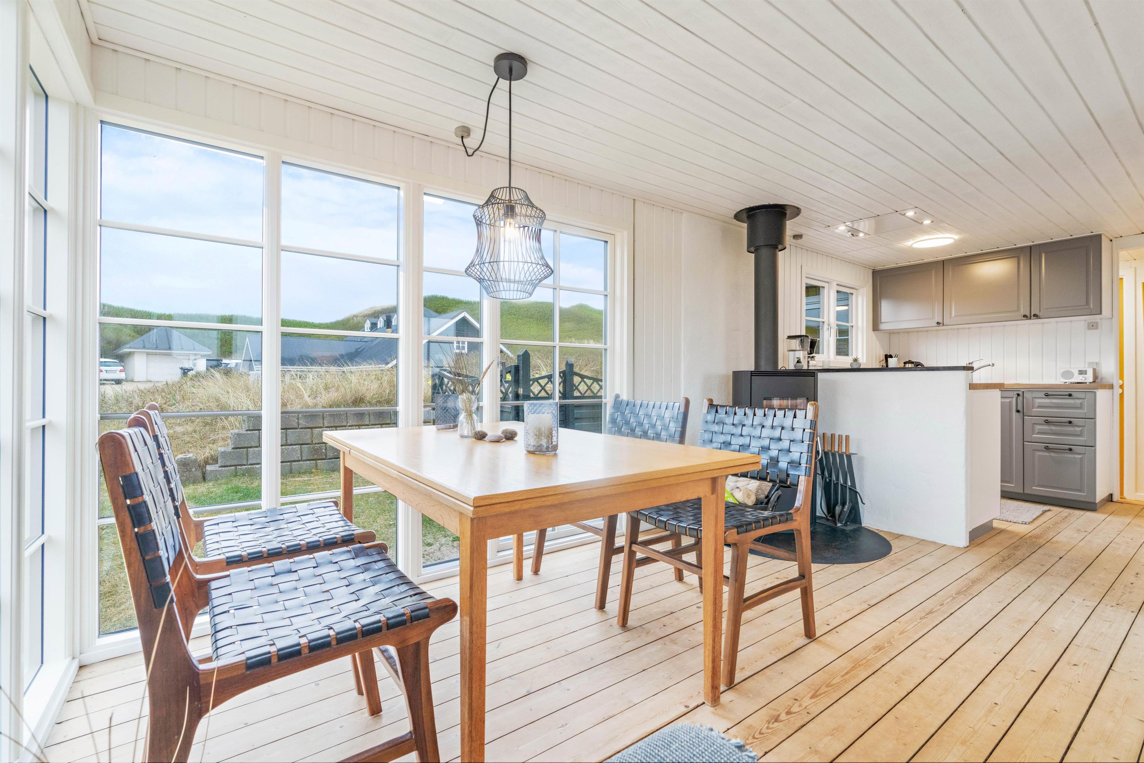 Der er et åbent køkken og spisebord i direkte forbindelse med stuen, så I kan hygge jer med madlavningen og et godt glas vin. Fra de store vinduespartier i spisestuen har I udsigt til det skønne klitlandskab udenfor. Køkkenet er veludstyret, og i feriehuset er der også et fint badeværelse og et godt soveværelse med dobbeltseng, så I har lige det, der skal til for at nyde en afslappende ferie. Der er også en køjeseng, hvis I rejser med mindre børn.
