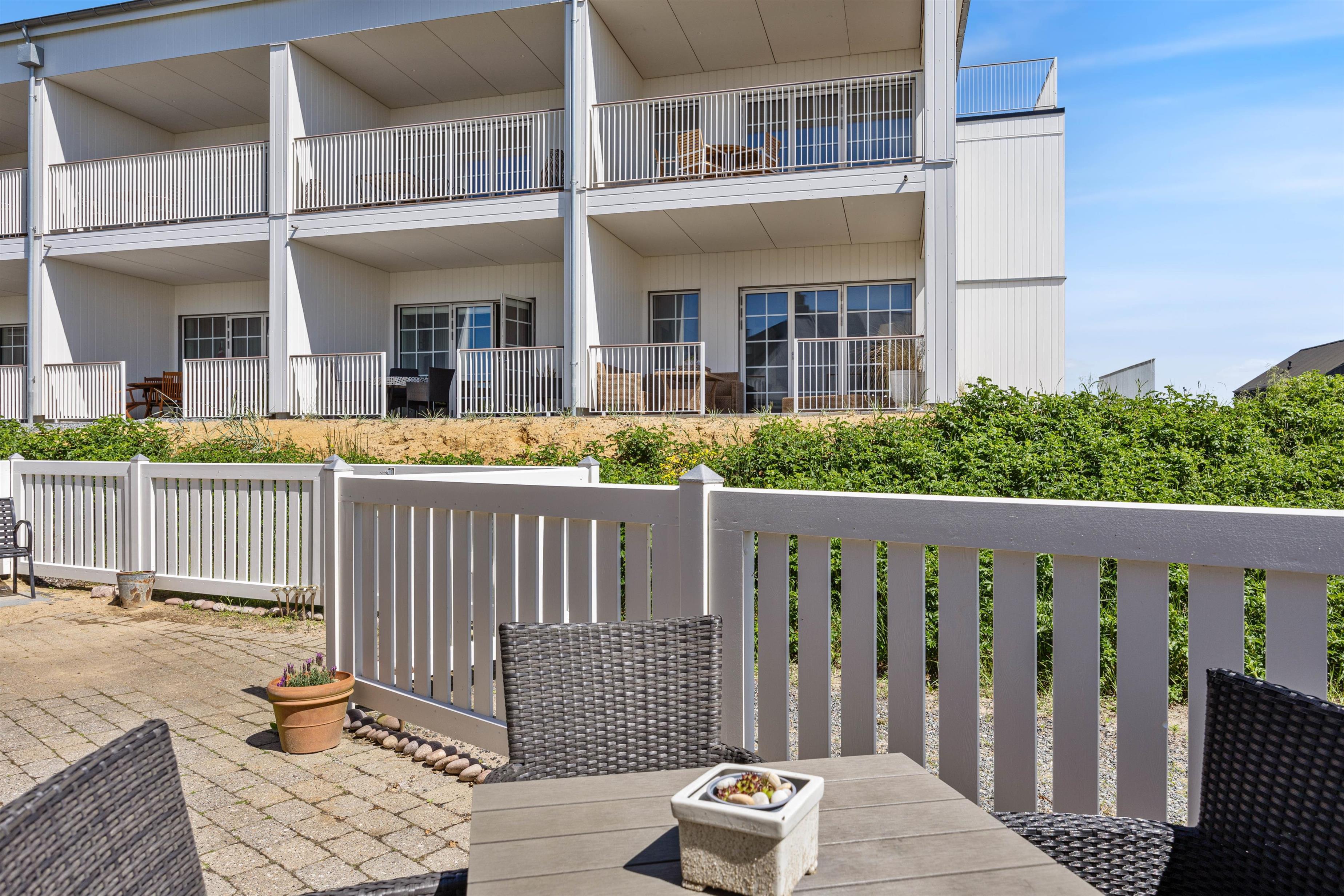 Der er intet, som når solen kommer frem, og temperaturerne stiger. Og når det sker, kan I jo ikke andet, end at komme udenfor og nyde det. Dét kan I gøre fra ferielejlighedens lukkede terrasse, hvor I har både havemøbler og liggestole til rådighed, som I kan nyde det gode vejr fra.
