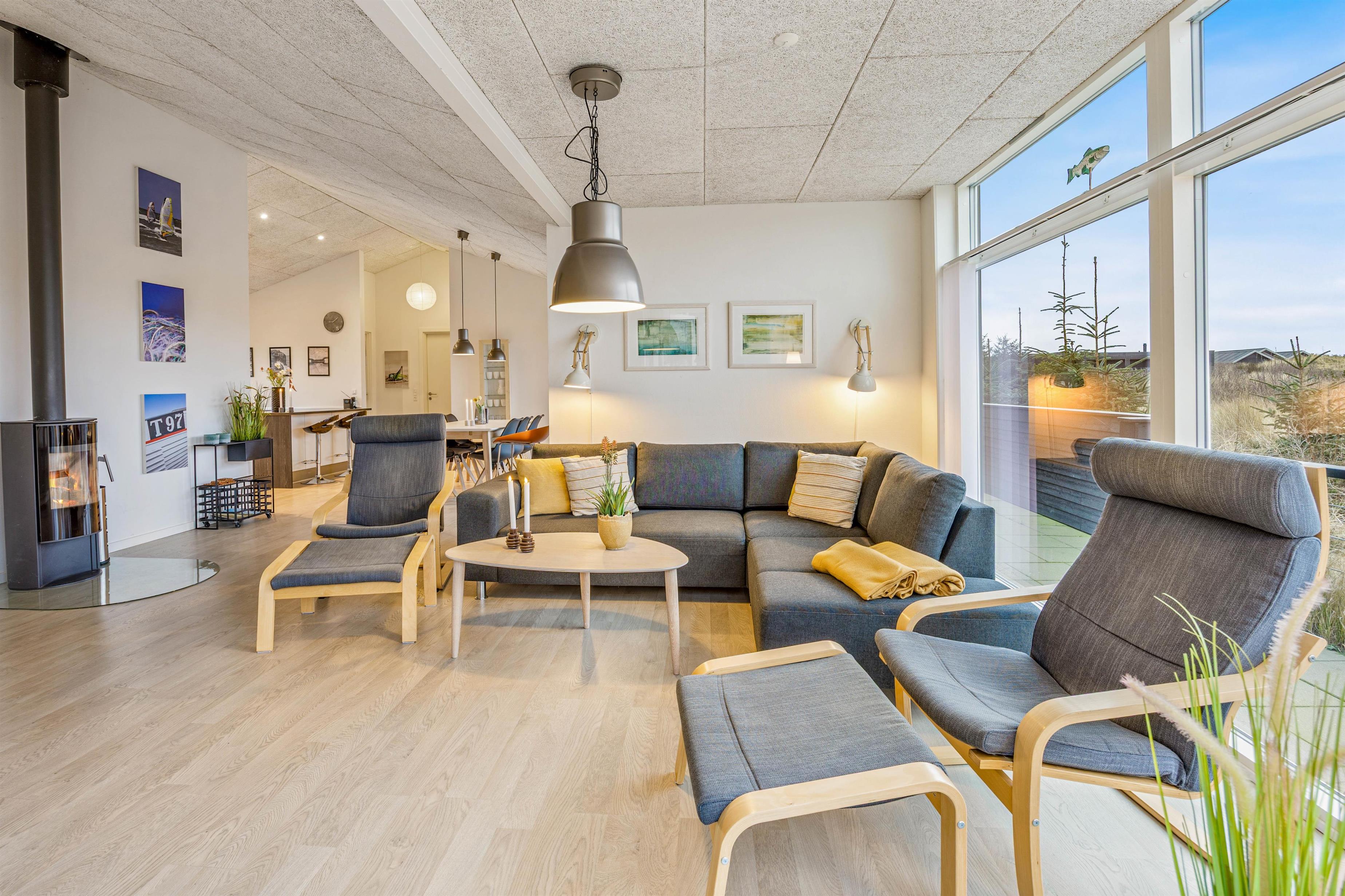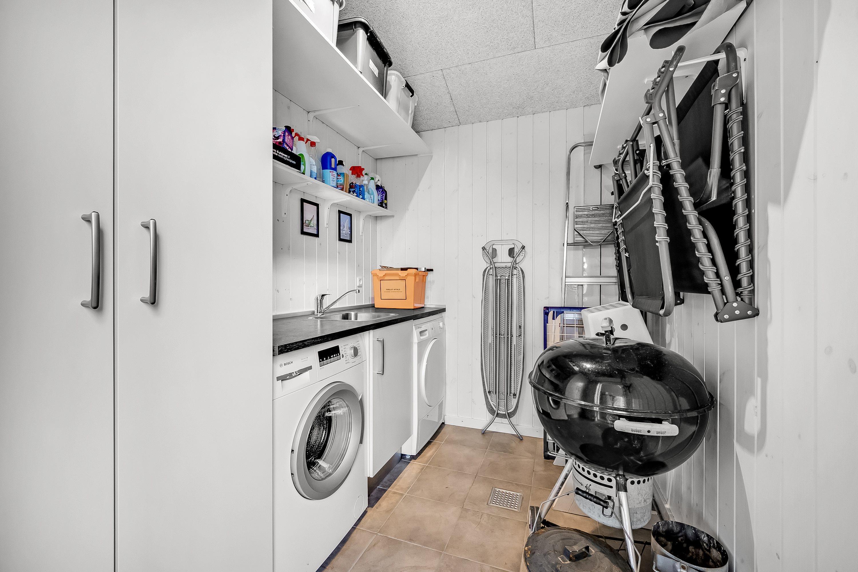 I stuen sørger en hyggelig brændeovn for varme og ægte sommerhusstemning på køligere dage. Sammen med varmepumpen bidrager den til et komfortabelt og behageligt ophold året rundt. Som en ekstra bekvemmelighed er sommerhuset også udstyret med vaskemaskine og tørretumbler, så I kan rejse let og nyde ferien uden bekymringer.
