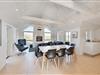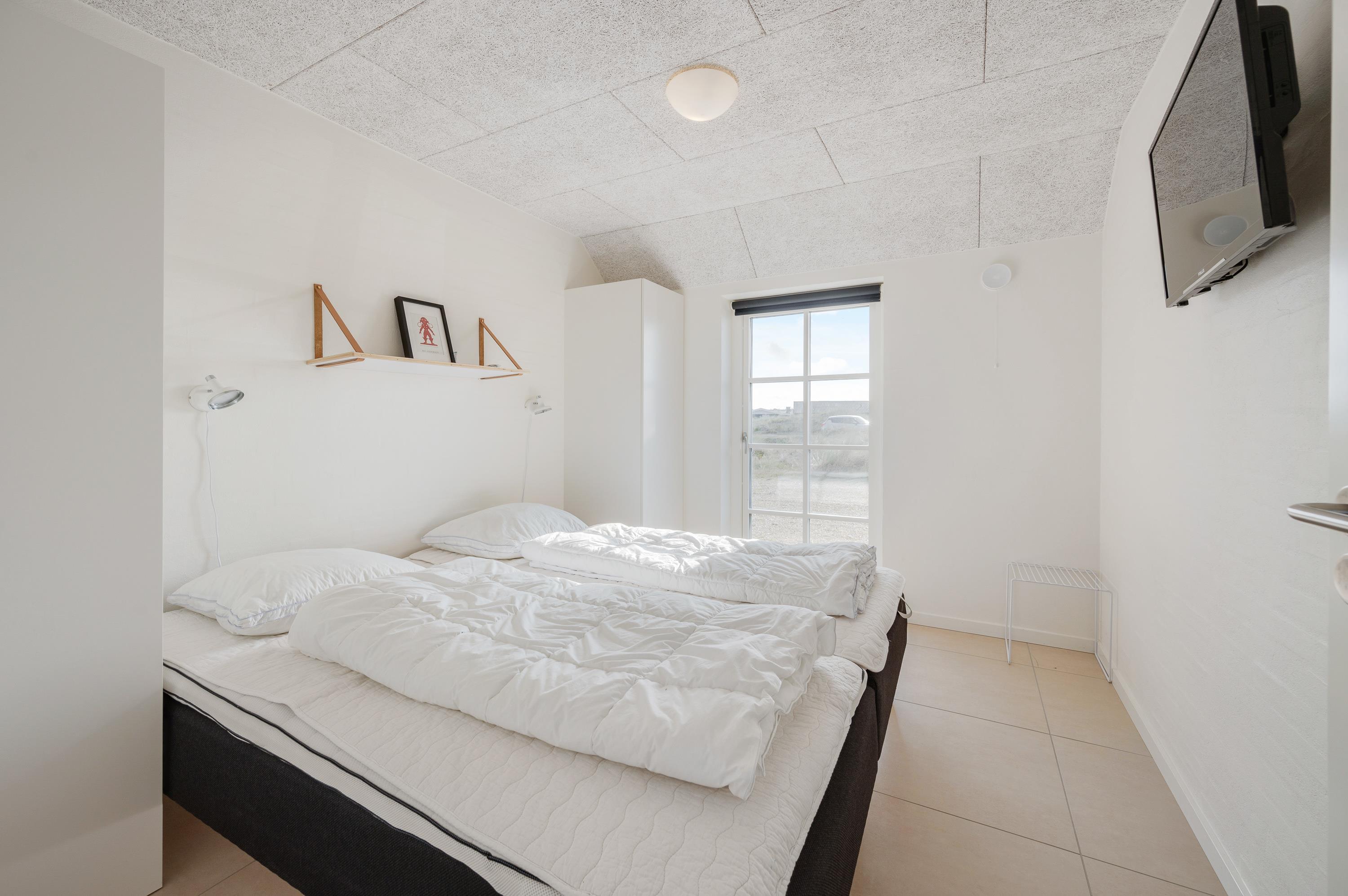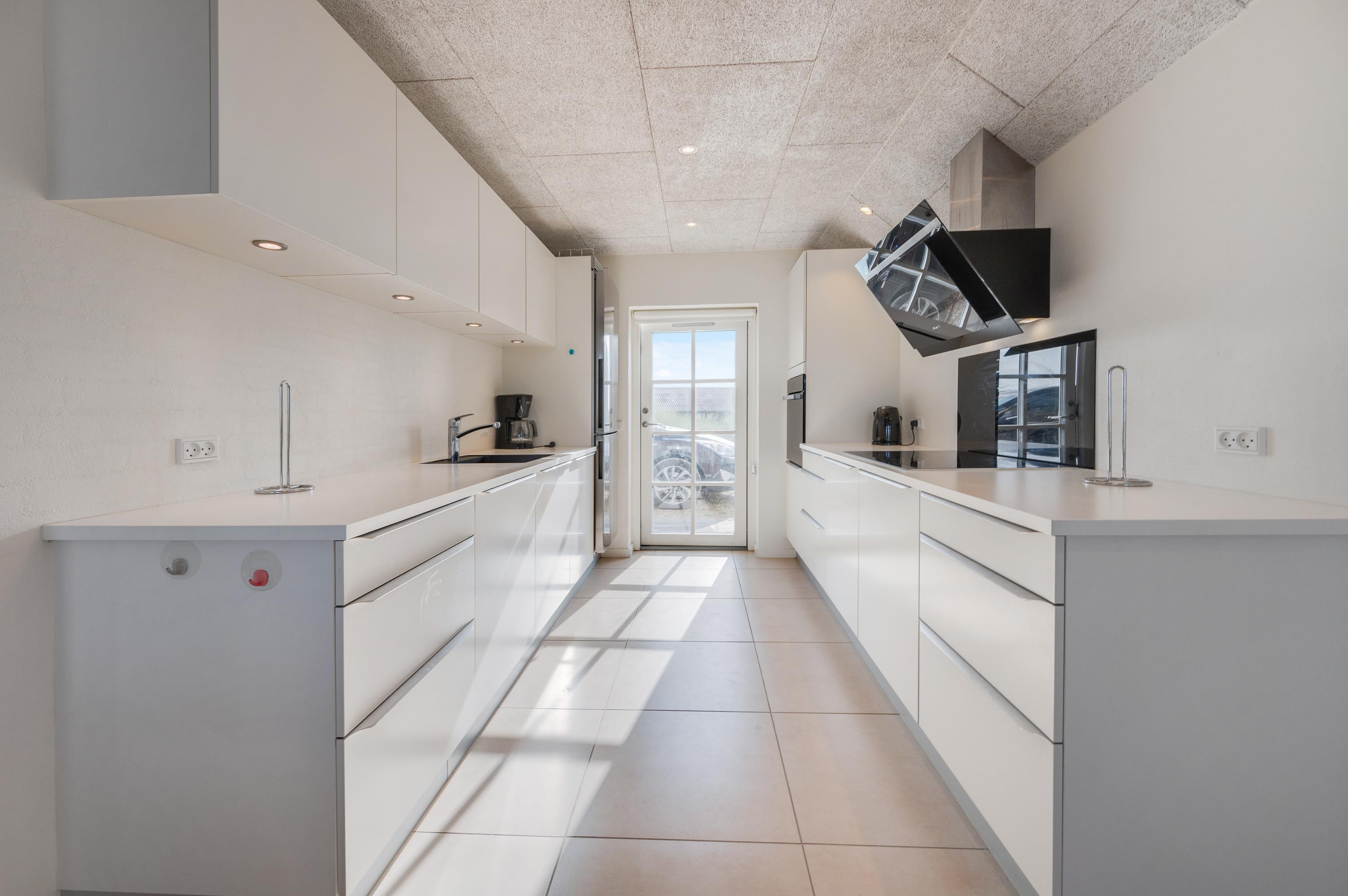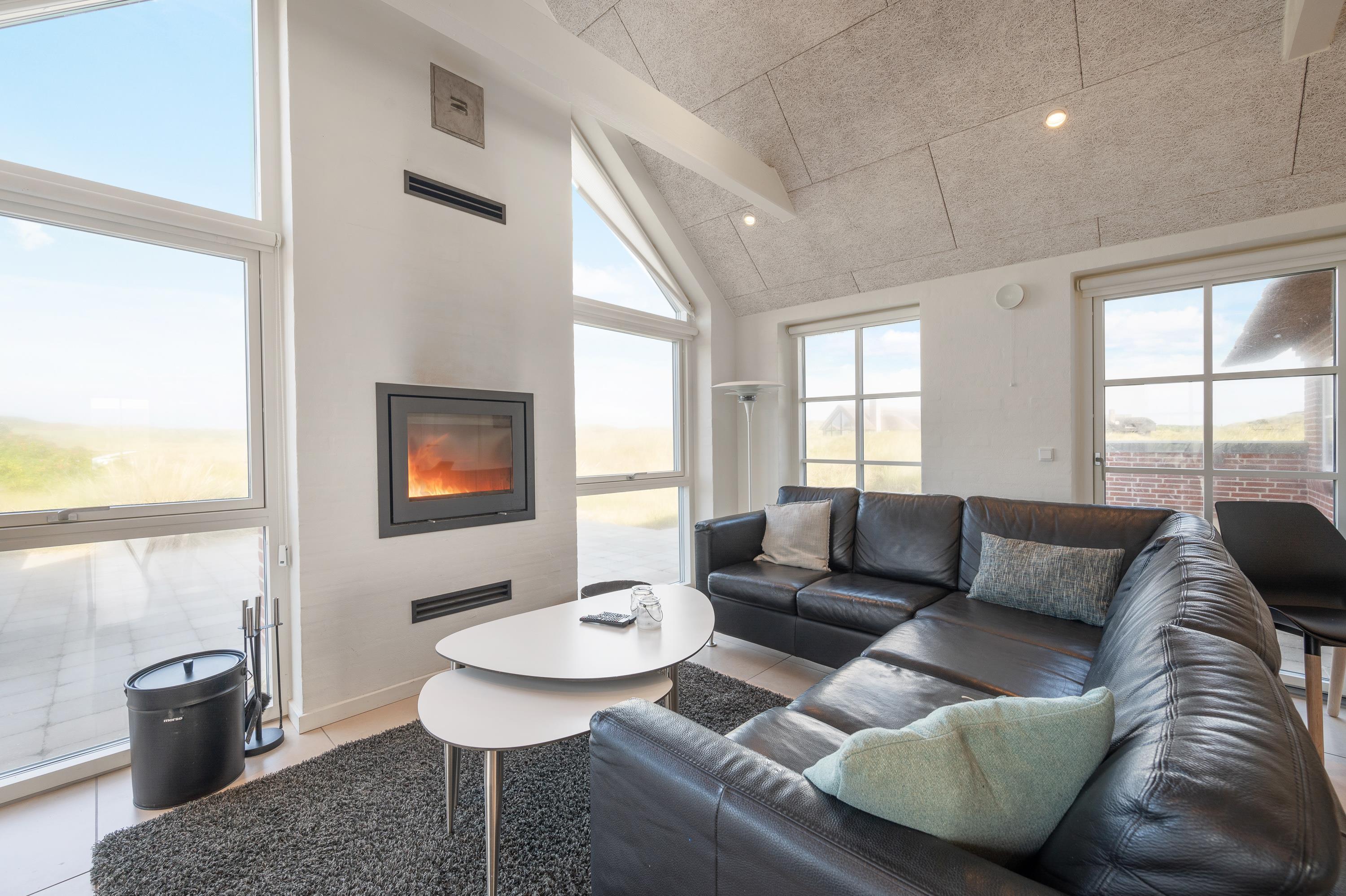 Husets hjerte er uden tvivl det store, lyse alrum med det enestående udsyn mod første klitrække. I stueafdelingen kan I nyde den flotte indbyggede brændeovn, der er et centerpiece i stuen. Den knitrende ild bidrager virkelig til den hyggelige feriestemning. Alrummet er indrettet med smagfulde møbler i sort-hvide nuancer, der giver et eksklusivt og smagfuldt udtryk. I selve stueafdelingen finder I både fladskærms-tv, DVD, radio og CD-afspiller.