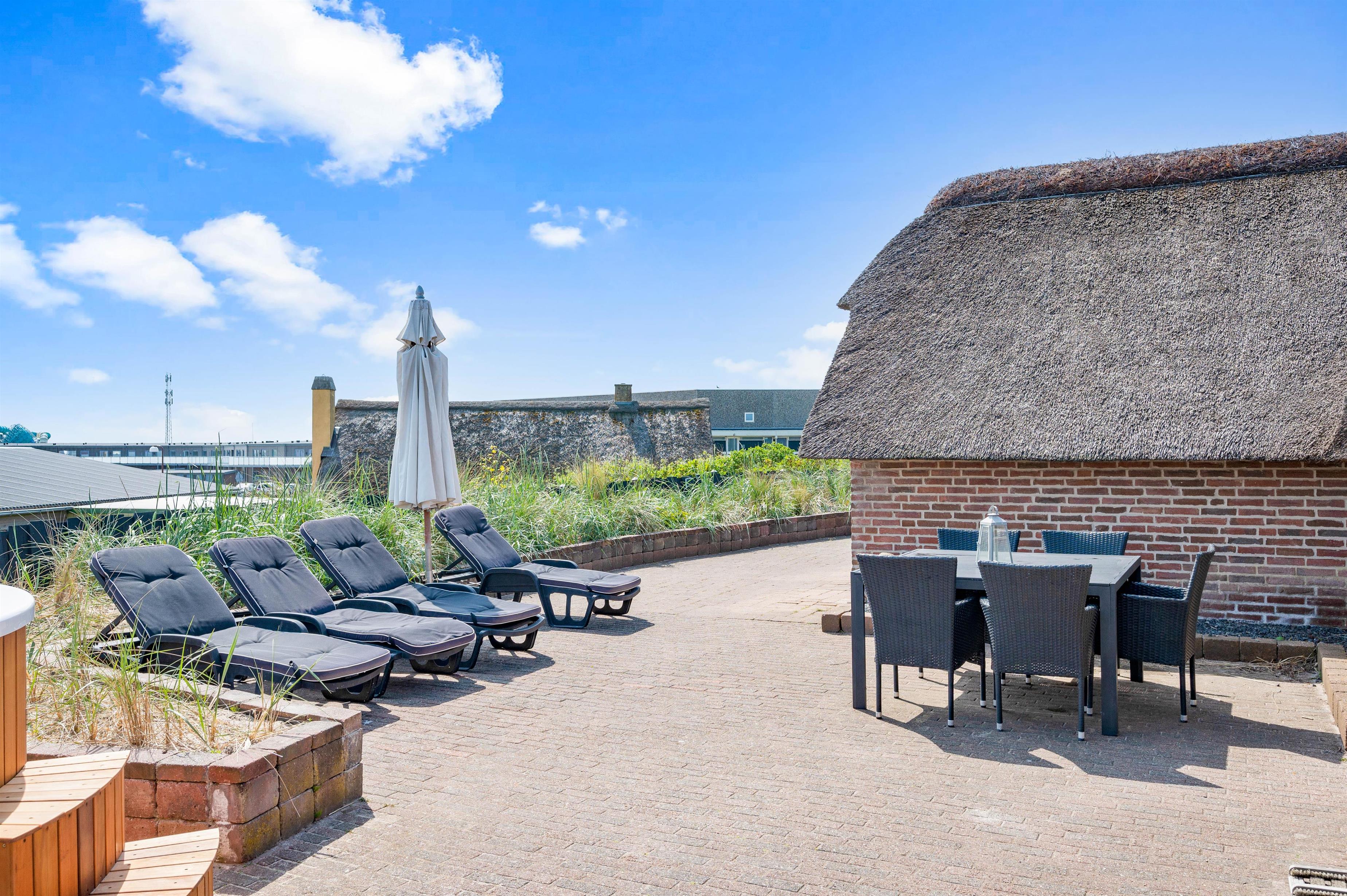 Omkring feriehuset er der flere gode terrasser, hvor I kan tilbringe jeres feriedage. Der står både havemøbler og liggestole på terrassen, som I kan finde jer til rette i, når I skal nyde de varme feriedage i solen. Her finder I også et af husets highlights i form af at saunahus, som er placeret på terrassen.
