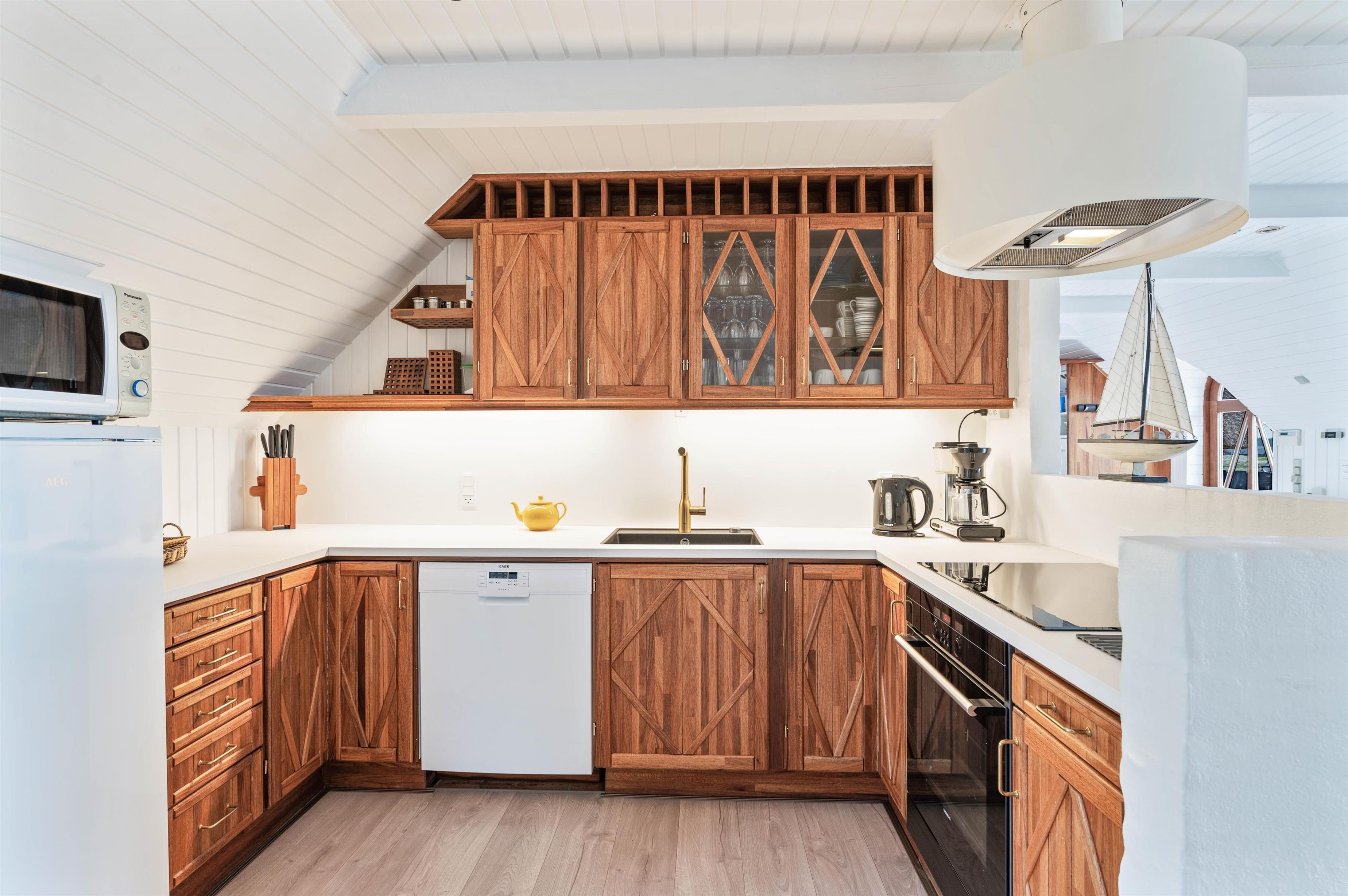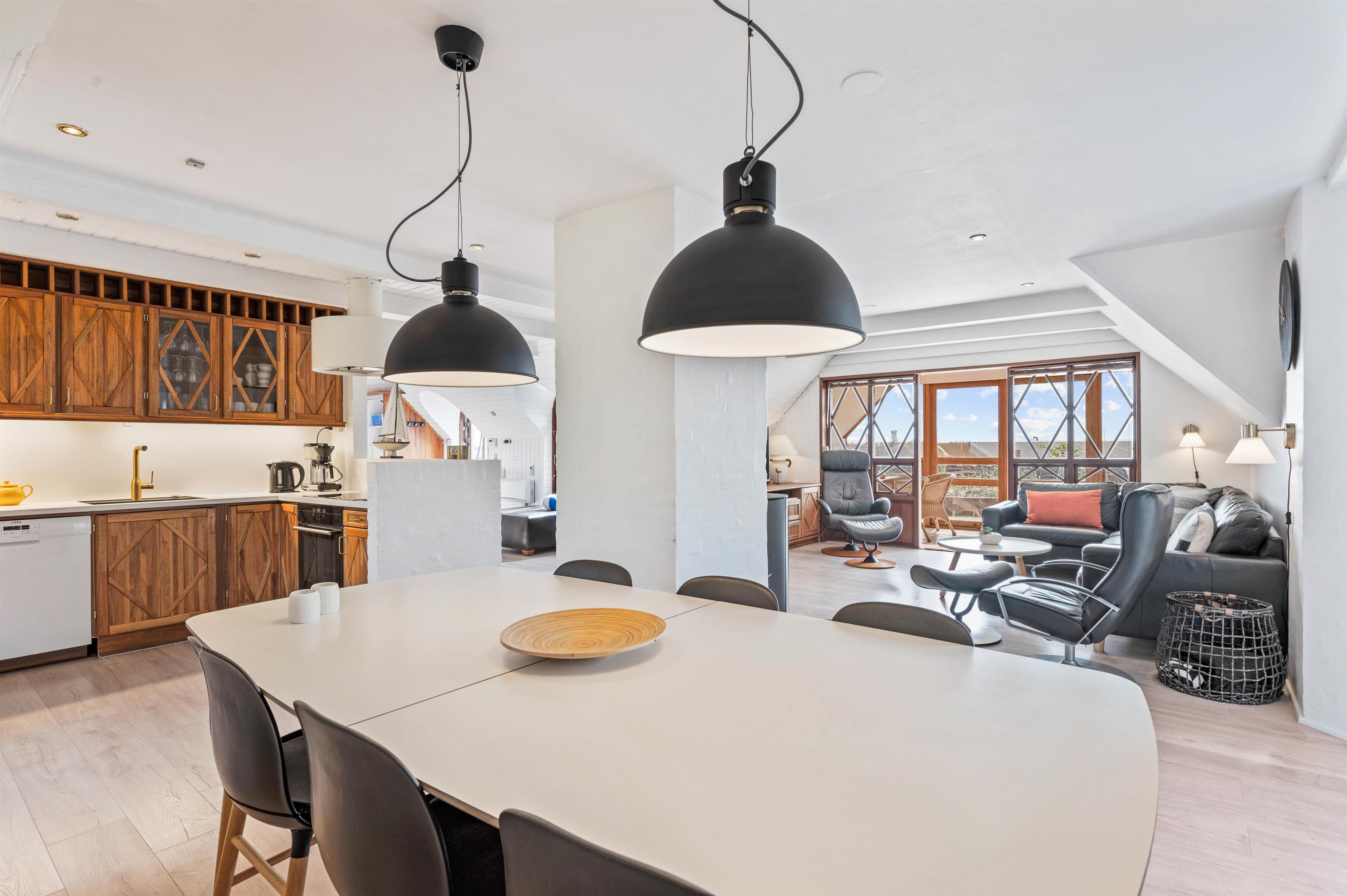 I det store alrum, hvor køkken, spiseplads og stue ligger i åben forbindelse, er rammerne sat for mange skønne feriestunder i godt selskab, hvor brændeovnen spreder dejlig varme og god stemning. Fra alrummet kan I også gå ud i den dejlige udestue, som I kan benytte året rundt.