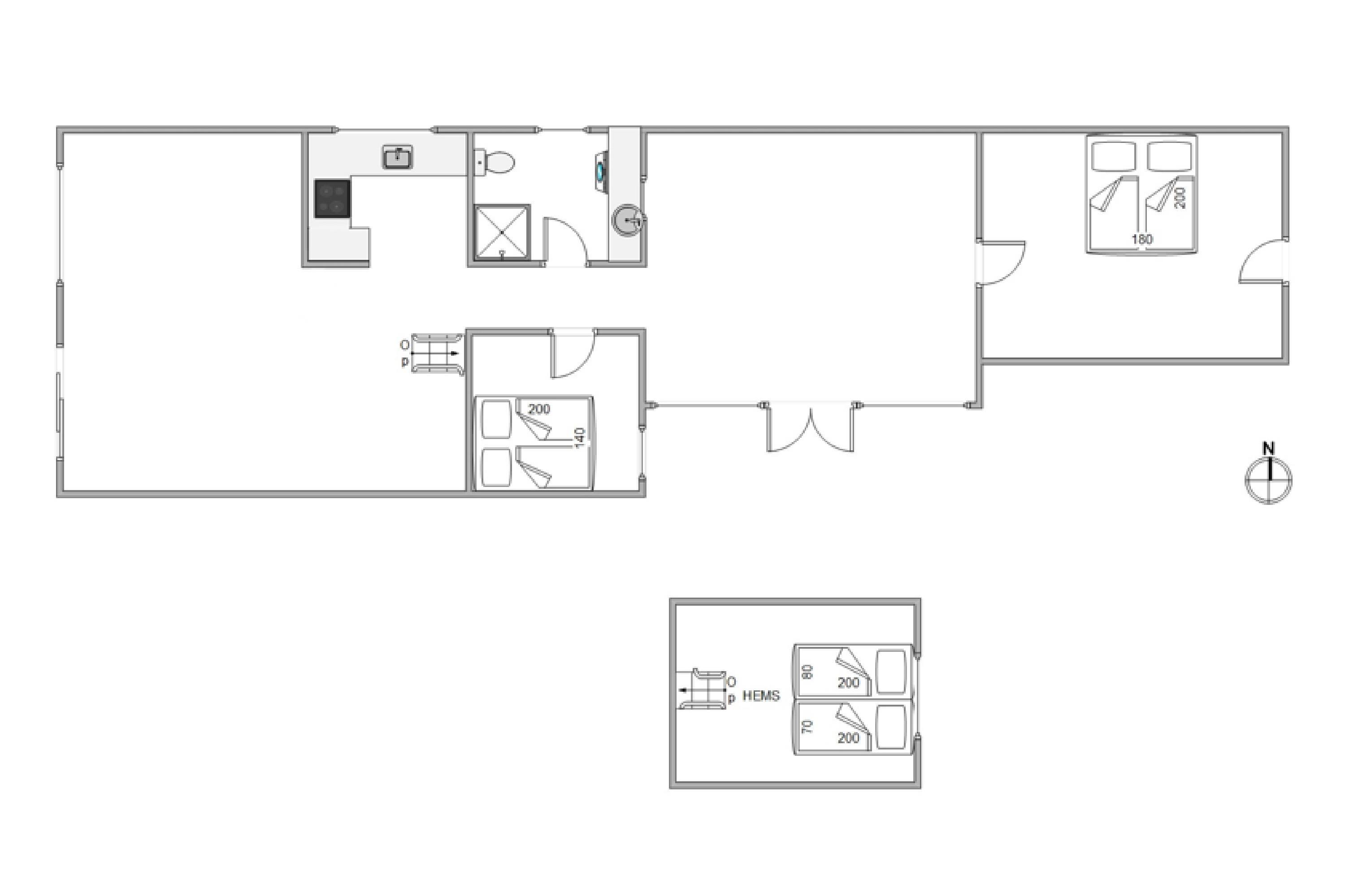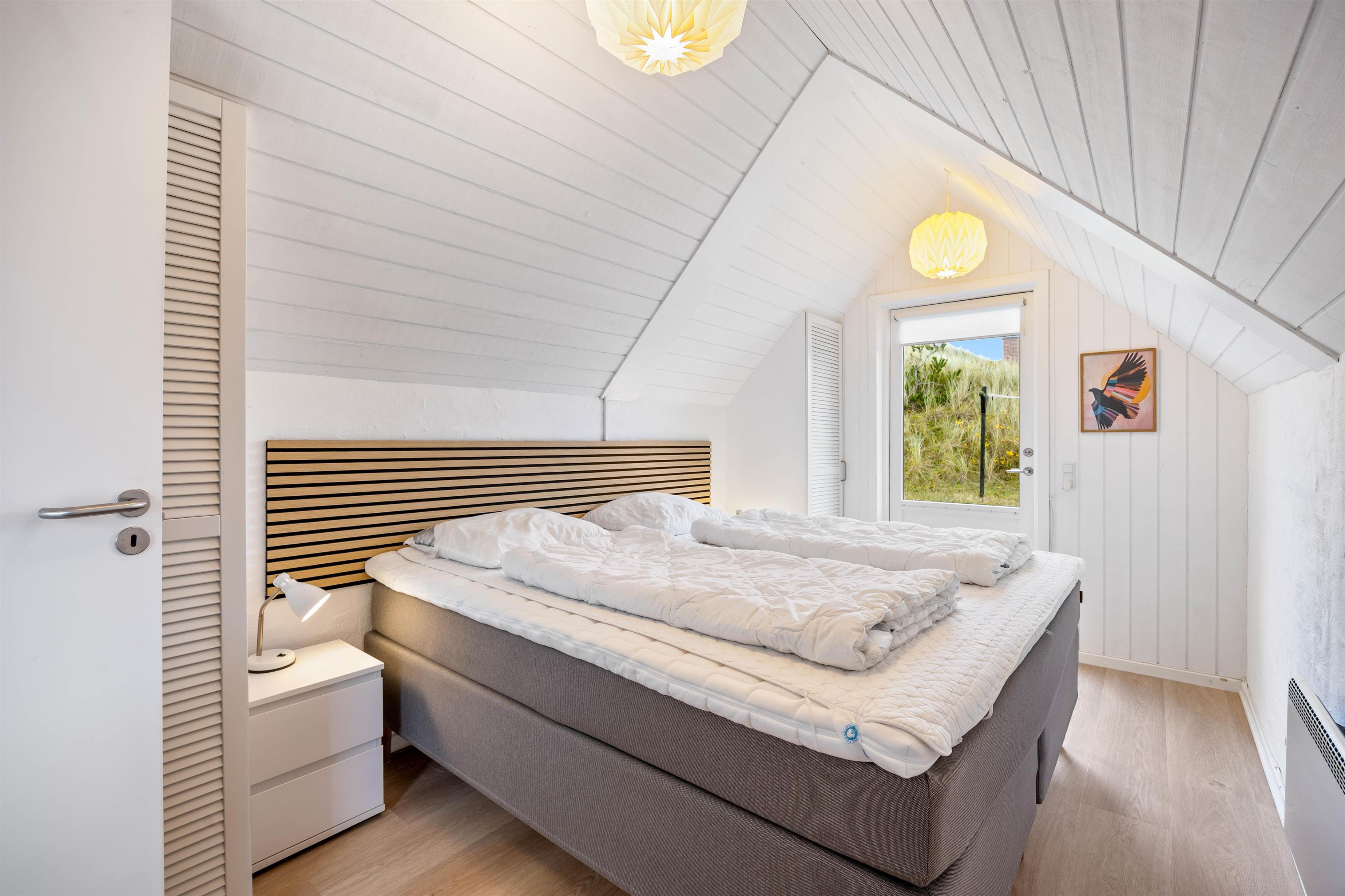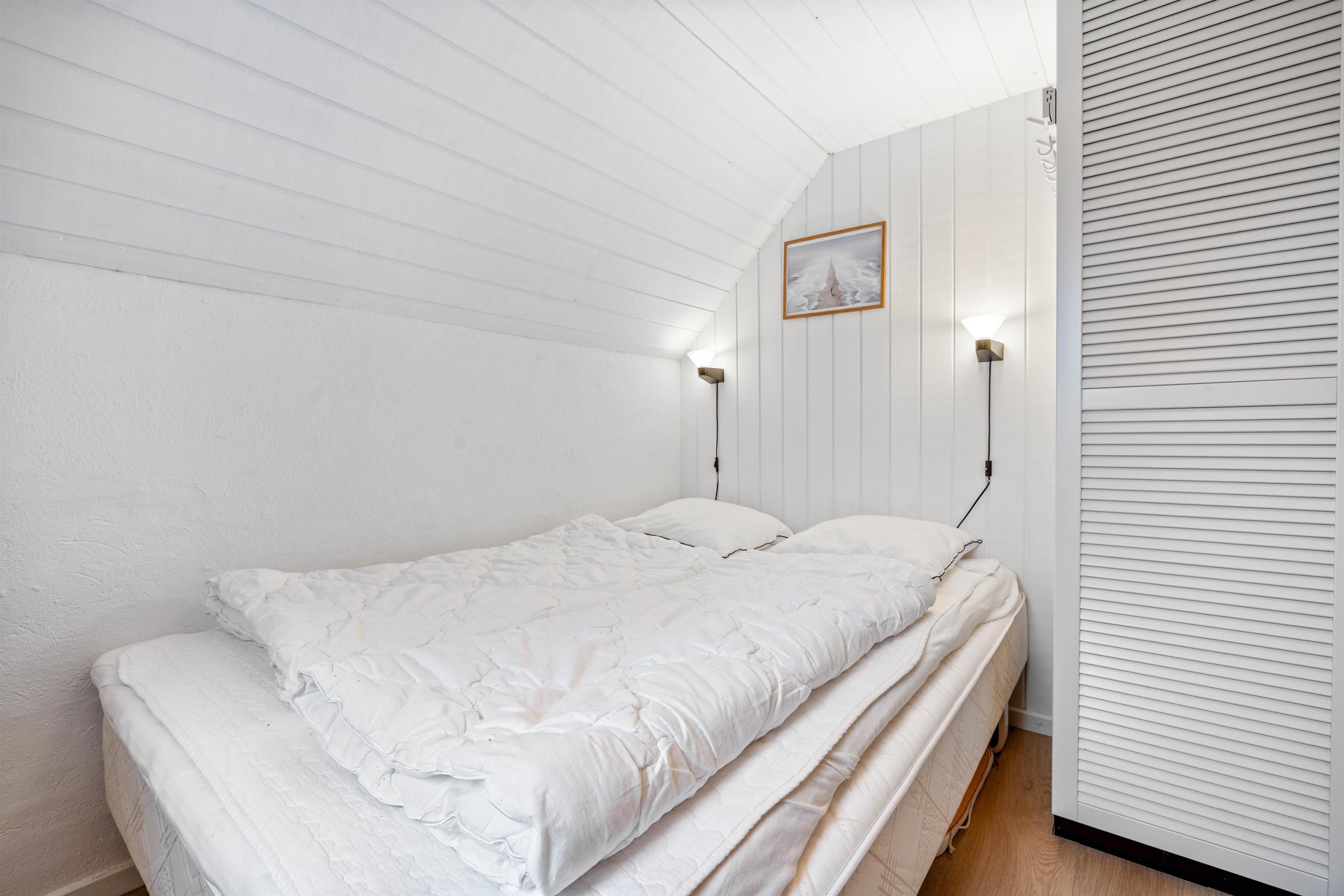 Sommerhuset er indrettet med to gode soveværelser samt en hems med dobbeltseng. I sommerhuset finder I også et lyst og lækkert badeværelse med opvarmet flisegulv.