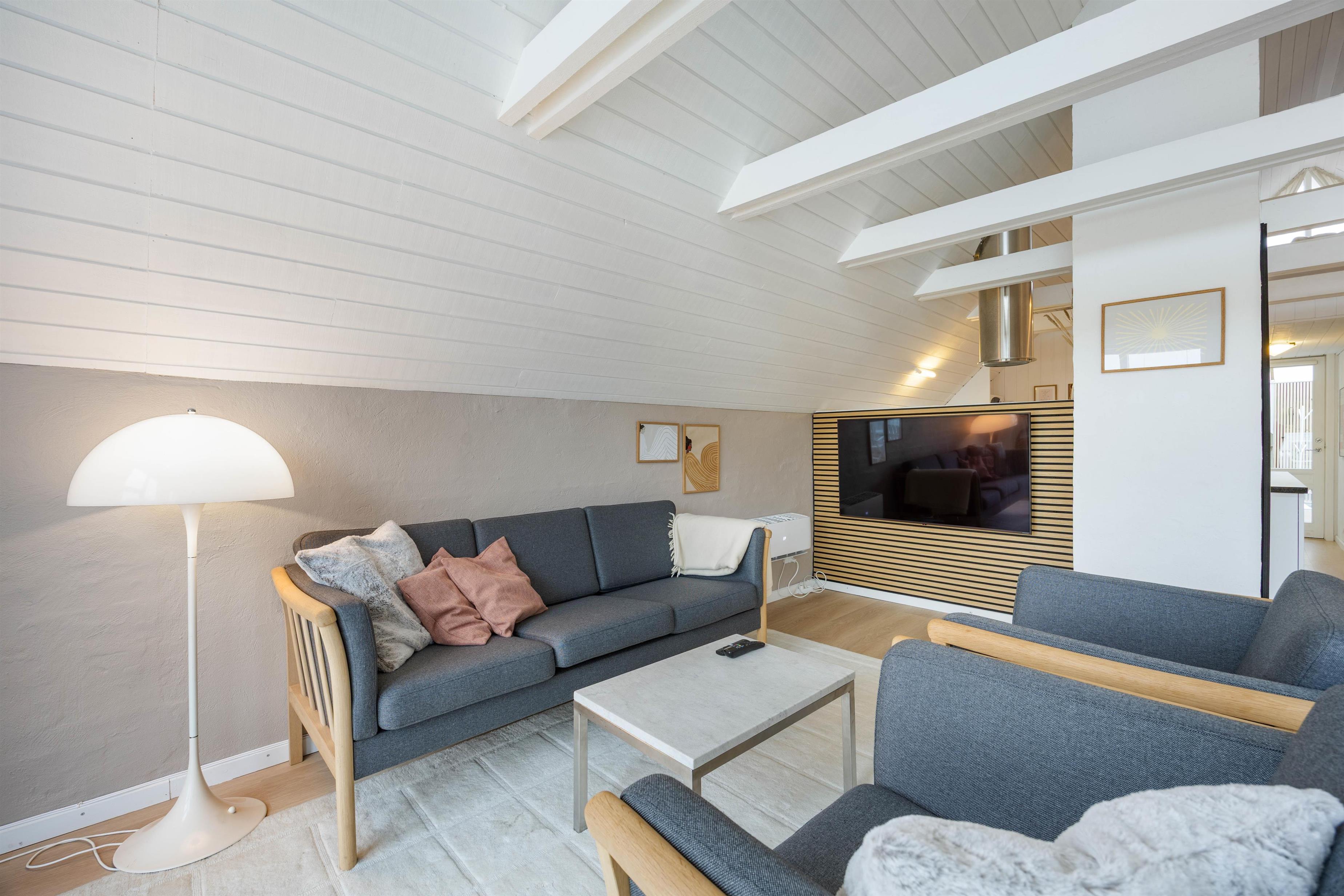 Indretningen gennem hele sommerhuset er lyst og indbydende med et yderst stilfuldt præg. I stuen er der store vinduespartier, der giver et fantastisk lysindfald. Sommerhusets hjerte er det store alrum, hvor loft til kip og den gode indretning tilsammen skaber en hyggelig atmosfære. Det er her hele familien samles og kan nyde kvalitetstid over et spil brætspil.