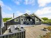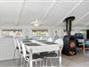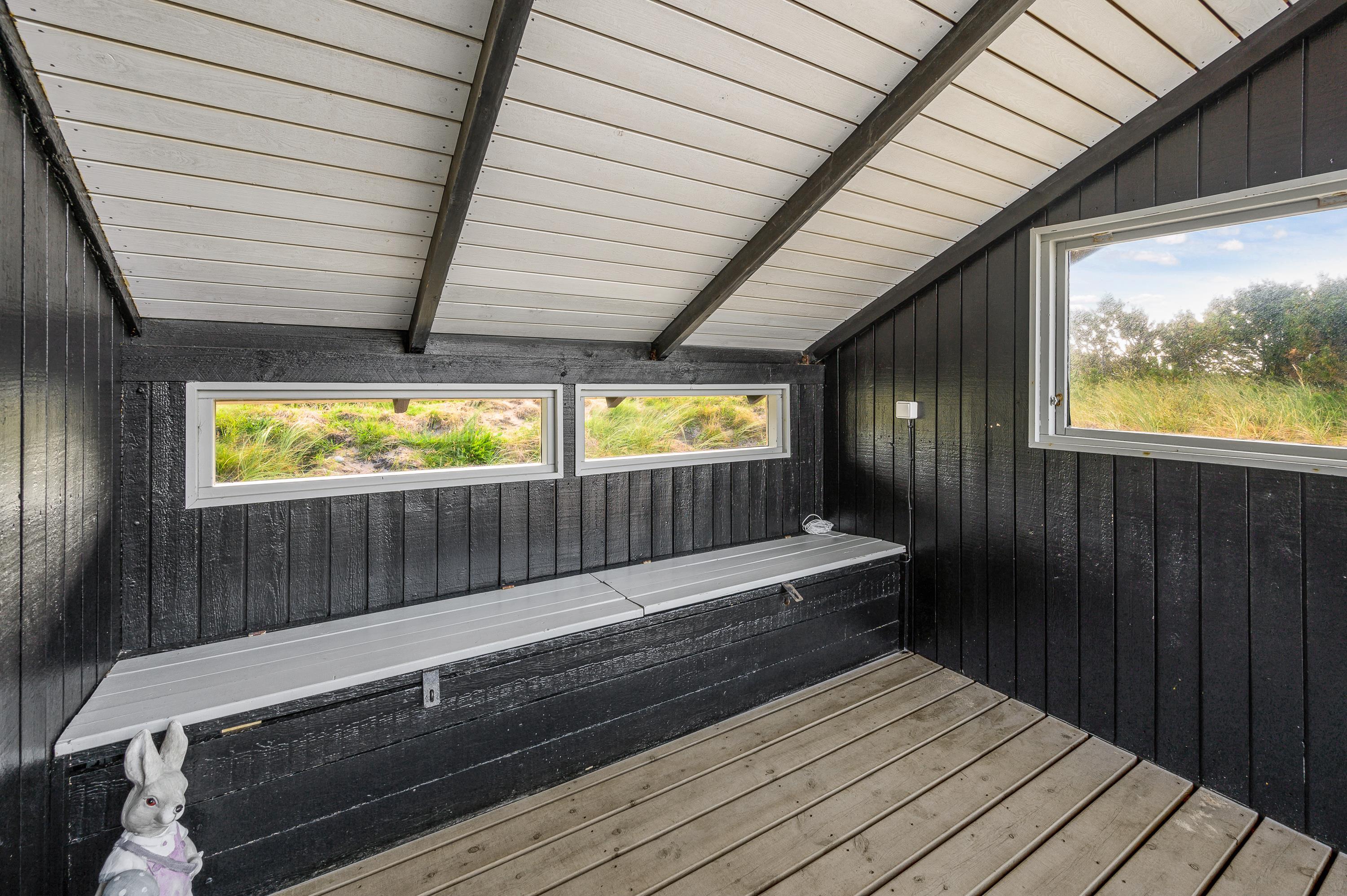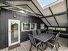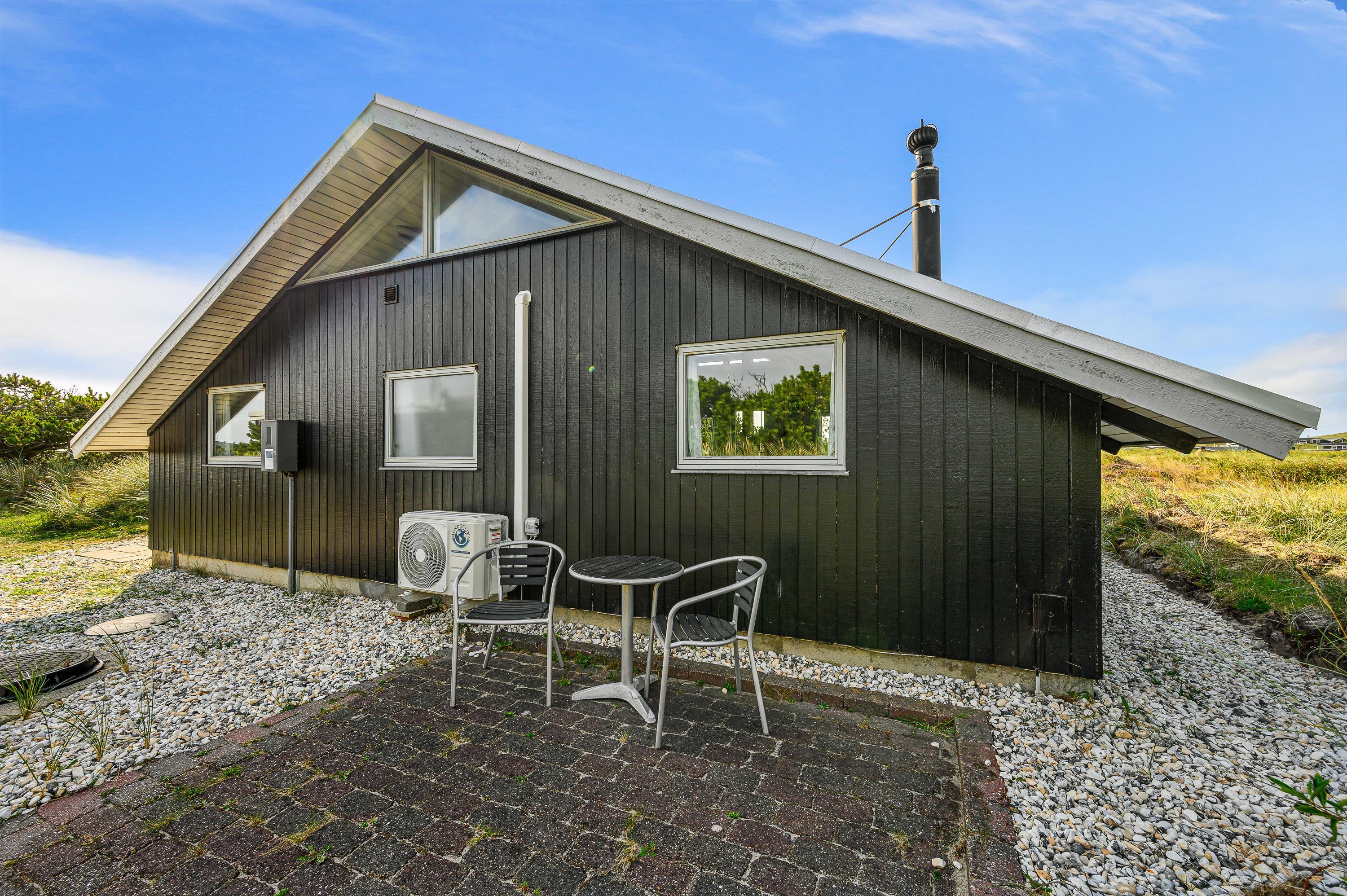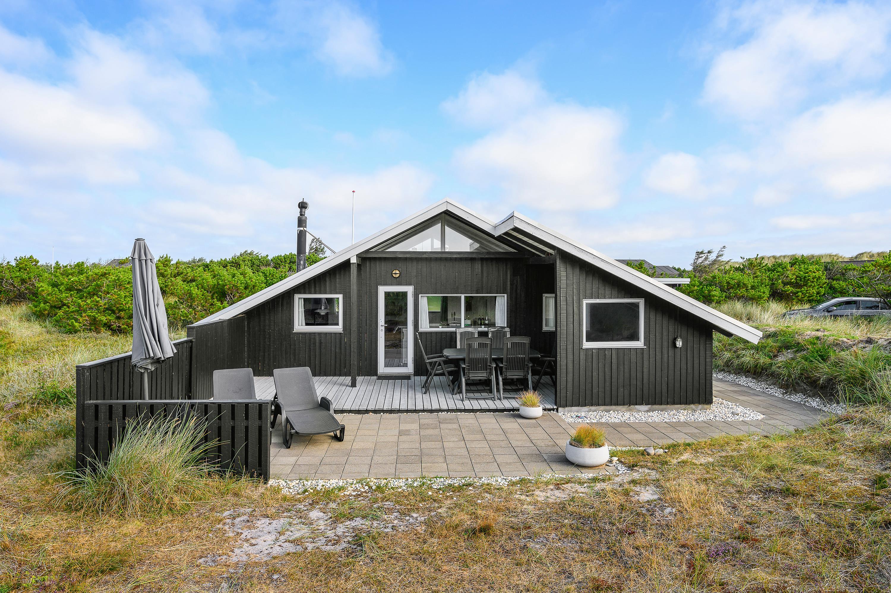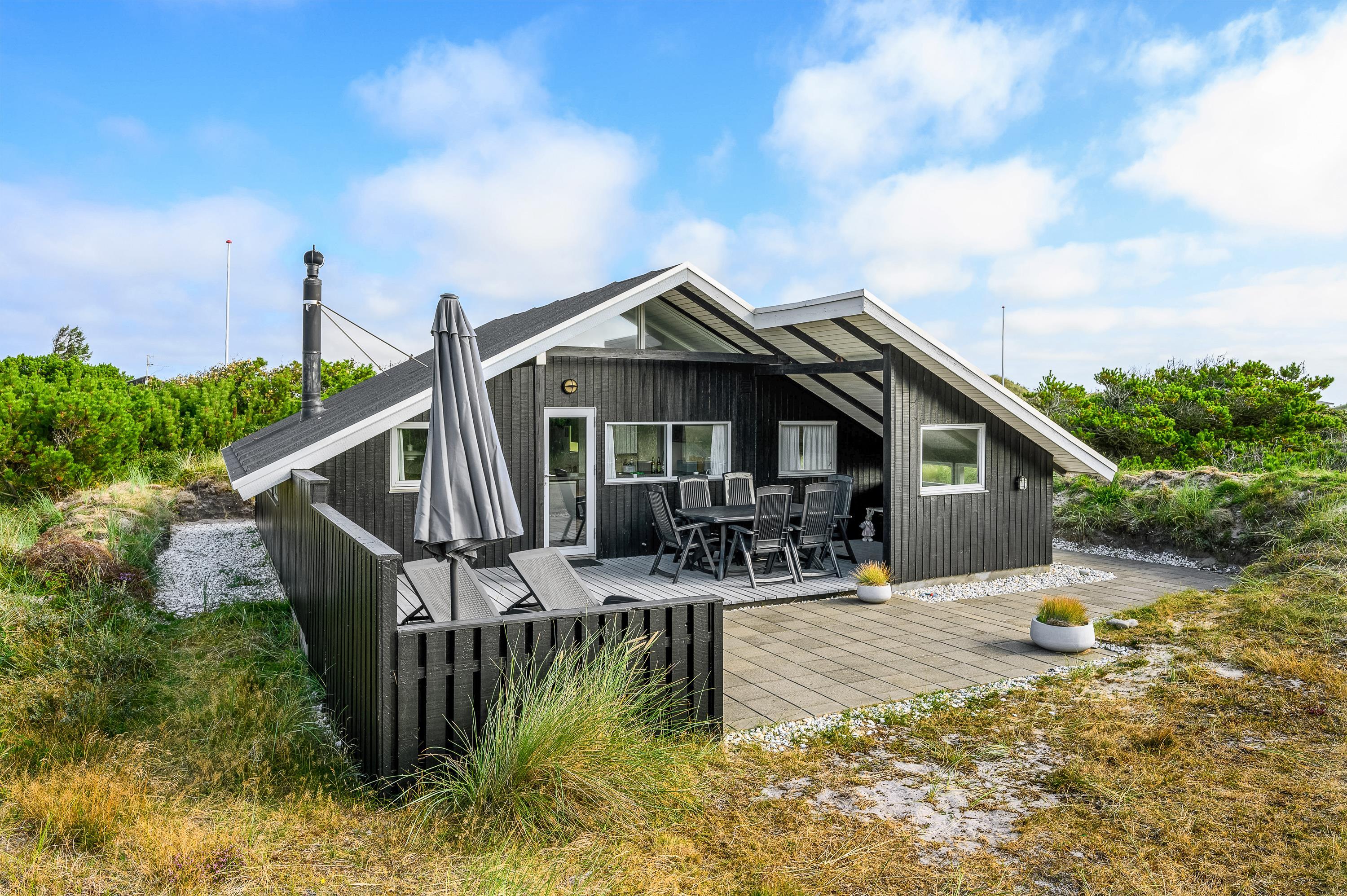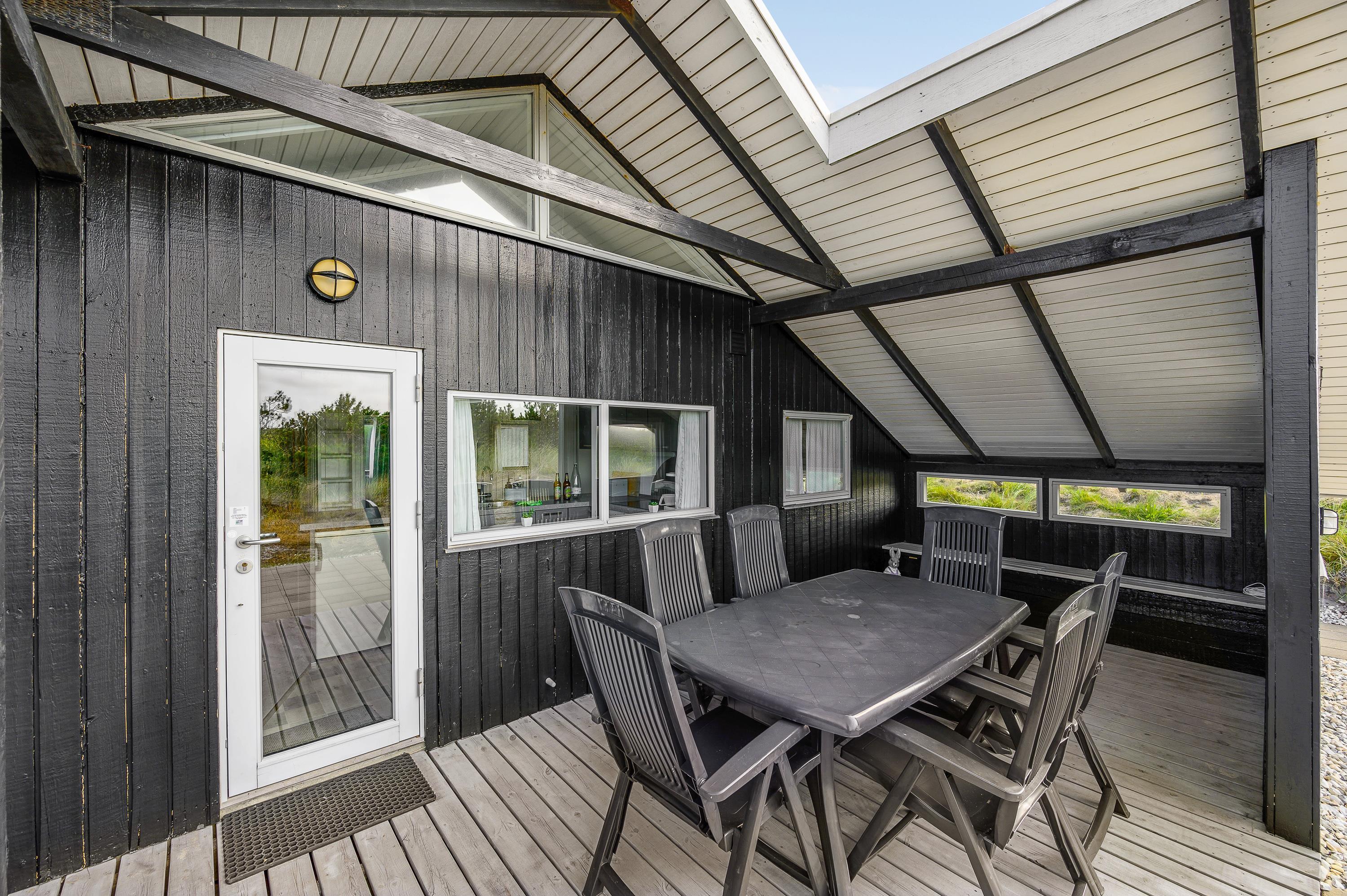 Gennem terrassedøren kommer man ud til den delvist overdækkede og afskærmede terrasse. Da sommerhuset er placeret på en 2800 kvadratmeter stor naturgrund, sidder I her ugenert og kan I nyde jeres aftensmad med udsigt over klitterne. På Holmsborgvej 70 er der altså hele året rundt tid til afslapning og hygge, om det er inden- eller udendørs. Den store grund byder også op til leg for børn, da de her kan udforske grunden, og måske lege noget gemmeleg?