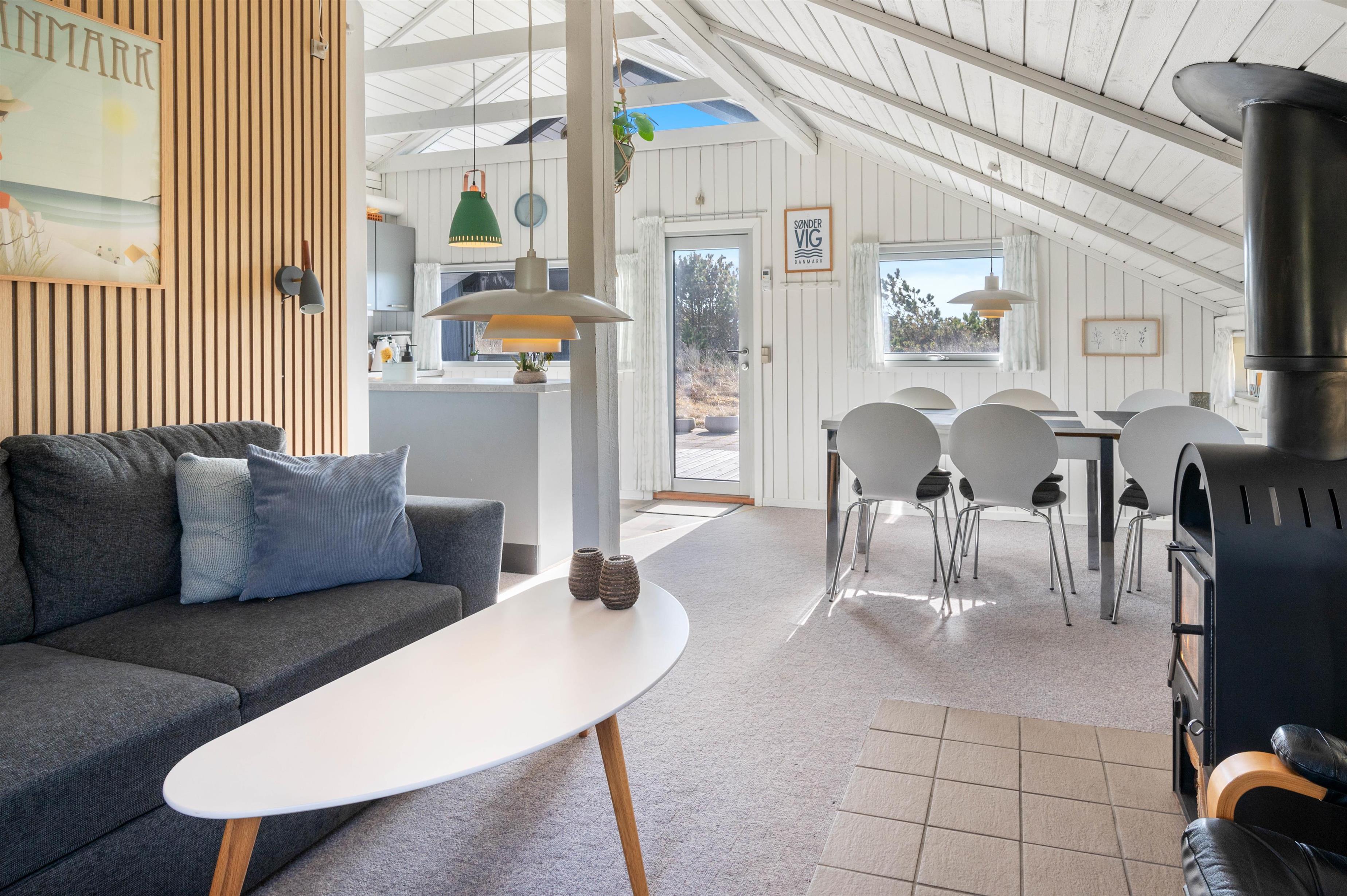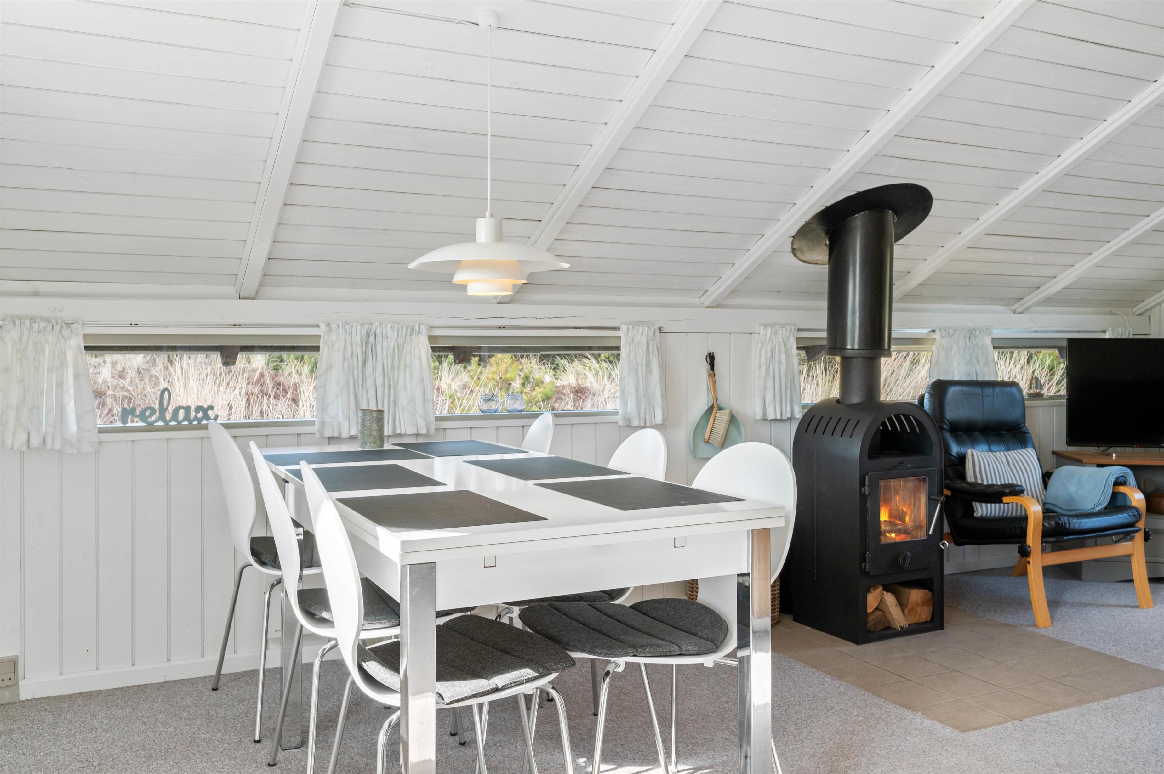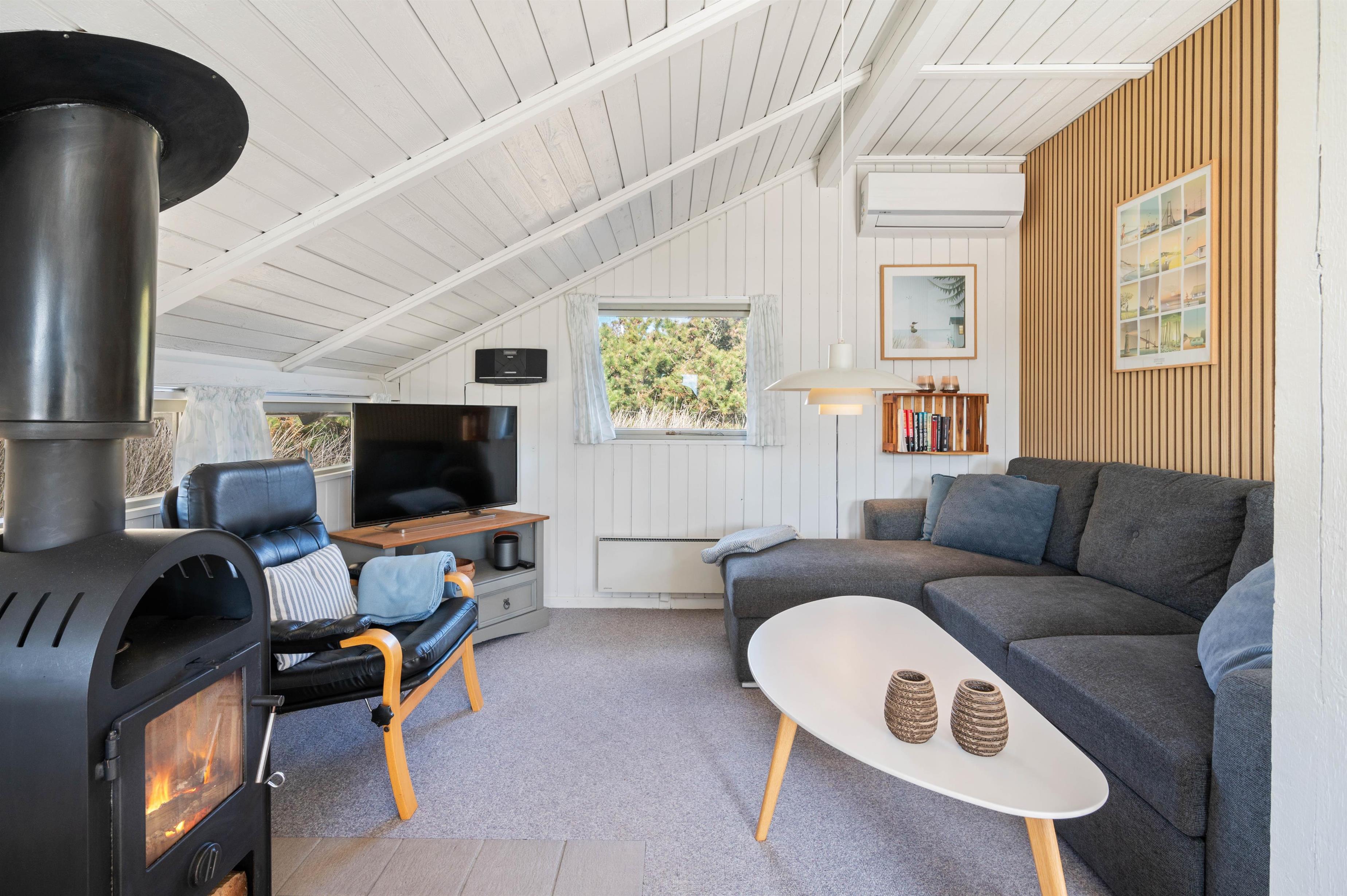 Sommerhuset skaber med sine fine originale træbjælker en klassisk skøn feriestemning, der topper i stuen med brændeovn, fjernsyn og den store hjørnesofa. Her er rammerne sat for hyggelige, lune aftener med god underholdning og sommerhushygge. For at toppe den hyggelige stemning, skal I tænde op i den dejlige brændeovn. Den er altid garant for at sprede en masse hygge og varme.