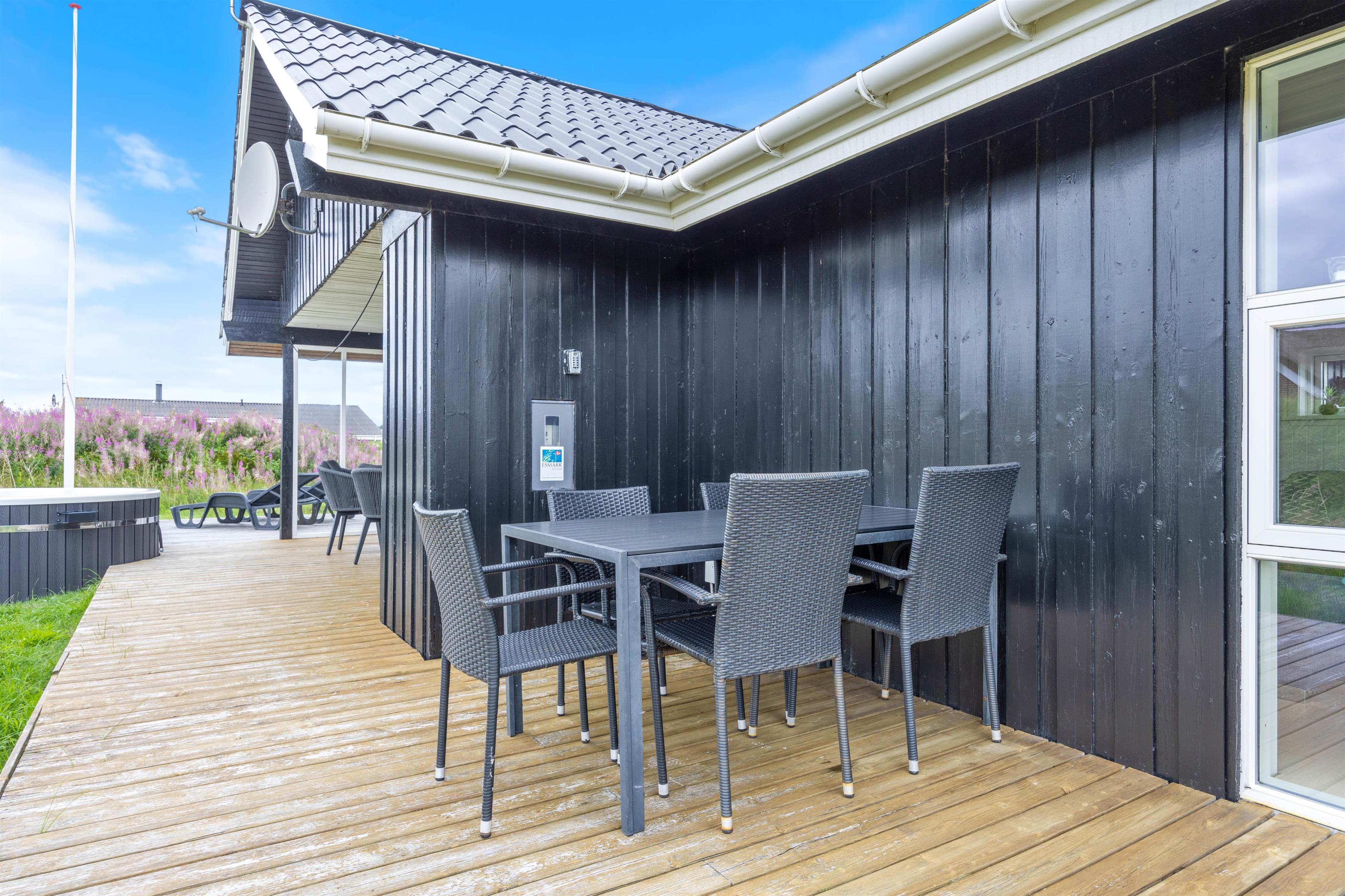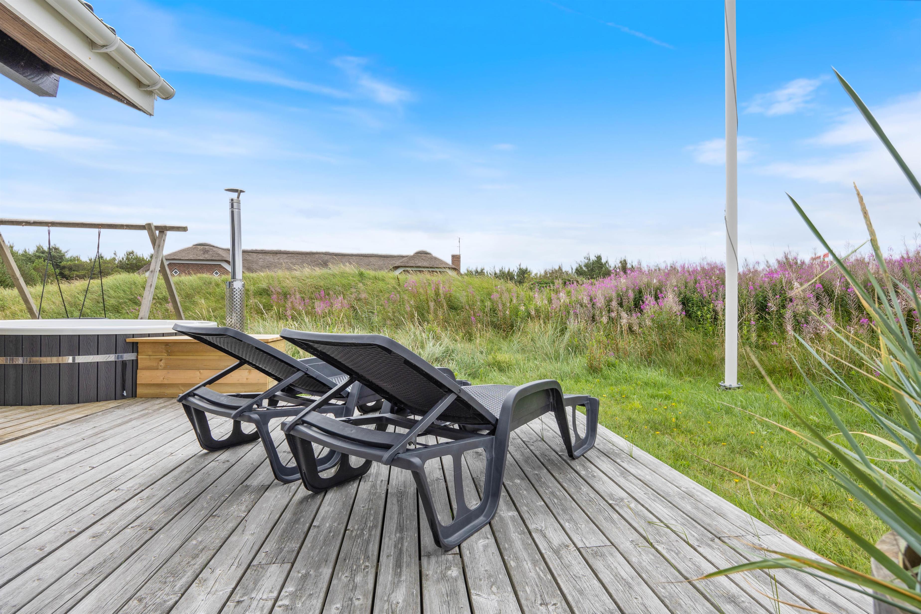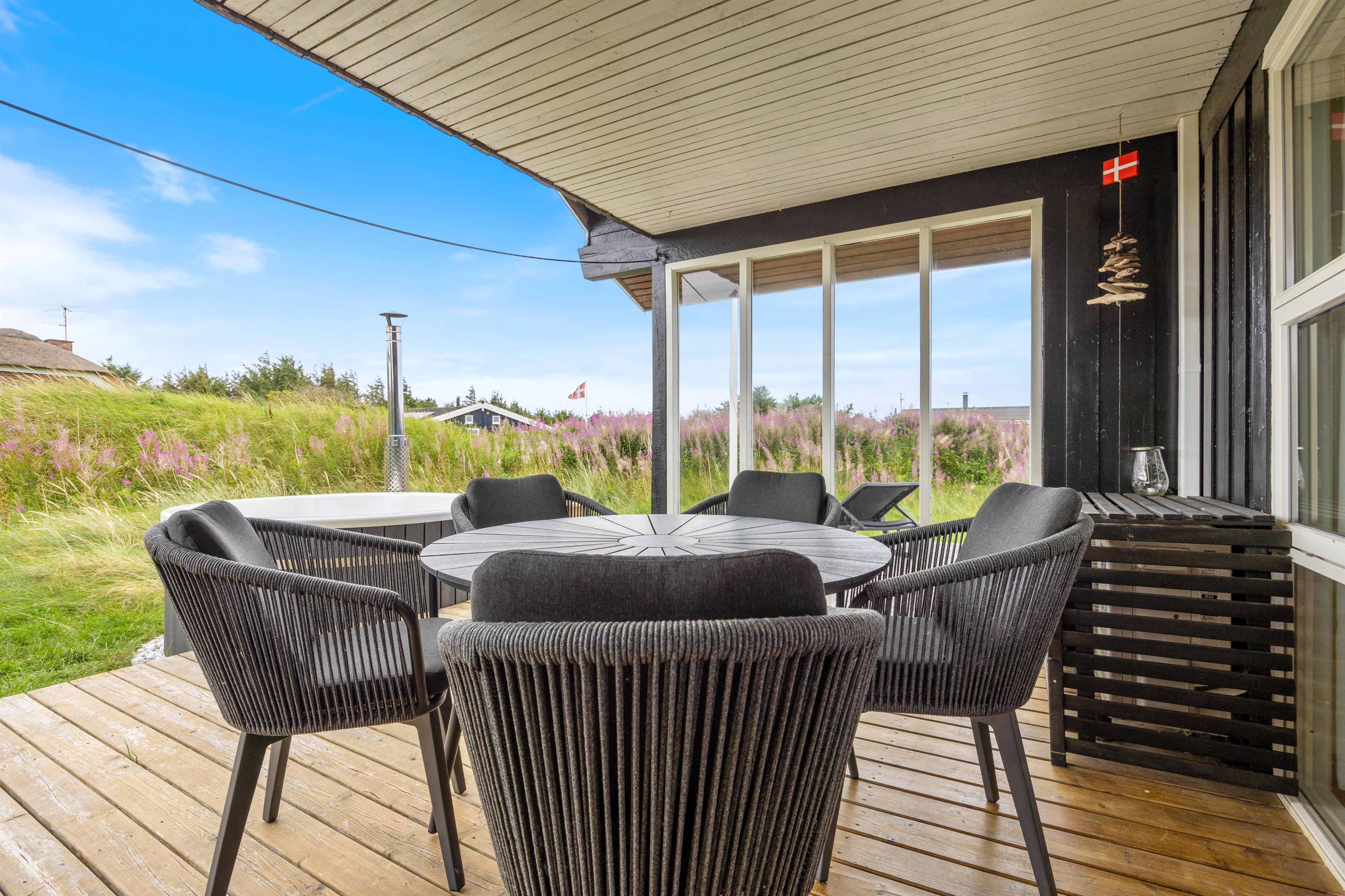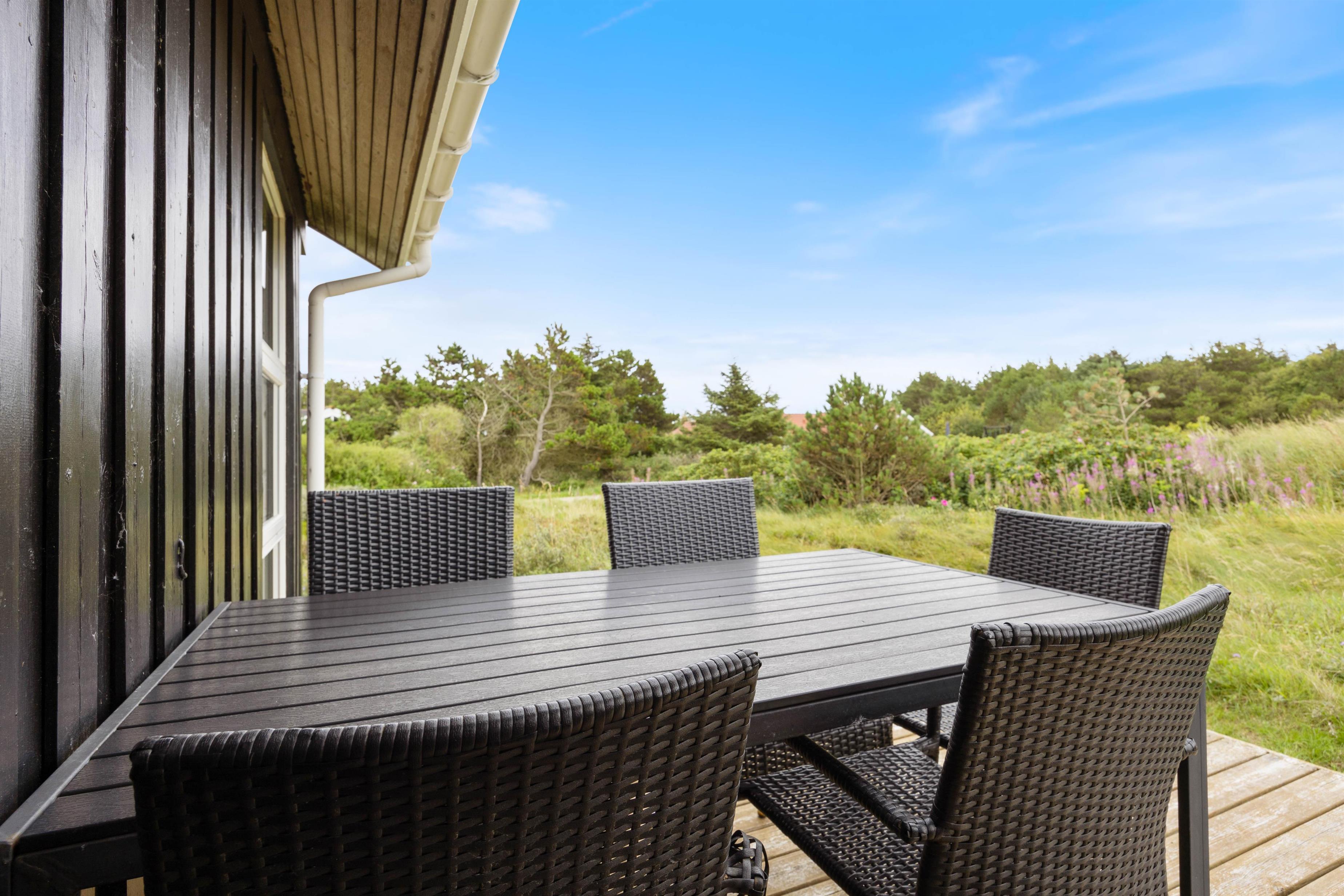 Feriehuset ligger på en dejlig naturgrund omgivet af smuk marehalm og planter. Fra spiseafdelingen er der direkte udgang til den overdækkede del af terrassen. Her er der gjort klar med havemøbler og grill, så I kan hygge jer med grillaftener, saftige bøffer og rødvin. Den omkringliggende terrasse, byder på mange hyggelige kroge, hvor I kan hygge jer med en god bog i hånden.