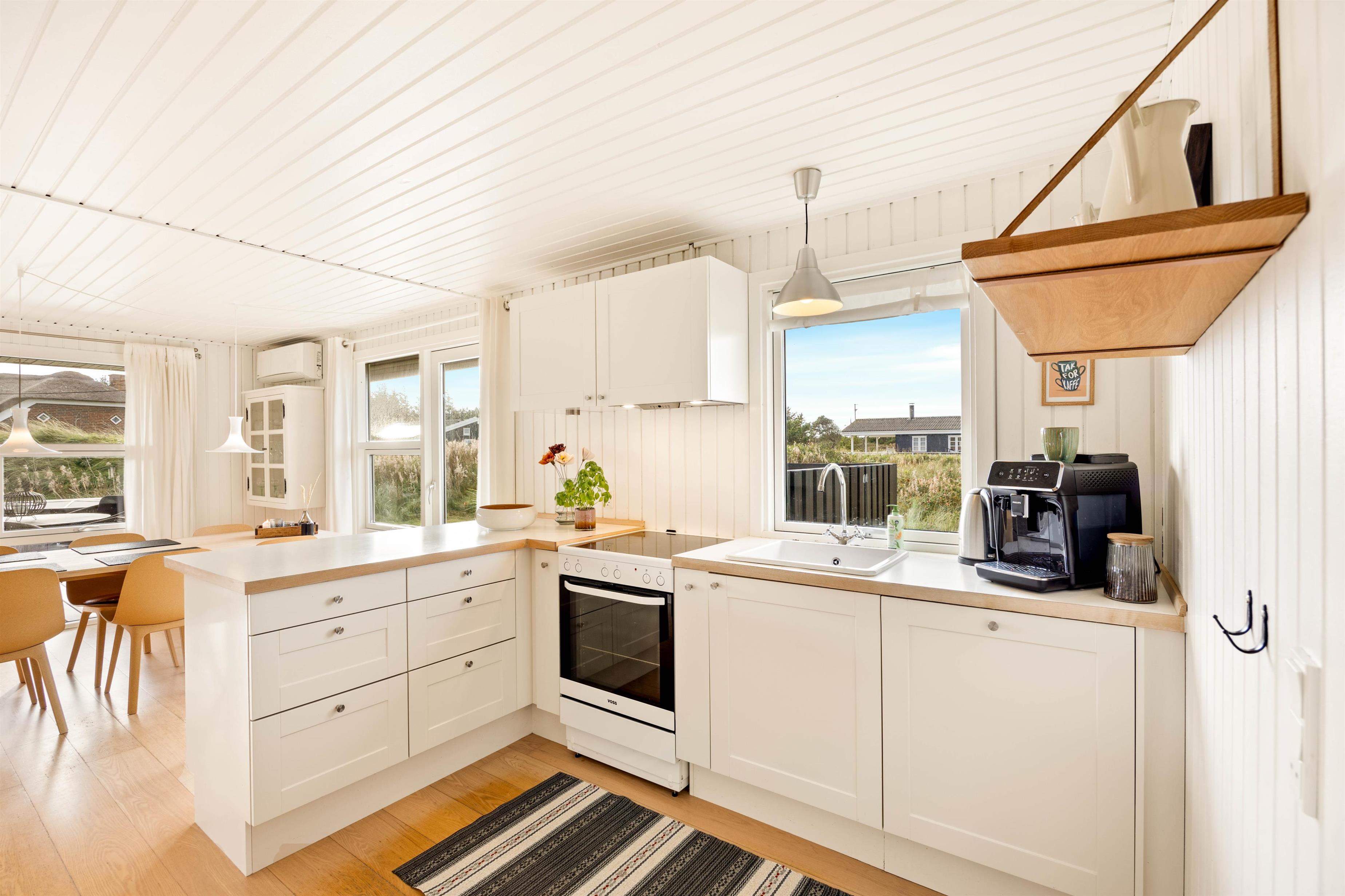 Køkkenet og spisekrogen er samlet i ét opholdsrum, og I er derfor aldrig langt fra hinanden og kan derfor have gang i forskellige projekter i hver jeres afdeling. Det flotte og veludstyrede køkken har blandt andet opvaskemaskine og køleskab med 40 liters fryser, og er generelt udstyret med alt, hvad I har brug for til at tilberede jeres yndlingsmåltider.