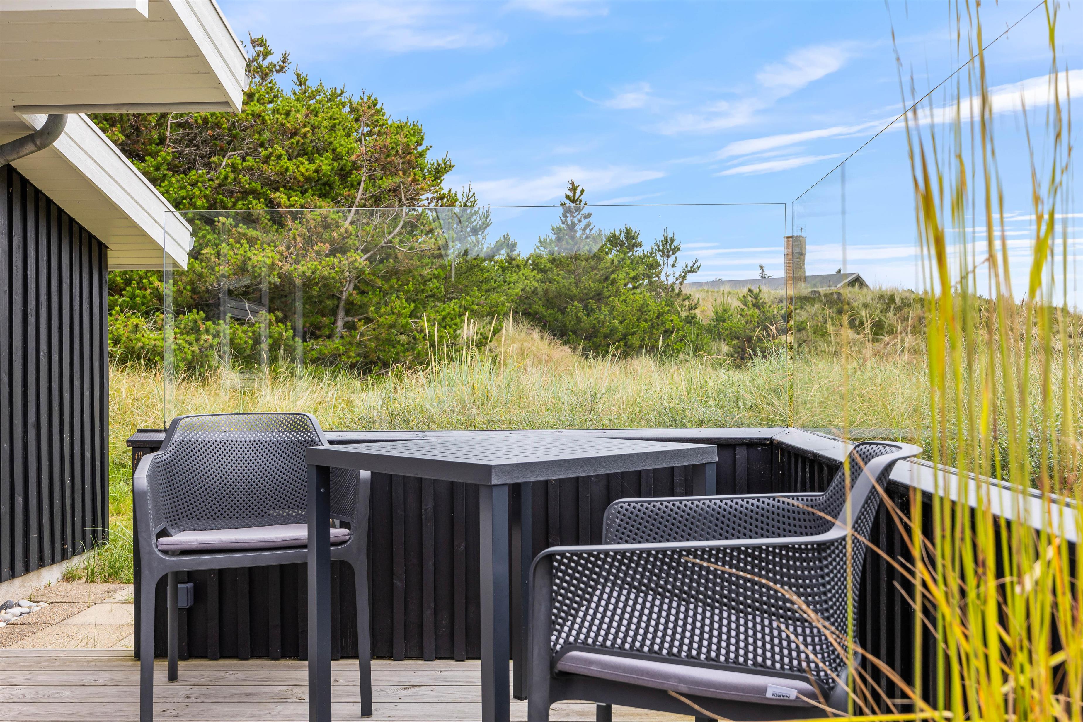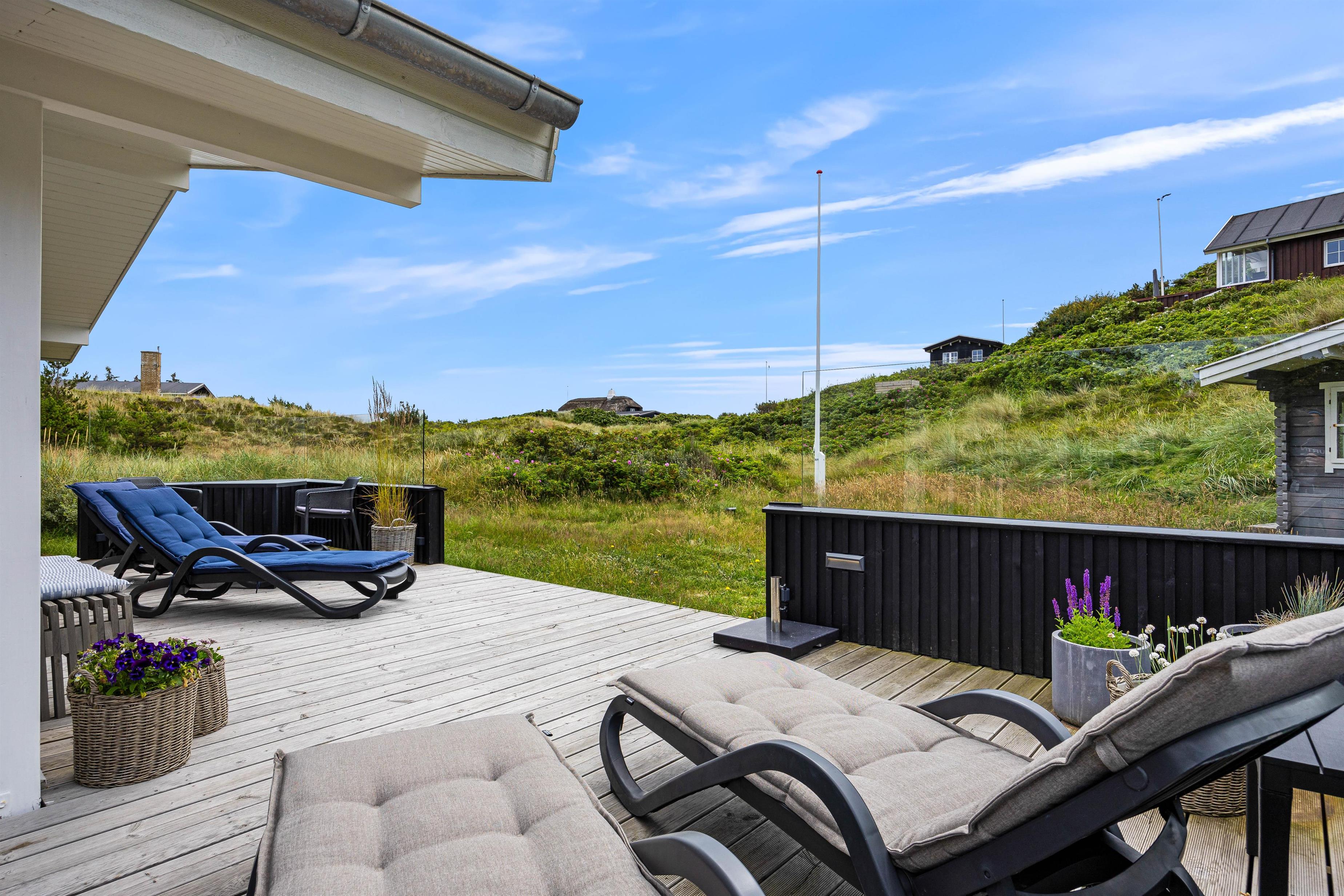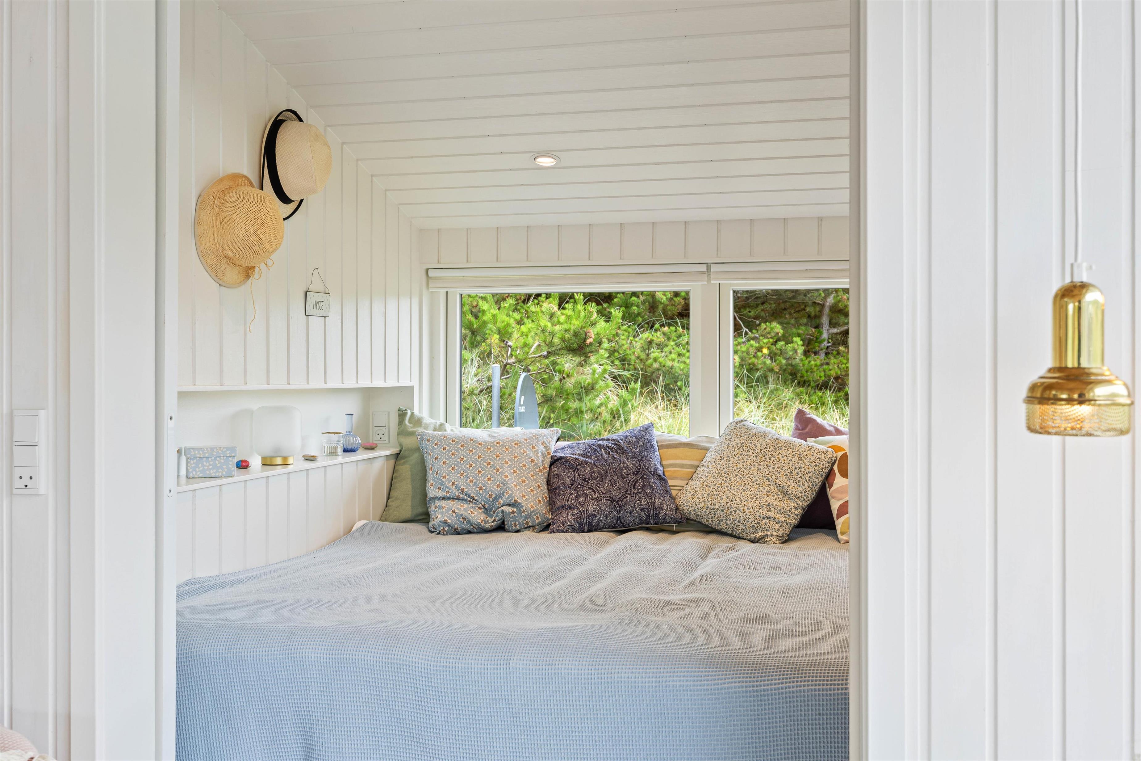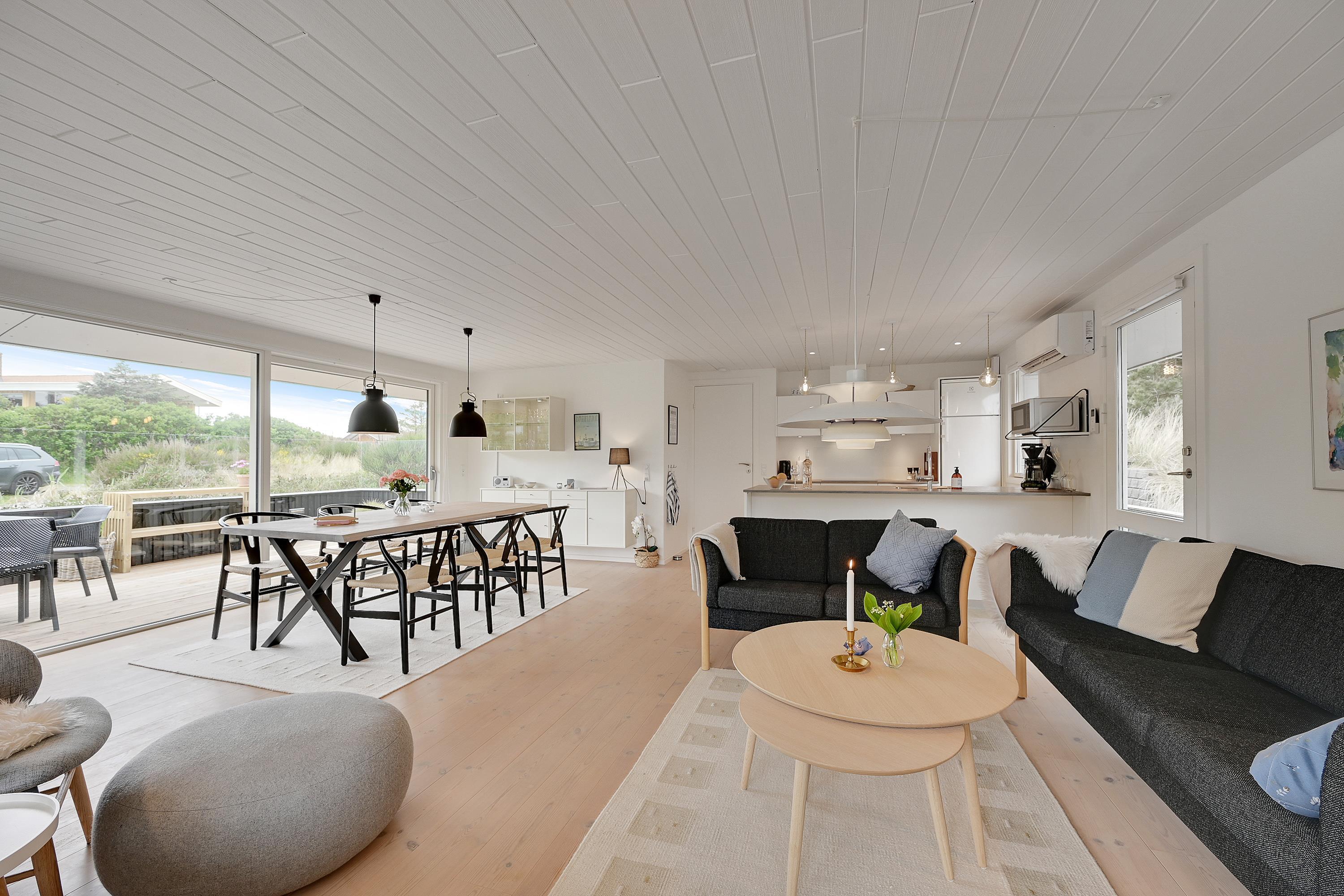 Fra stuen kommer I ind i sommerhusets udestue, som med sikkerhed vil sende feriestemningen helt i top. Fra udestuen har I udsigt ud over det smukke klitlandskab, og selv i regn og blæst kan I nyde den vestjyske natur over en varm kop kaffe, måske med lidt lækkerier fra Søndervigs lokale bager ved siden af.