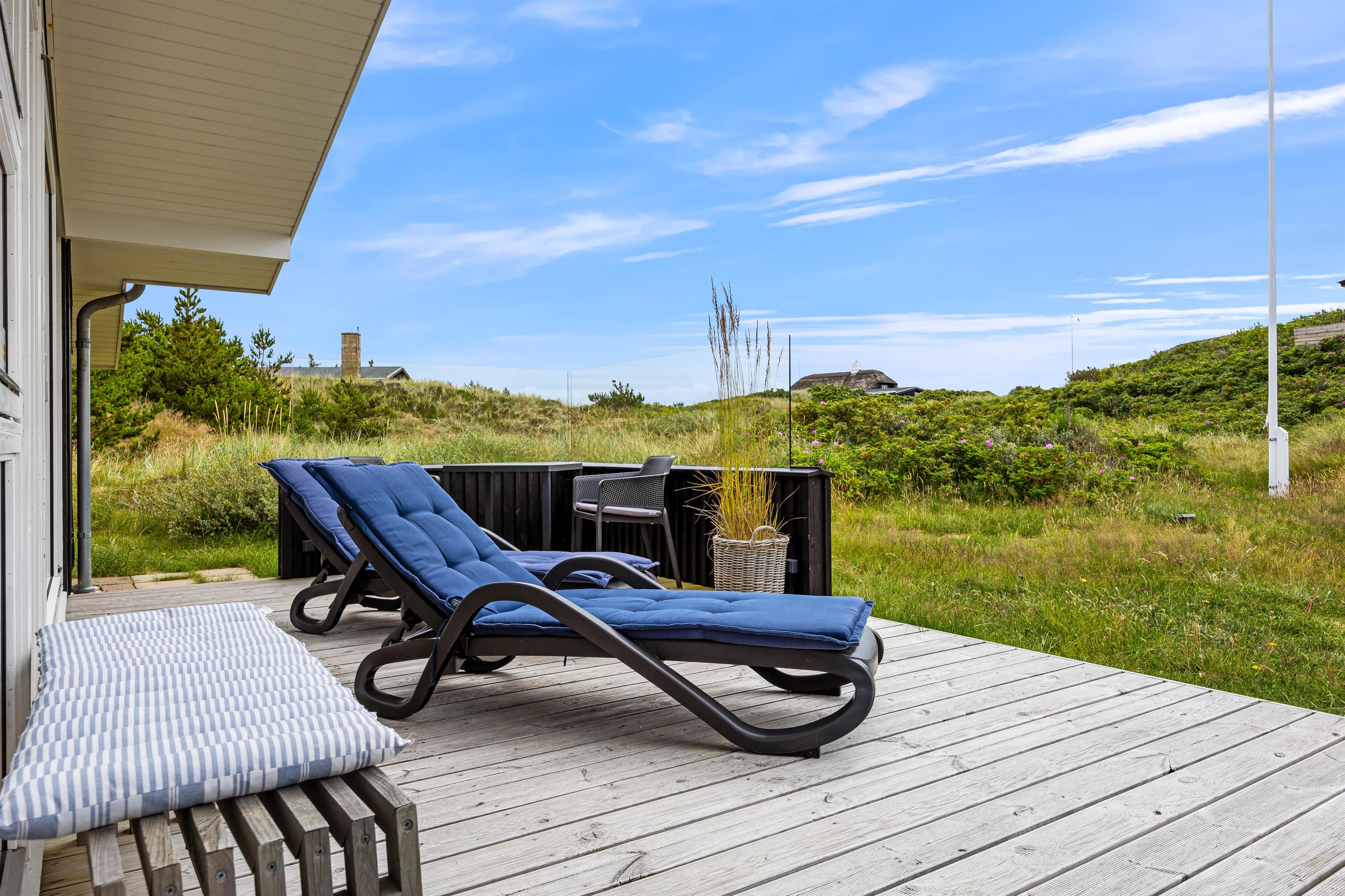 Terrassen har både en åben del og en afskærmet del mod vest, så i kan sidde i sol og samtidig have læ. Morgenkaffen nydes bedst på den syg-østvendte terrasse, hvor der er morgensol og dejlig læ. Havemøbler, liggestole og grill står til fri afbenyttelse, så sommerdagene kan nydes i fulde drag.