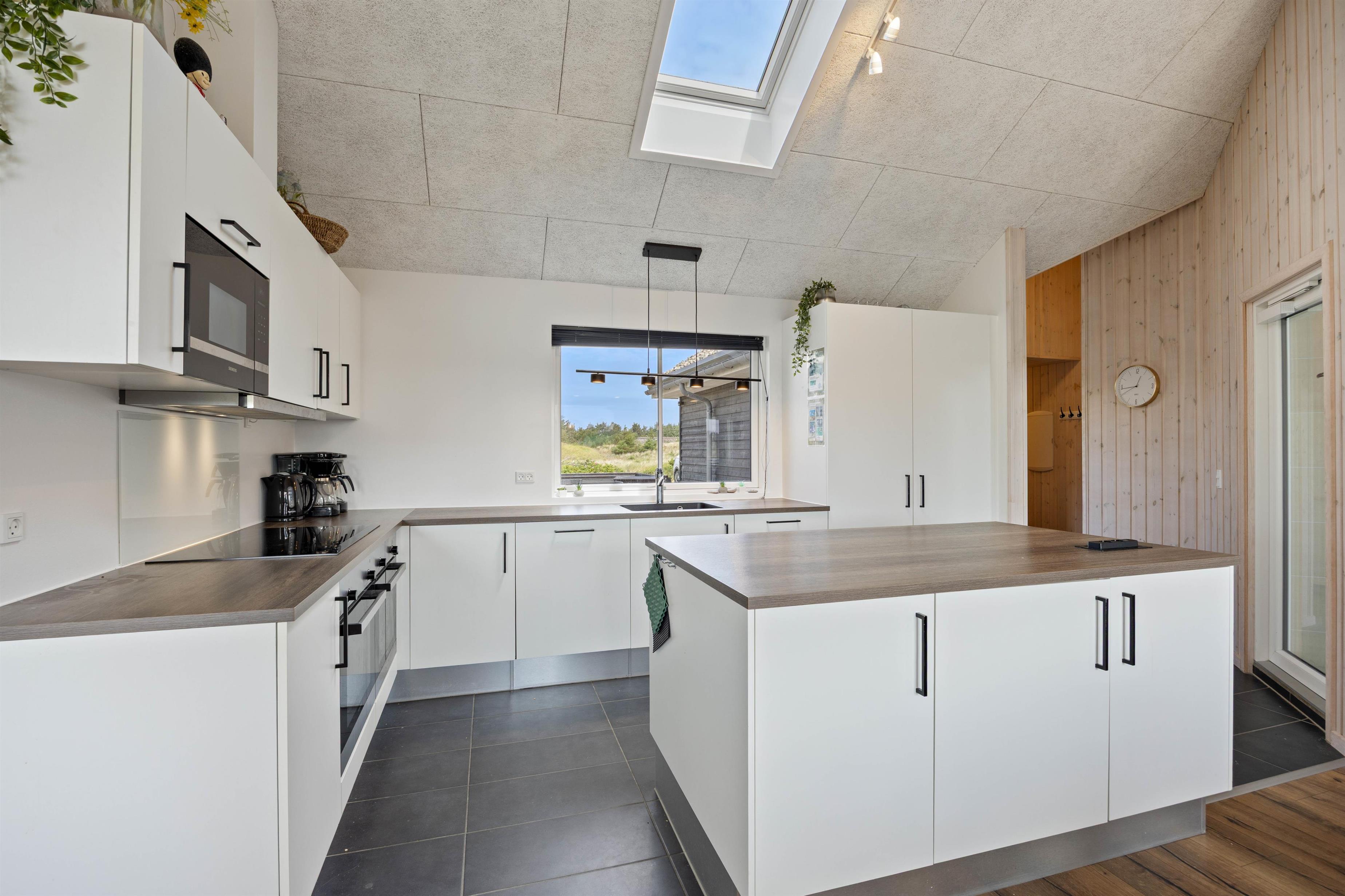 Sommerhuset har i alt 7 soverum og en god hems med 4 sovepladser, hvilket giver plads til op til 18 personer og 2 husdyr. Her er der tænkt på enhver detalje for, at sommerhusets gæster kan nyde en så bekvem og afslappende ferie som overhovedet muligt. Køkkenet er veludstyret med 2 ovne og 2 opvaskemaskiner, så I uden problemer kan lave mad til alle på én gang. Det fine køkken ligger i åben forbindelse med opholdsrummet, hvor der er skabt et hyggeligt og indbydende rum. Det er også her, I kan tænde op i brændeovnen for at nyde den ekstra hygge og varme, som den spreder.