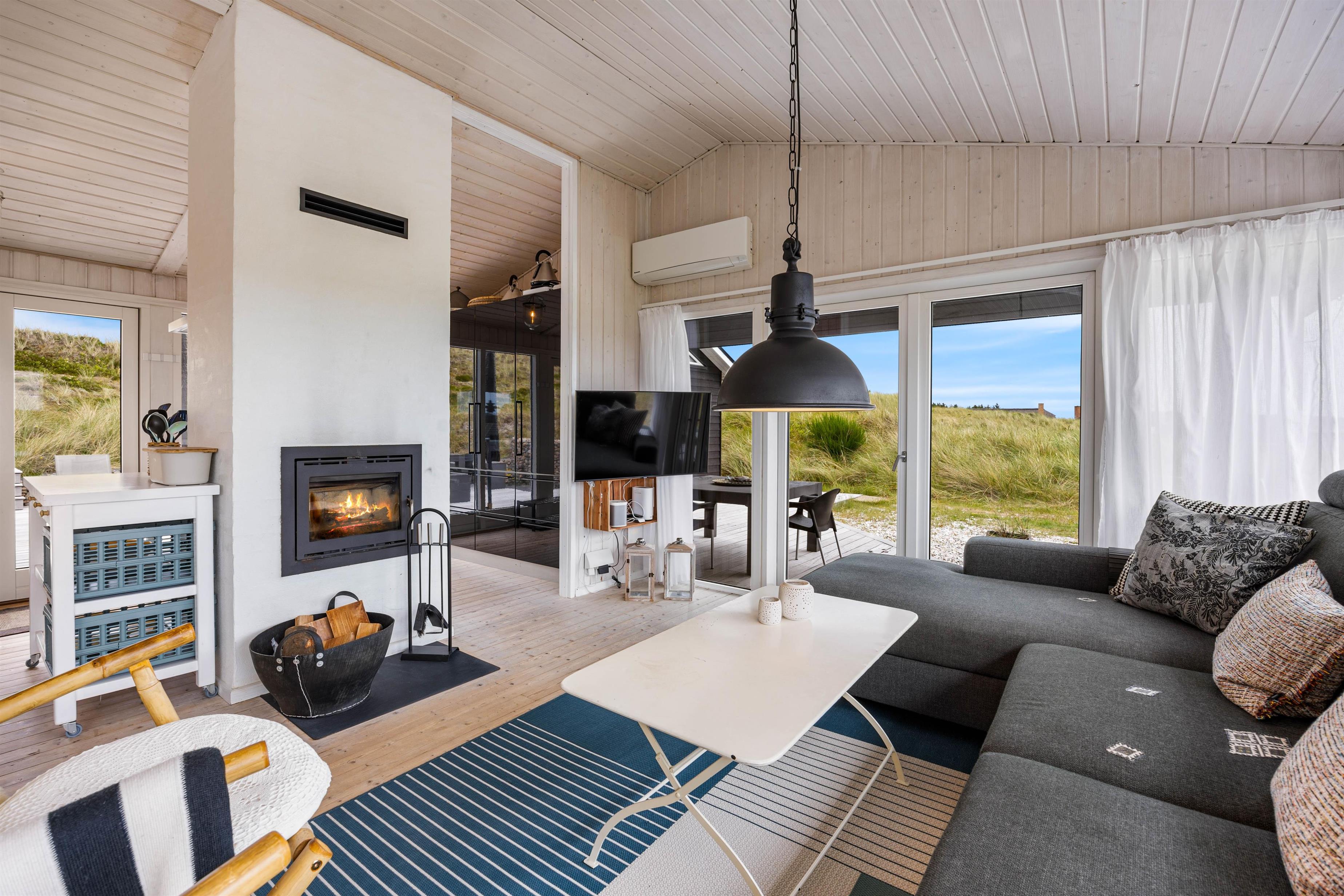 Køkken og stue er åbnet op, og store vinduespartier inviterer solens lys og den smukke natur indenfor. Den klassiske brændeovn sørger for varme på de kølige feriedage, og de knitrende flammer spreder en god og afslappende feriestemning. Hvis I dog ønsker en mere økonomisk opvarmning af huset, tilbyder husets energibesparende luft-til-luft varmepumpe lige netop dette.