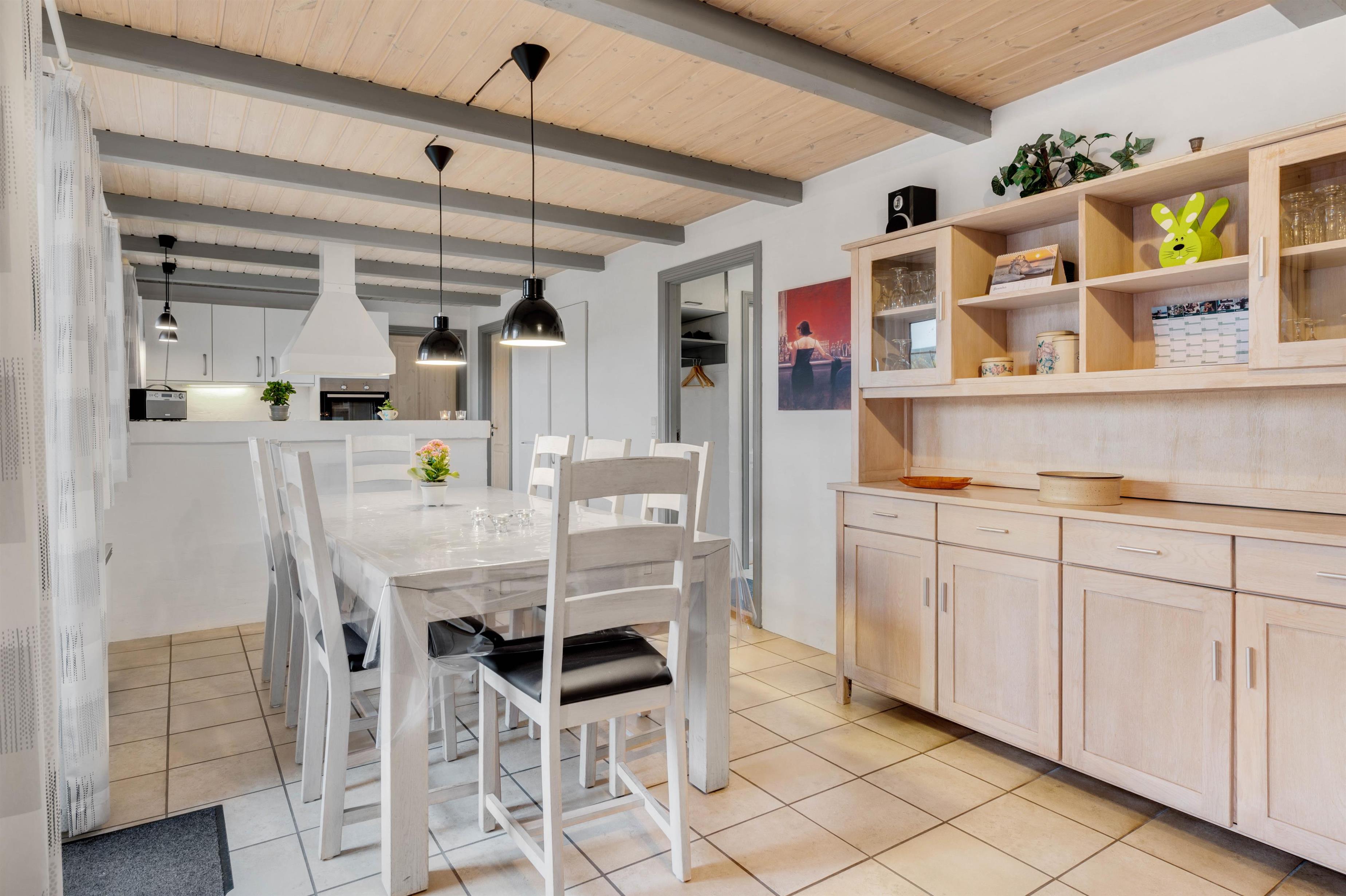 Husets køkken ligger i åben forbindelse med den store spisestue og er veludstyret med blandt andet opvaskemaskine, mikroovn og køleskab med 87 liters frysekapacitet. Køkkenet fremstår lyst og pænt og der er god plads til alle jeres kokkerier. Fra spisepladsen er der direkte udsyn til køkkenet, så familiens yngste kan følge med i madlavningen – også selvom det selv foretrækker at sidde ved spisebordet og tegne.