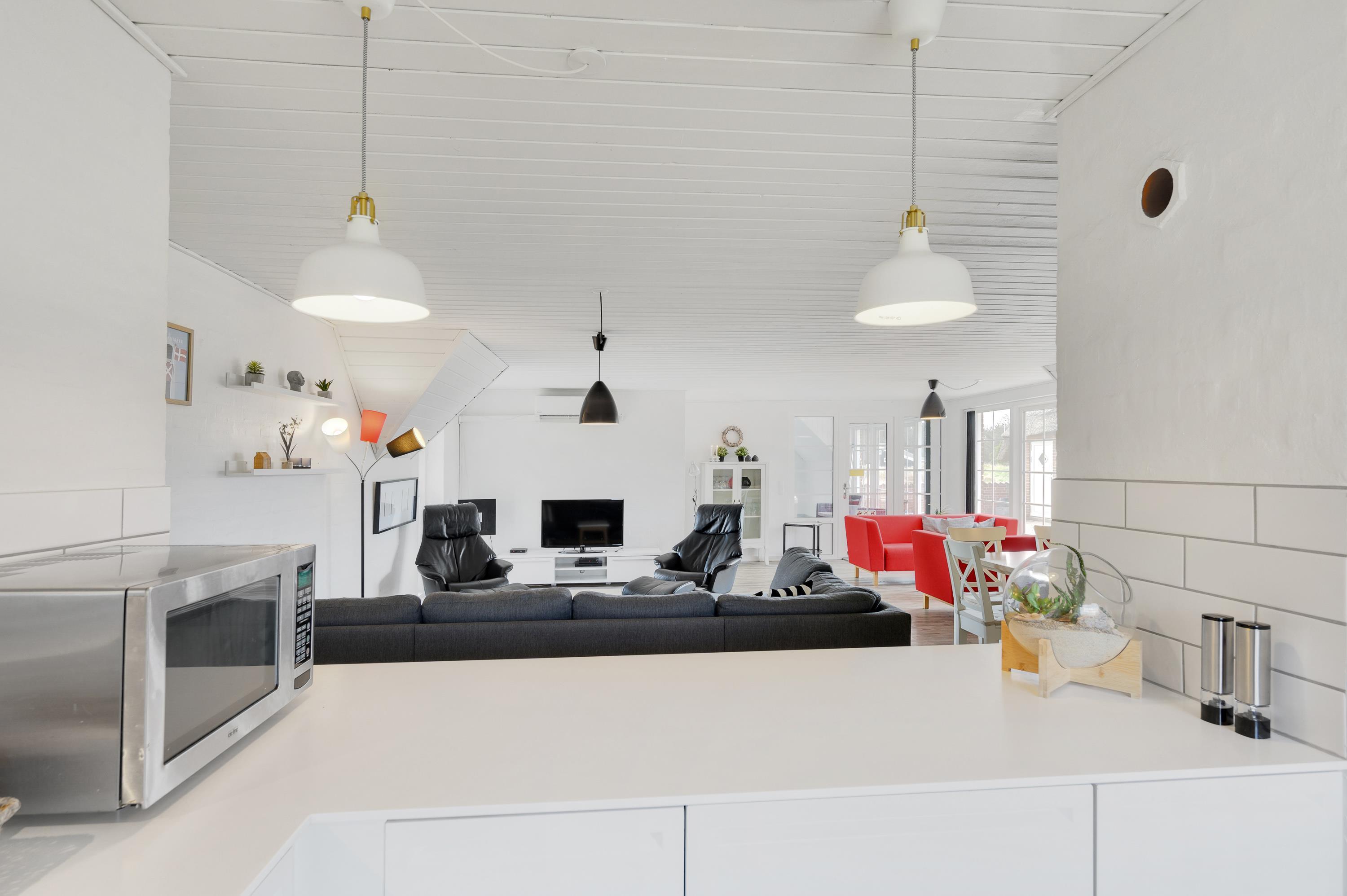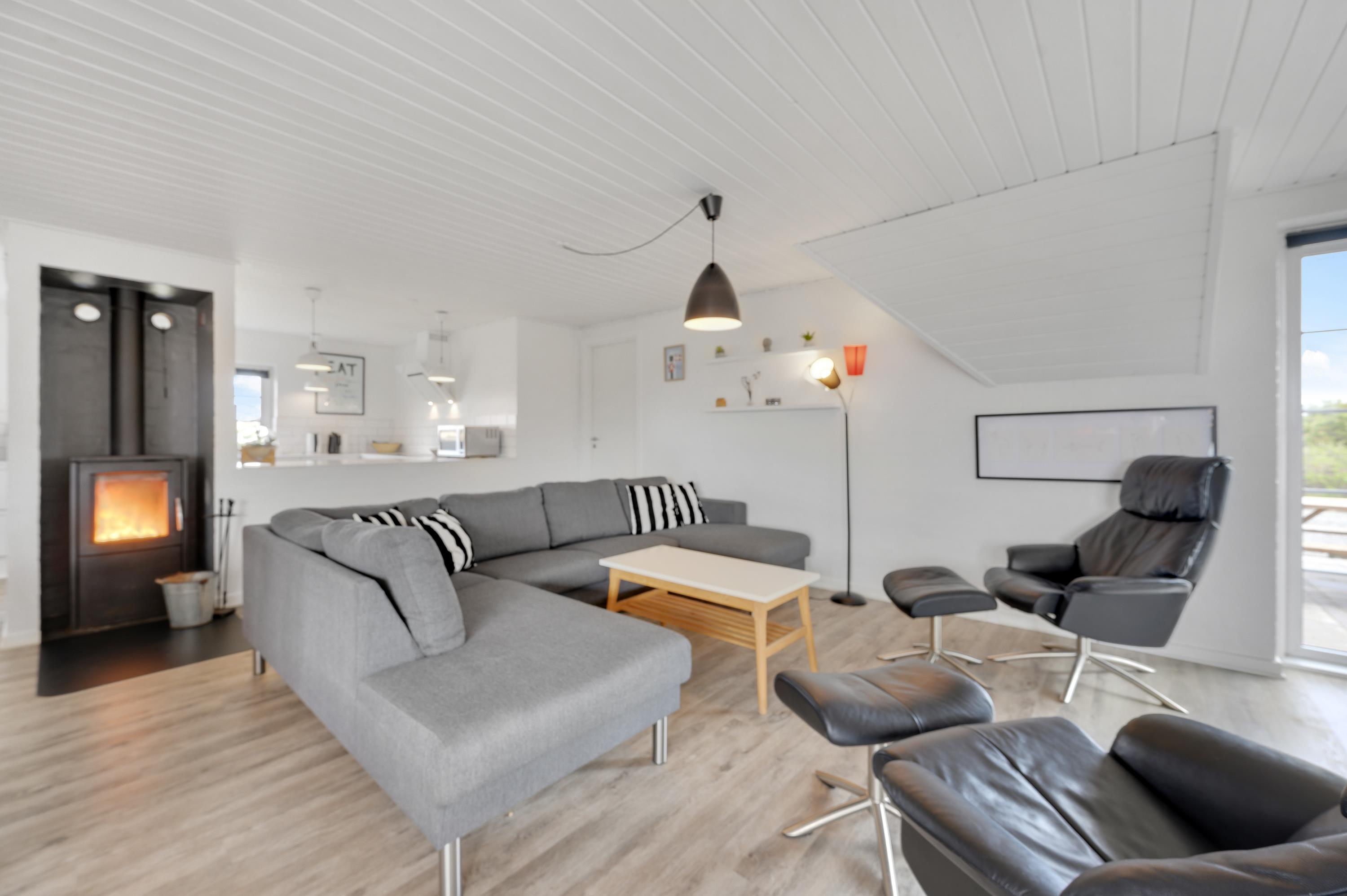 Sommerhuset hjerterum er helt klar det store køkkenalrum der kombinerer Stue, spisestue og køkken i ét. Her kan I snildt være samlet alle sammen, og nyde hinanden nærvær og selskab, og skabe dejlige ferieminder. Sommerhuset er udstyret med en moderne brændeovn, som skaber en hyggelig atmosfære, samtidig med at sommerhuset fik indlagt gulvarme i hele huset i 2021, så man undgår at fryse om fødderne.