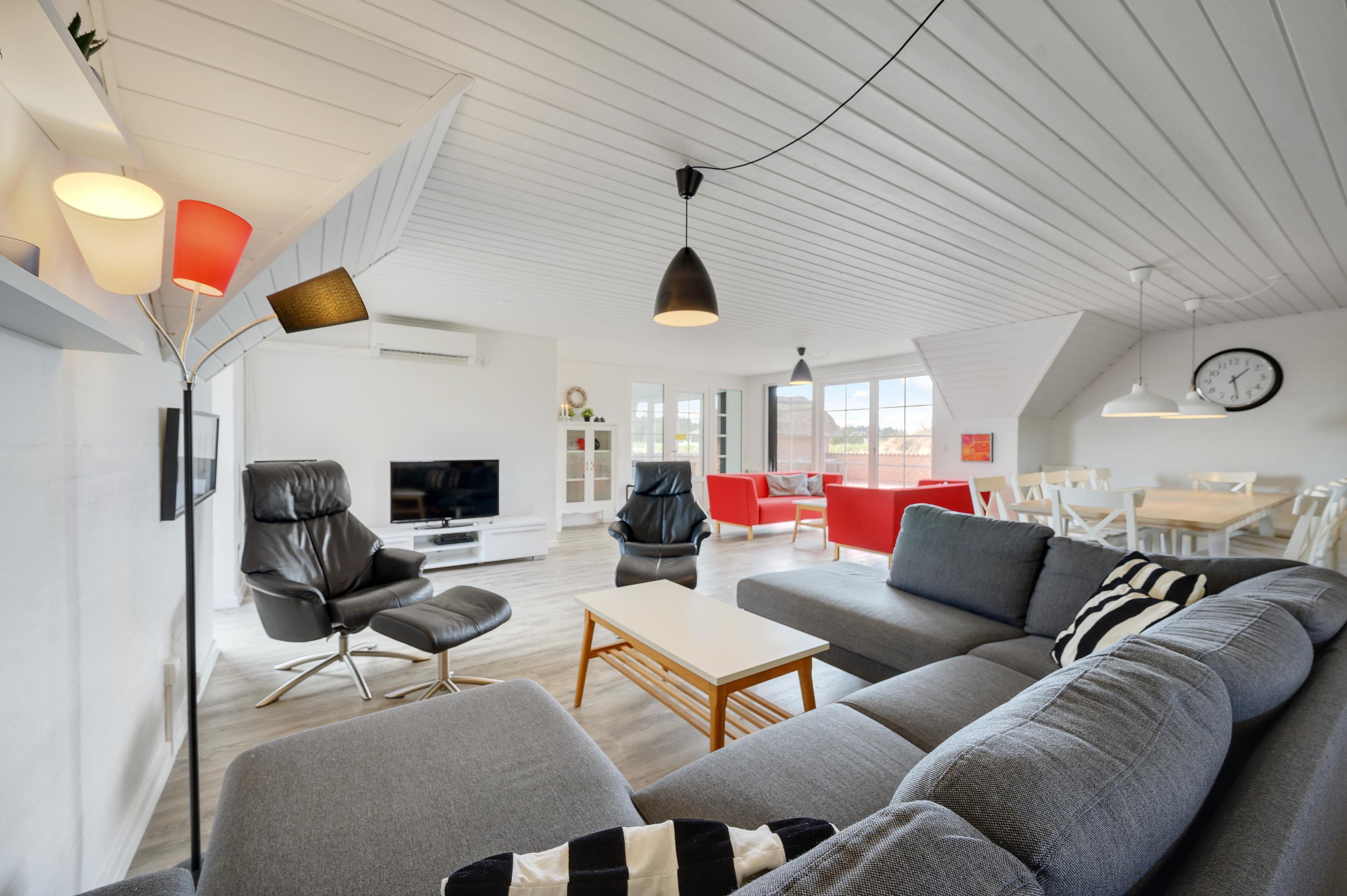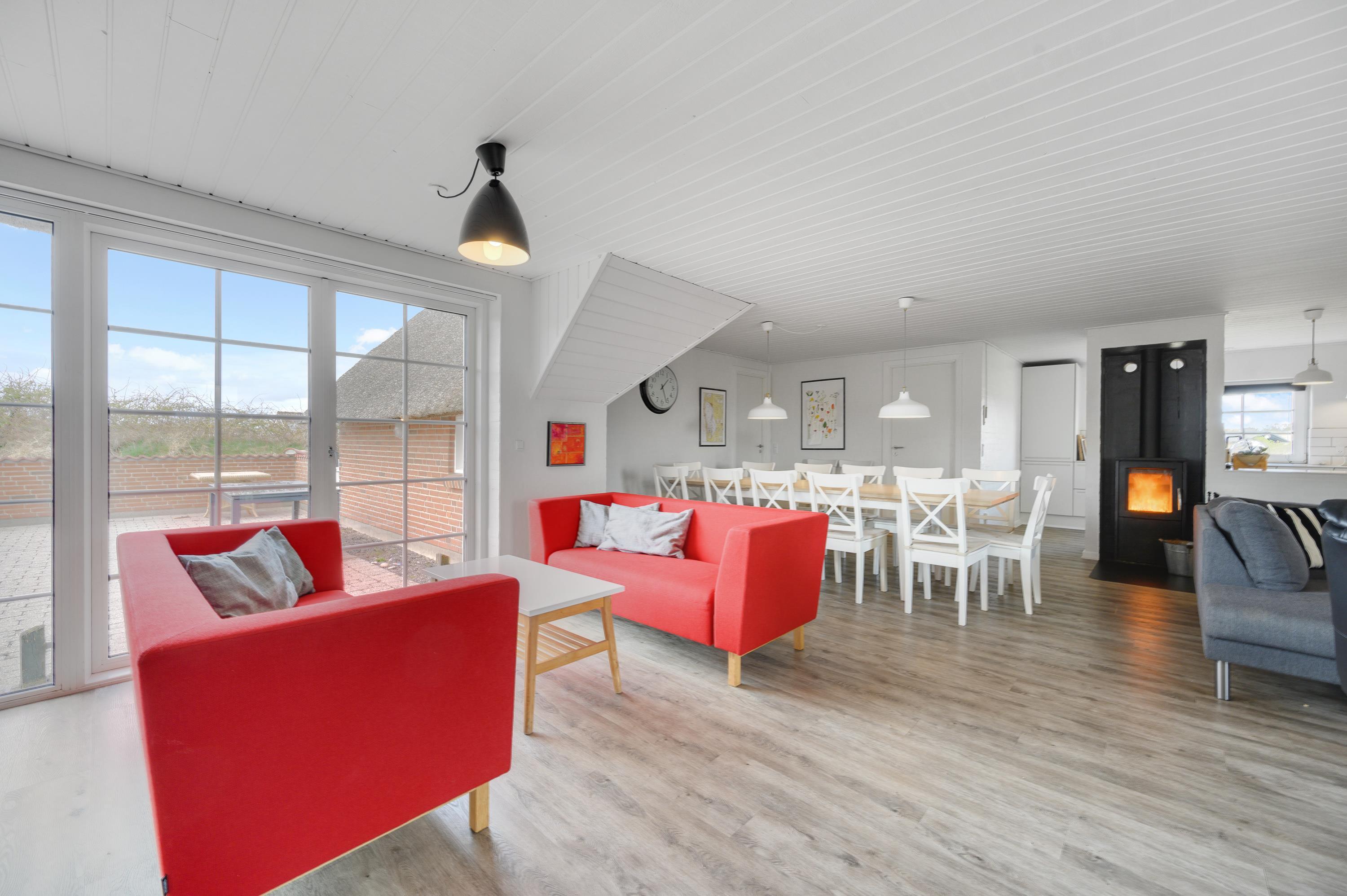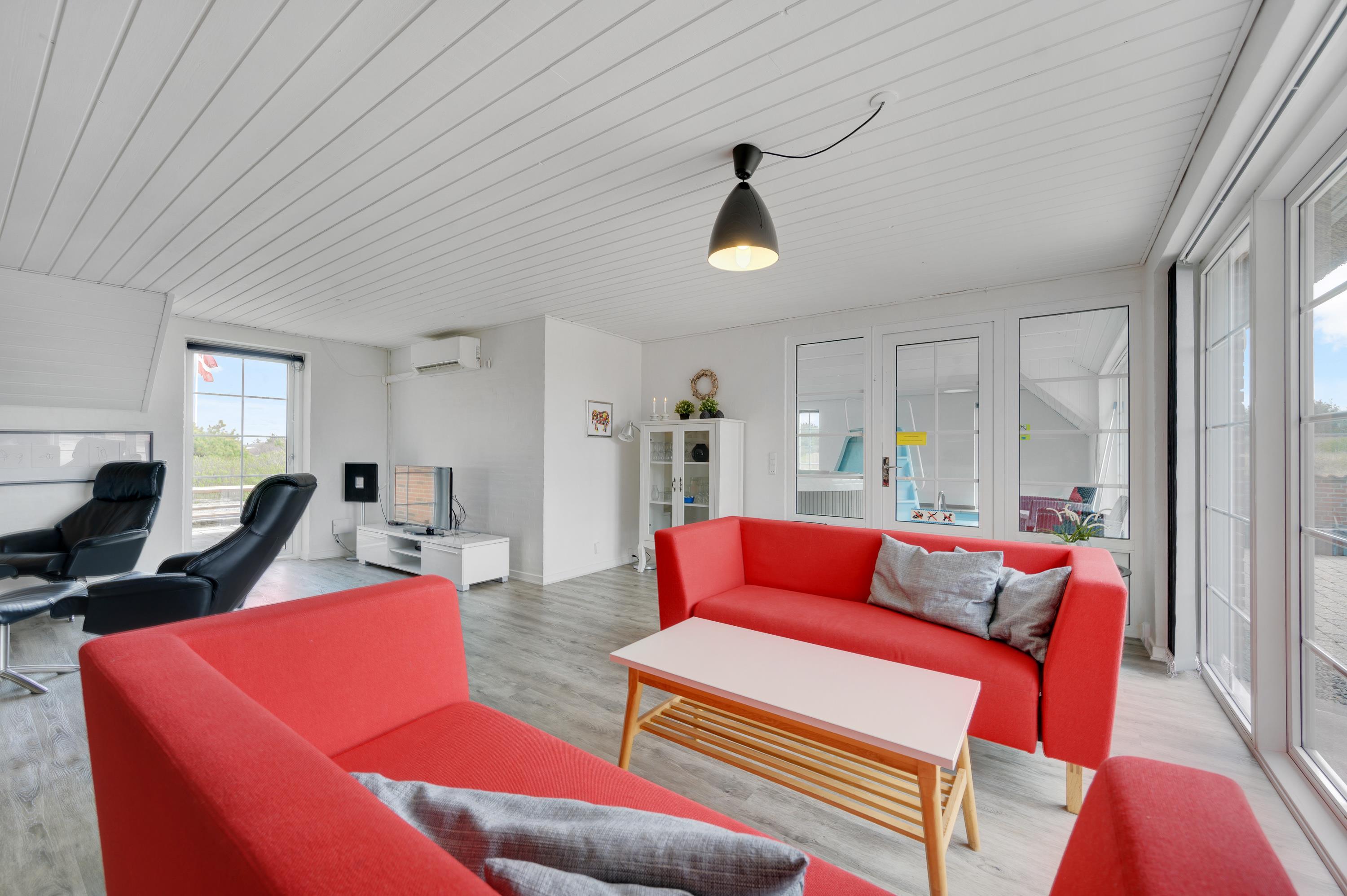 Huser er beliggende i et roligt område i det dejlige Søndervig, der på alle årstider er et besøg værd for hele familien. Fra stuen er der adgang til den dejlige store lukkede terrasse, som er praktisk for både børn og hunden. Her er havemøbler, liggestole og parasol til de varme dage.