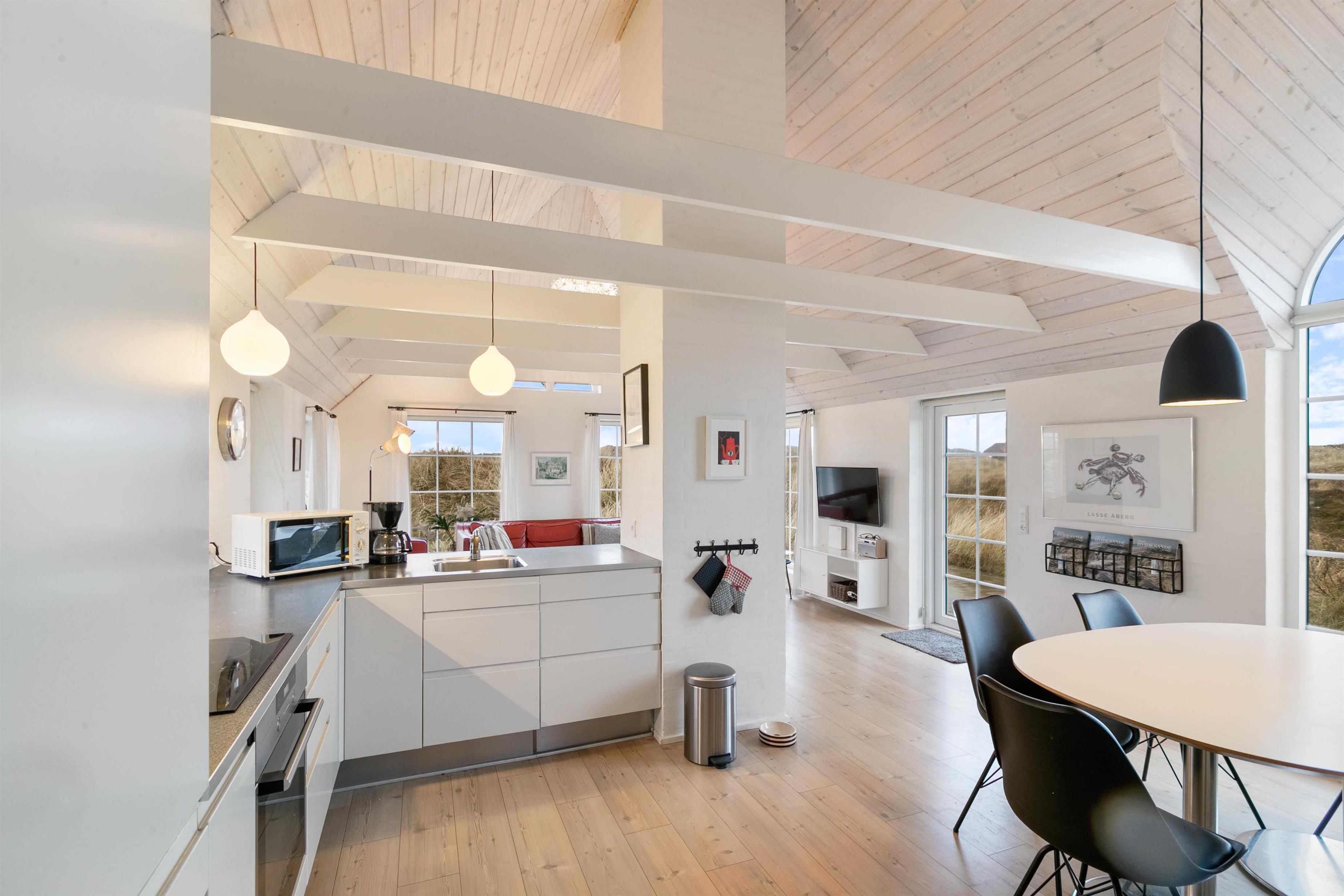Her på Jolanthavej finder i et rigtigt lækkert feriehus til seks personer beliggende på en skøn naturgrund i Søndervig, hvor der virkelig er blevet tænkt på jeres velvære og afslapningsmuligheder. Huset er særdeles charmerende og smagfuldt indrettet og indeholder alle de moderne faciliteter, man forventer i et hus der er opført i 2014. Der er gulvvarme i alle rum, og der er to badeværelser, hvoraf et har spa og sauna. Der er loft til kip i køkken og stue, hvilket giver en godrummelig fornemmelse.