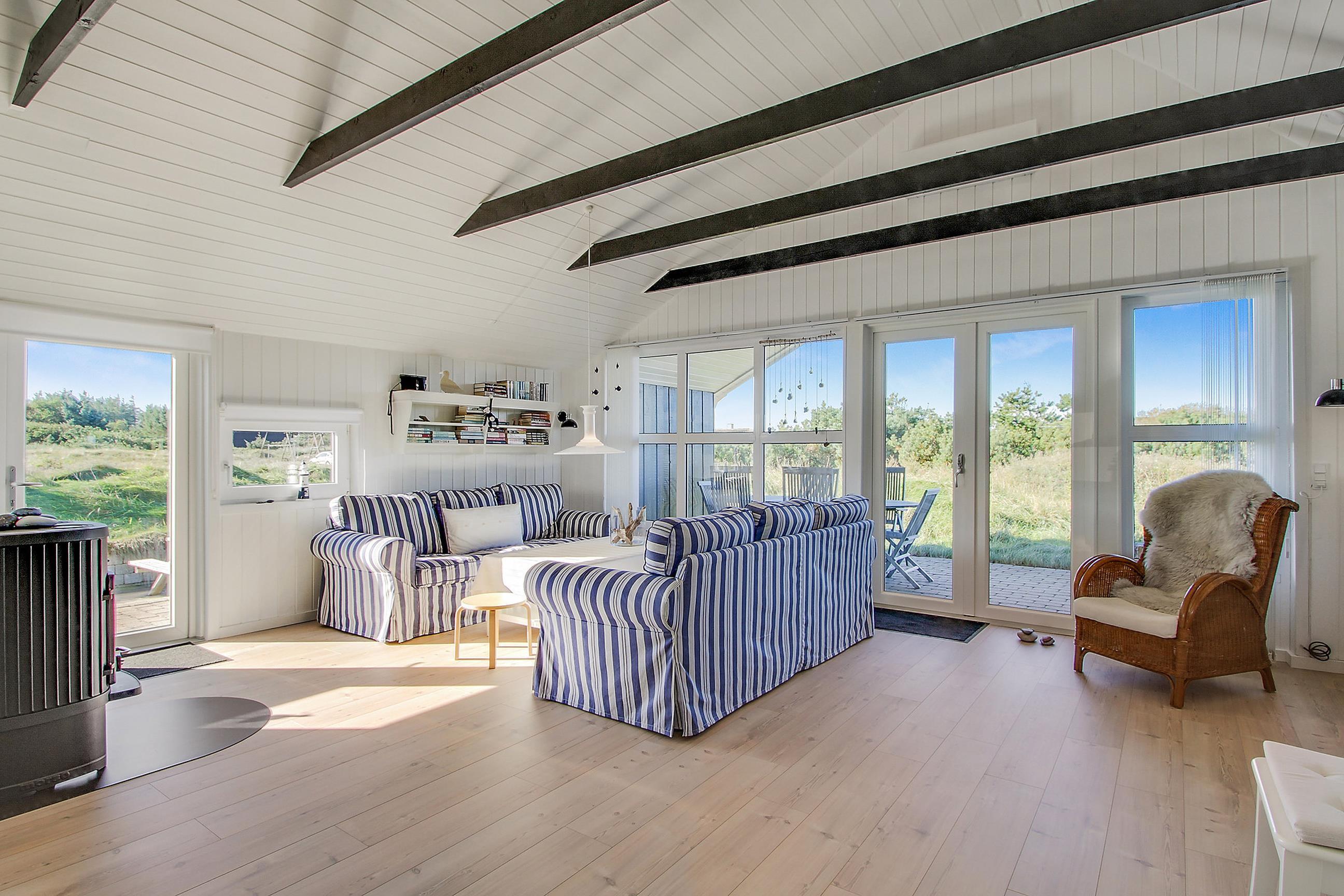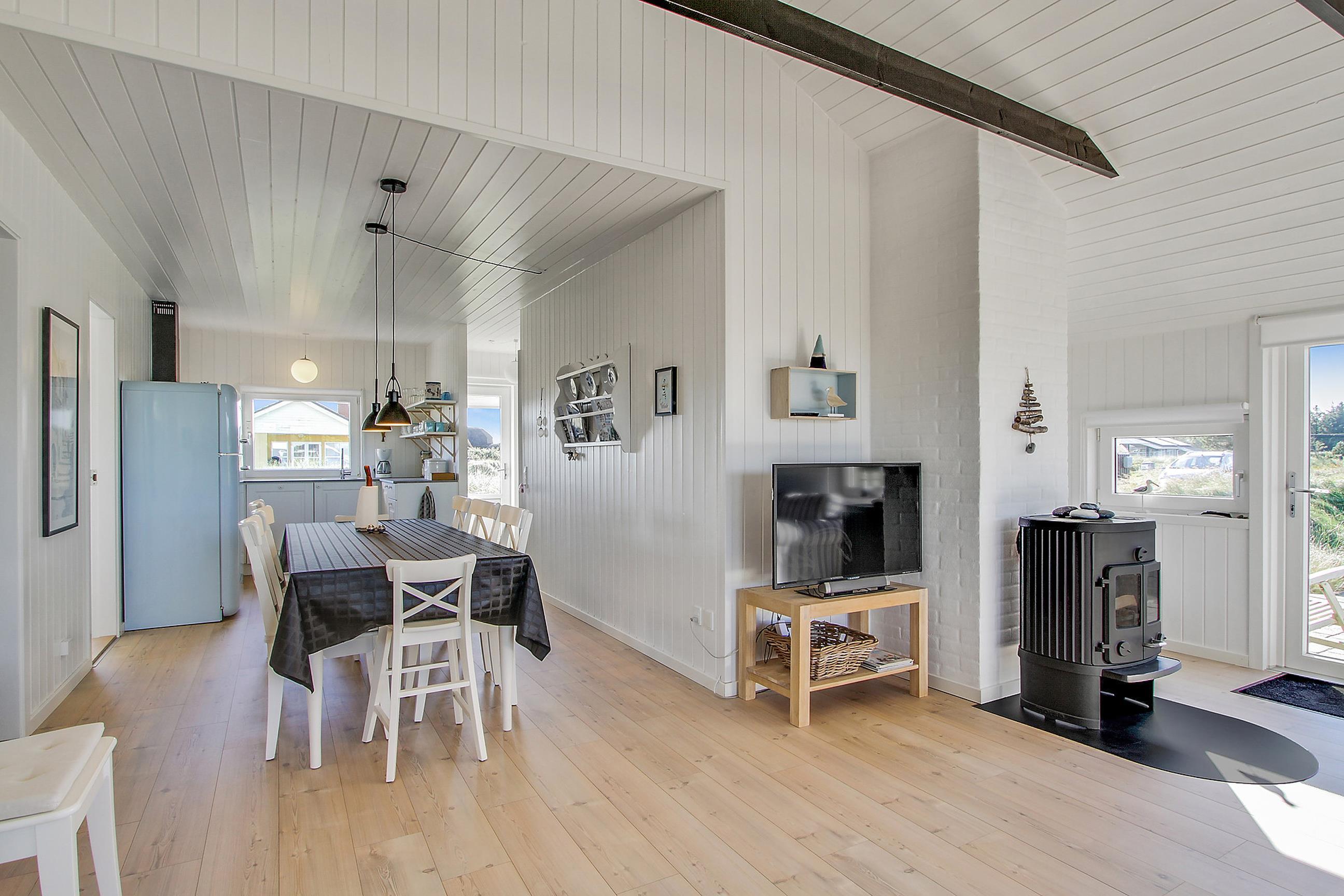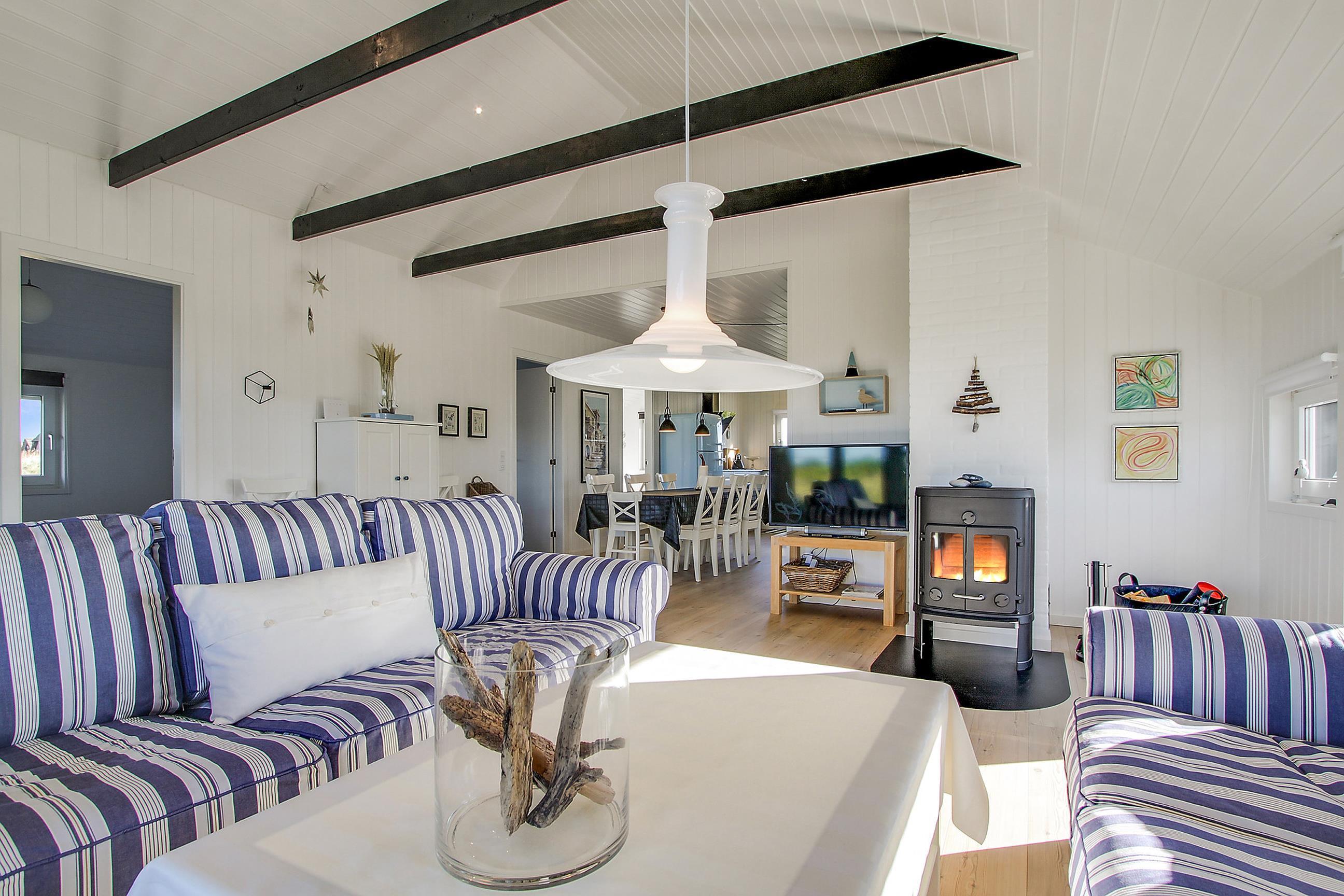 Sommerhuset har en god rumfordeling med stor opholdsstue og 3 gode værelser. 2 af disse værelser er indrettet med dobbeltsenge, mens det sidste værelse har 2 enkeltsenge. Men husets hjerte er uden tvivl det store opholdsrum med loft til kip og store vinduespartier, der inviterer lyset indenfor. Her er det plads til både aktivitet og afslapning – de to vigtigste ingredienser, når man holder ferie.