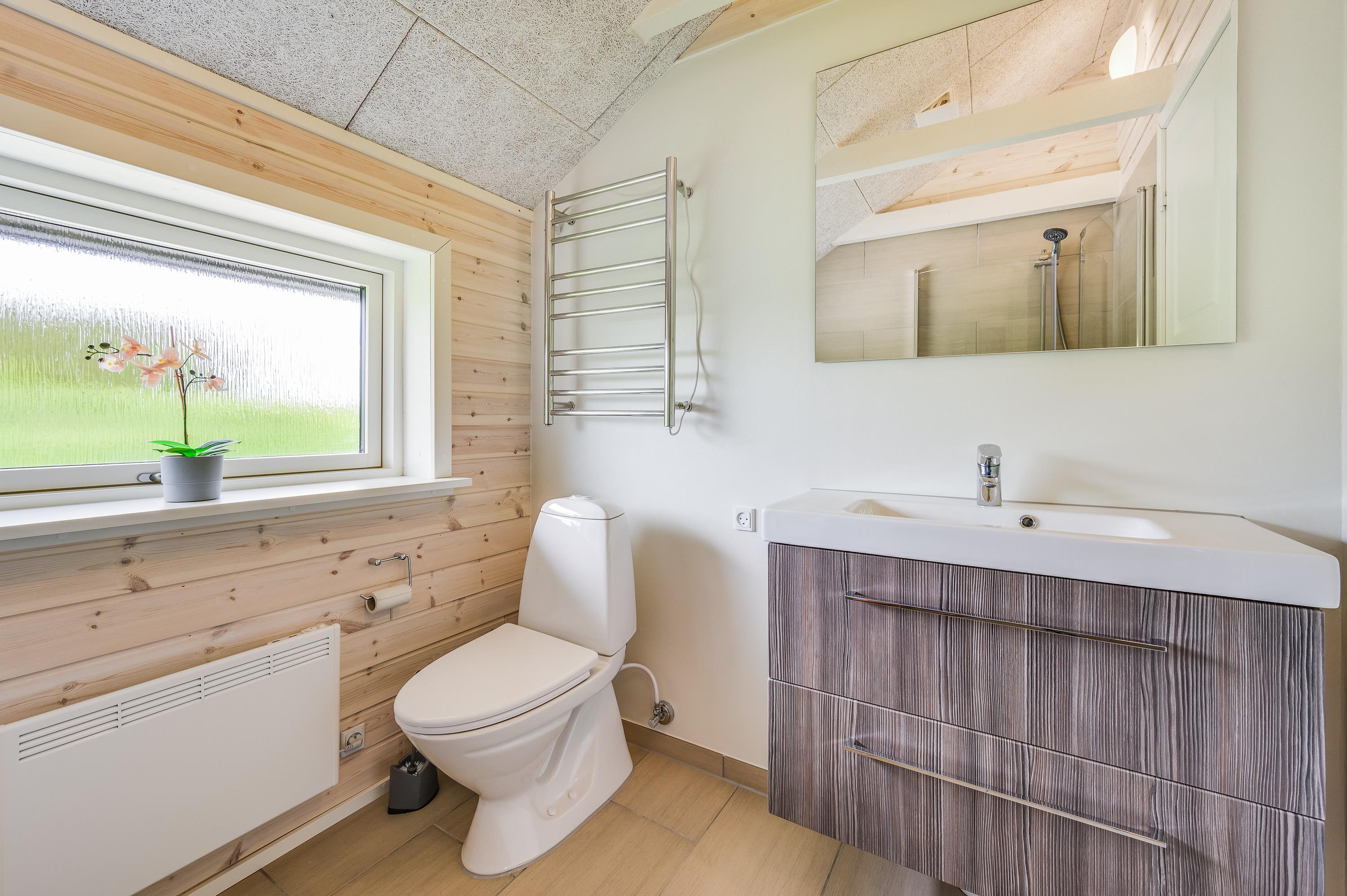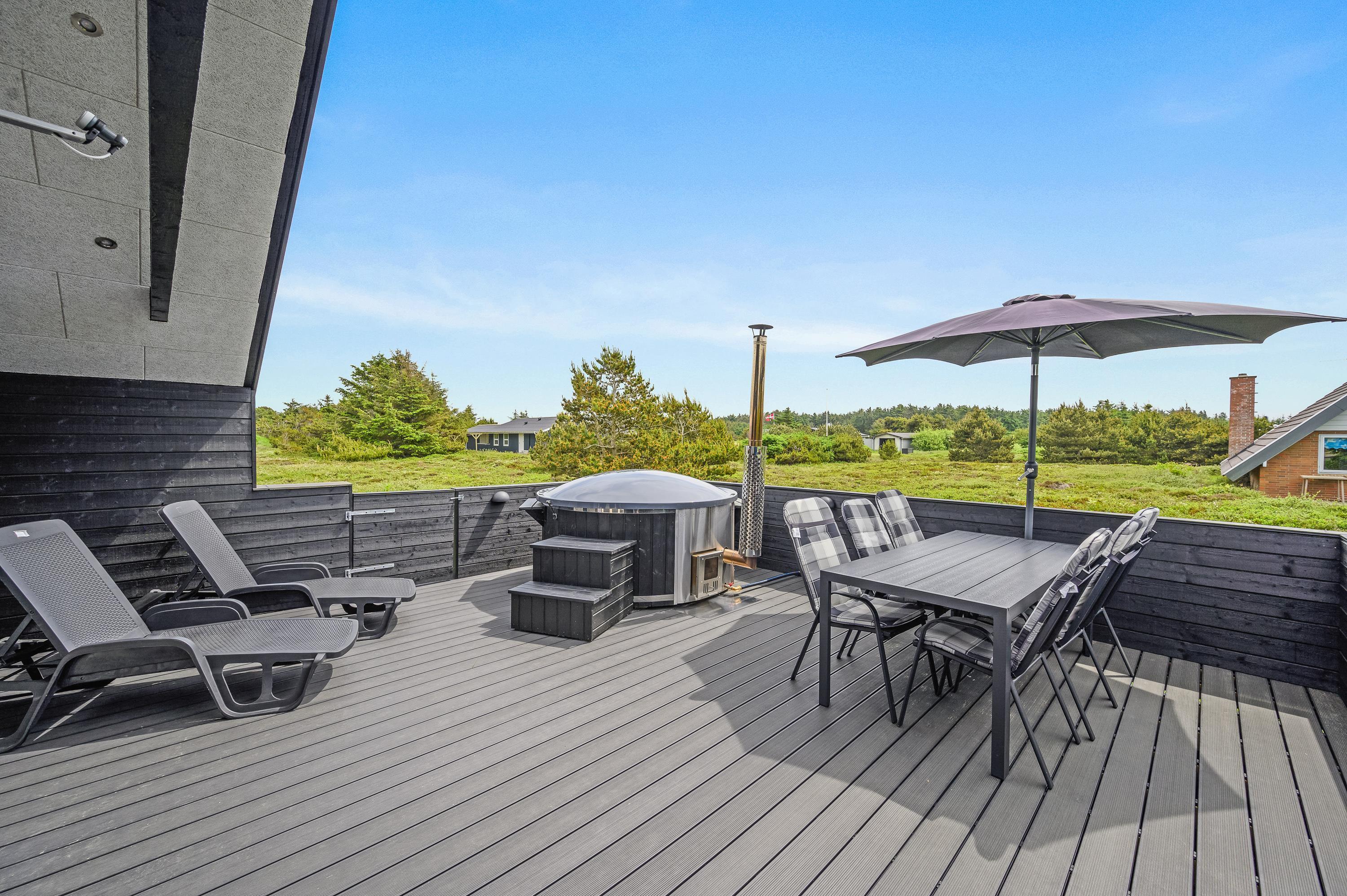 Fra stuen kommer I ud på feriehusets overdækkede terrasse, der er helt lukket af. Her finder I også et af feriens højdepunkter, det store vildmarksbad. En afslappende stund i det varme boblebad, mens fuglene kvidrer eller vinden rusker i trætoppene, er velvære på højt plan.