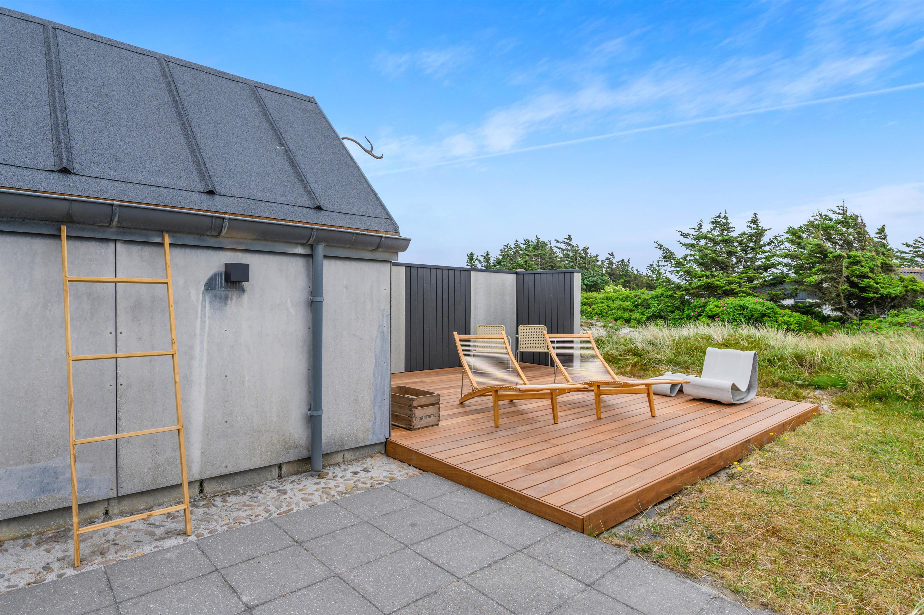 Sommerhuset på Nordsøvej 390 tilbyder også en fantastisk terrasse. Fra sommerhusets stue er der udgang til terrassen, der både er overdækket og afskærmet. Her kan I for alvor nyde de danske sommeraftener i selskab med hinanden omkring havemøblerne. Den naturskønne grund giver børnene rig mulighed for leg og udforskning, og med kun 350 meter til havet har I altid en fantastisk strand inden for kort gåafstand.