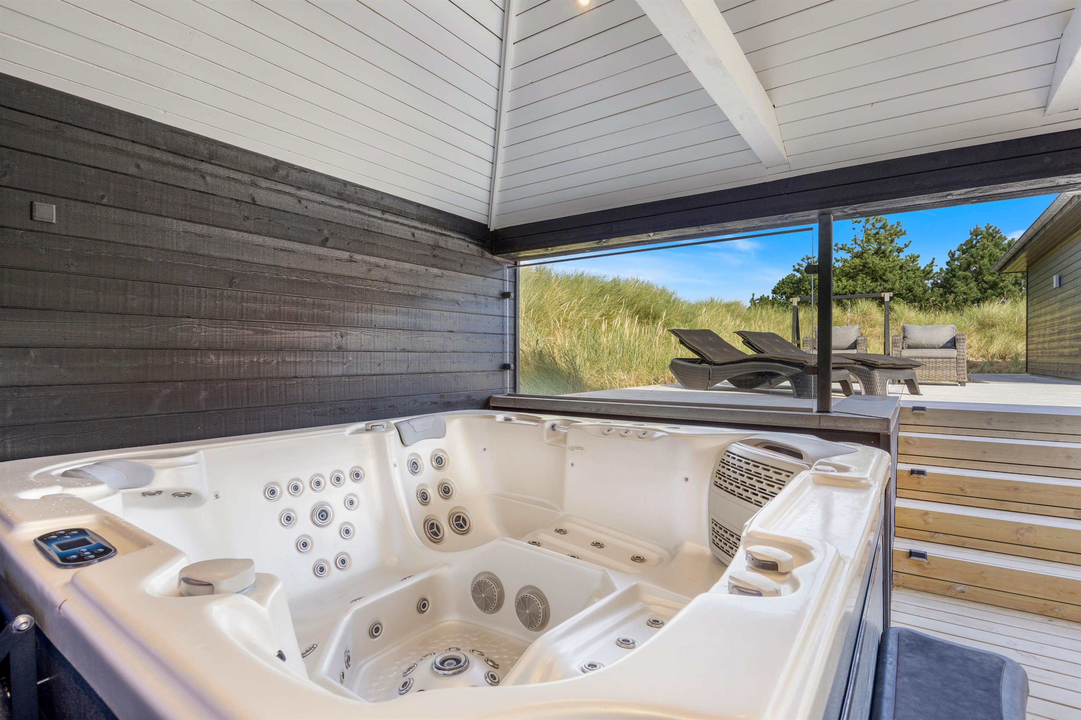 Sommerhusets nedsænkede terrasse er et højdepunkt i sig selv. Her er der for alvor lagt op til masser af hygge og afslapning i lækre omgivelser. På terrassen er der et udendørs spabad, som I kan læne jer tilbage i og nyde ferien - under aftenens stjernehimmel er det helt fantastisk. Derudover er der også en udebruser, I kan skylle jer under efter en tur på stranden. Udebruseren er tilgængelig i perioden fra april til november.
