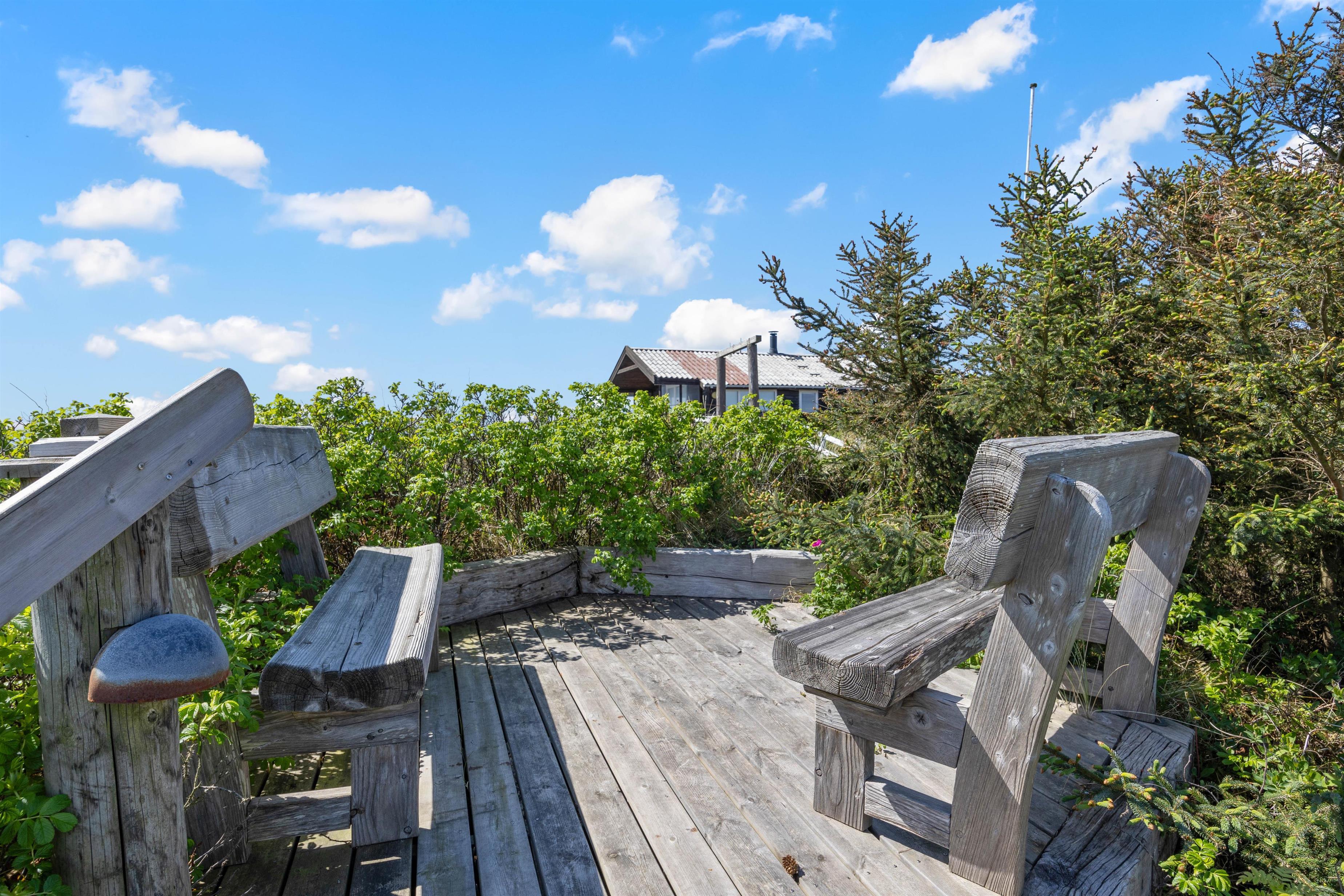 Dette dejlige sommerhus har den mest vidunderlige beliggenhed på en stor kuperet klitgrund. Fra ferieboligens ene højtbeliggende terrasse har I en ubeskrivelig smuk udsigt over havet på den ene side og fjorden og hele sommerhusområdet på den anden side. Heroppe er et helt privat udsigtspunkt. Tag en god flaske vin med op og se solen forsvinde ned i det store hav en smuk sommeraften.