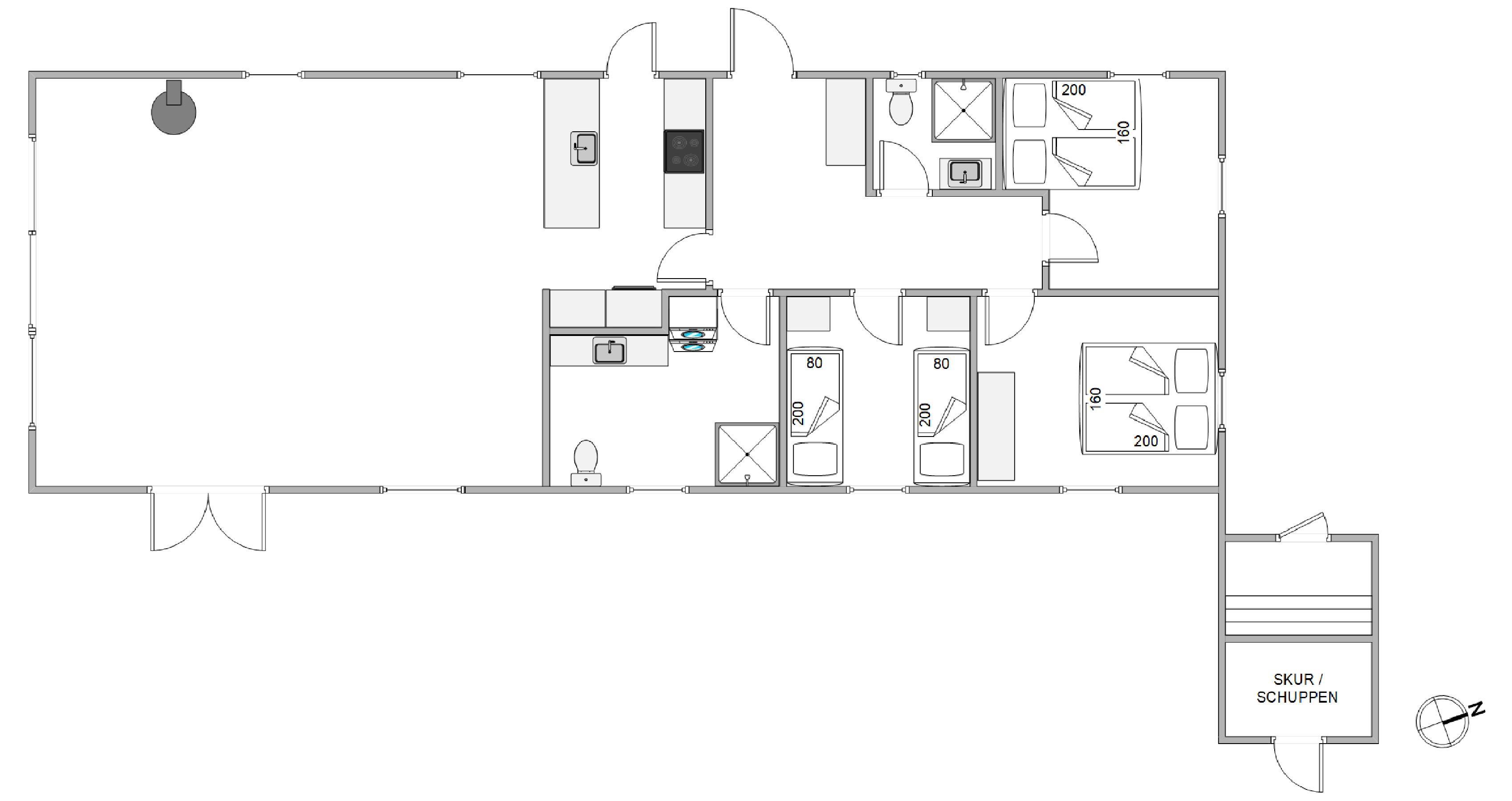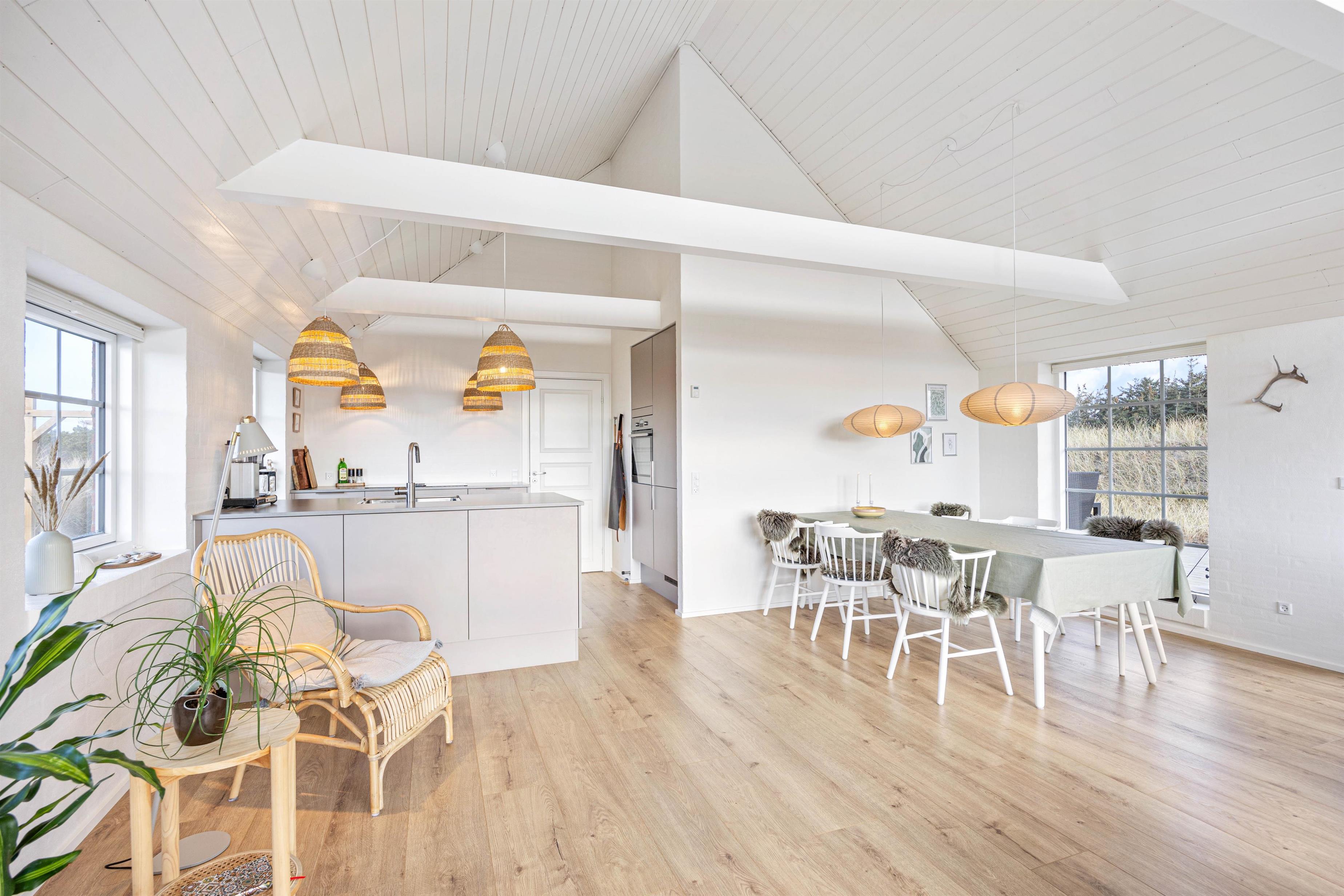 Køkken, spiseplads og stue ligger i forbindelse med hinanden, hvorfra I kan nyde den smukke og fantastiske udsigt til den skønne omkringliggende natur. Her har I mulighed for sammen at tilberede aftensmaden imens andre slænger sig på sofaen til en god film med varmen fra den knitrende brændeovn i baggrunden. Derudover er sommerhuset udstyret med en energibesparende varmepumpe, der hjælper med til et behageligt indeklima.
