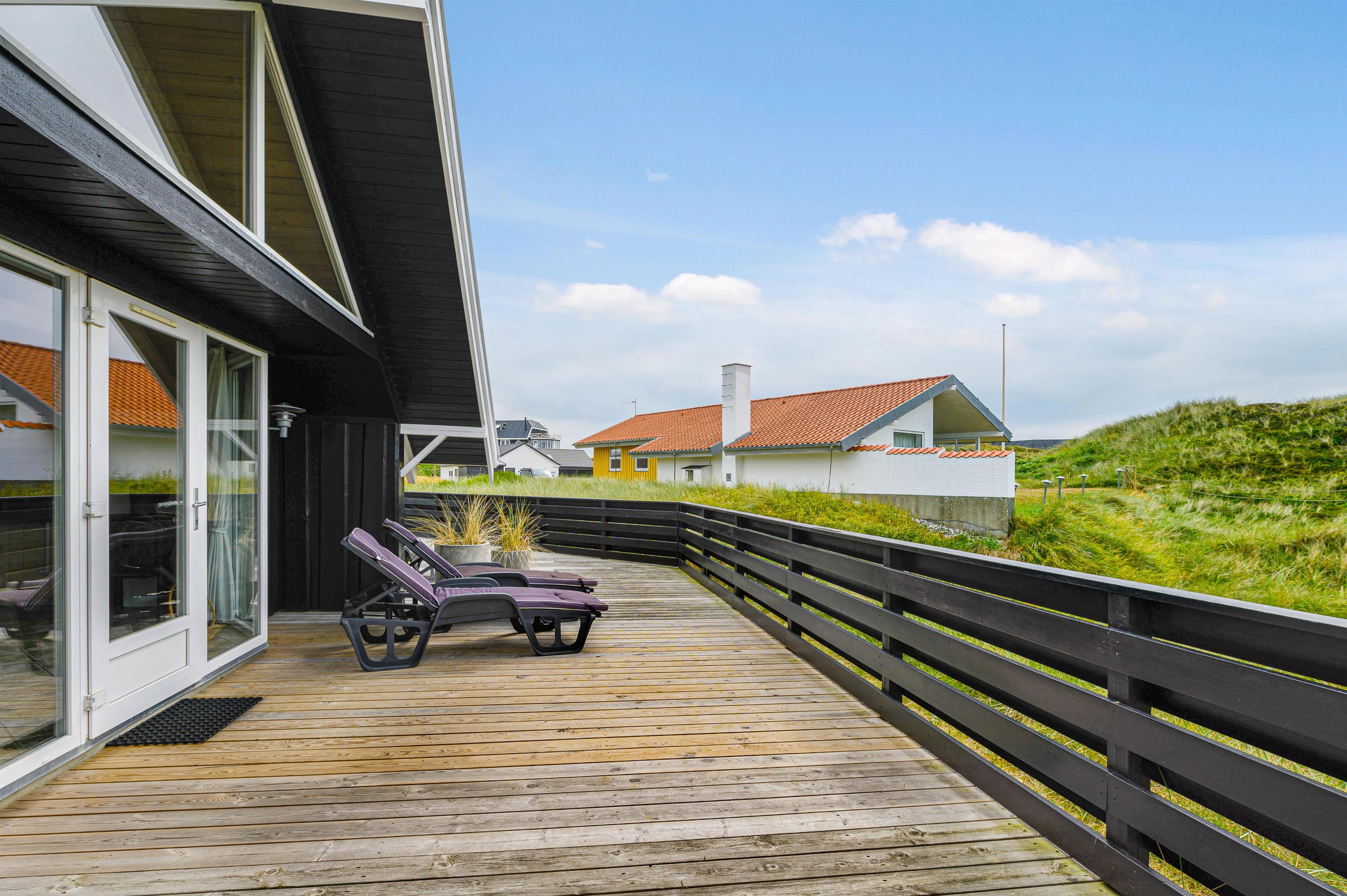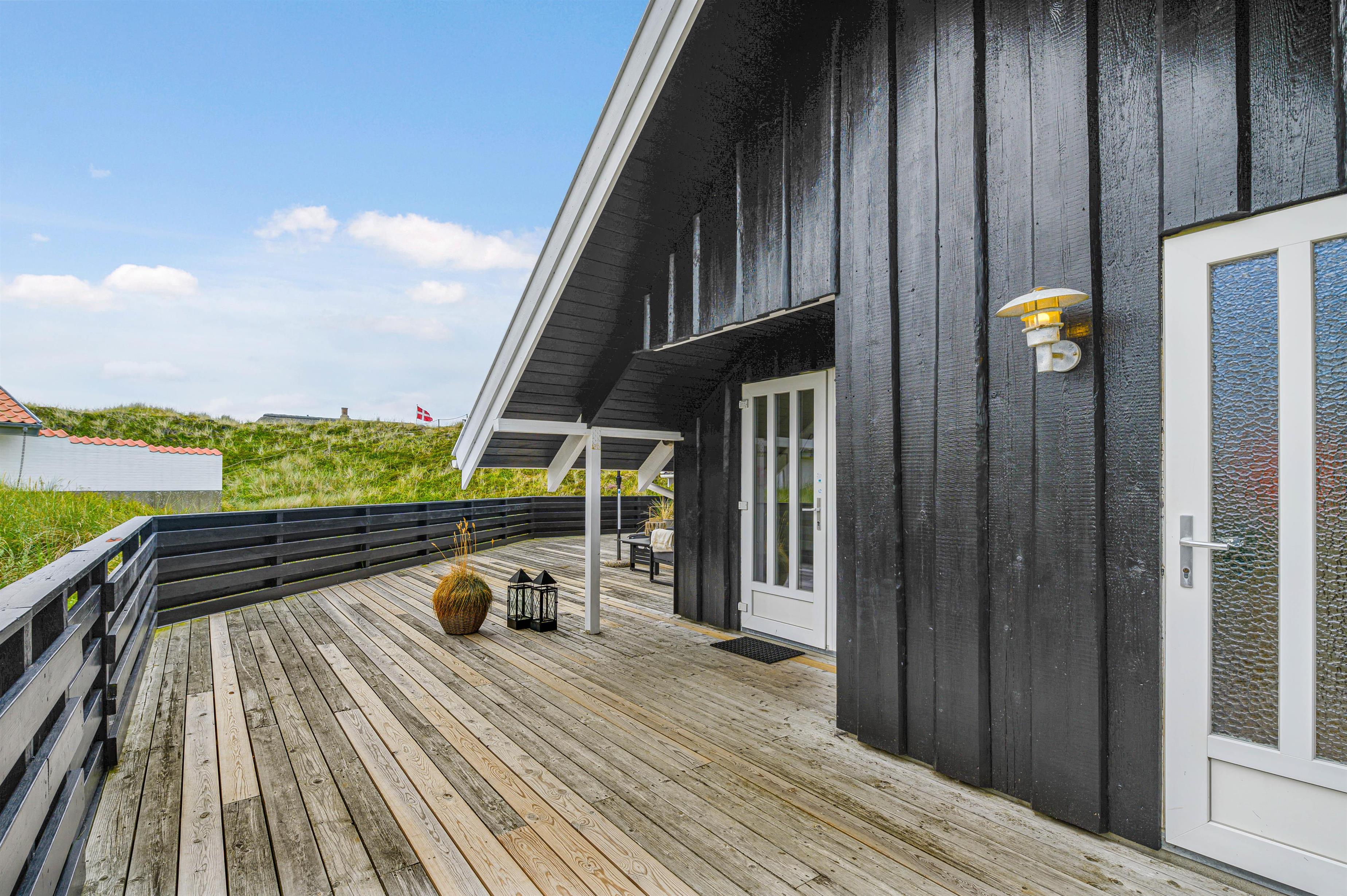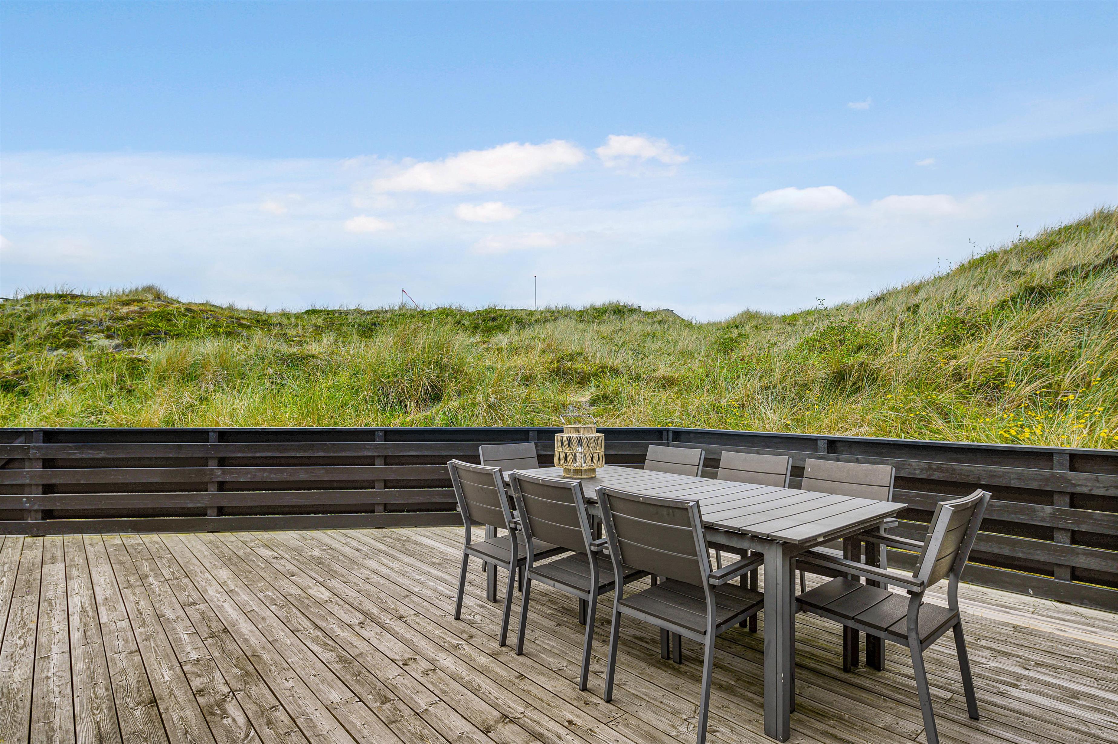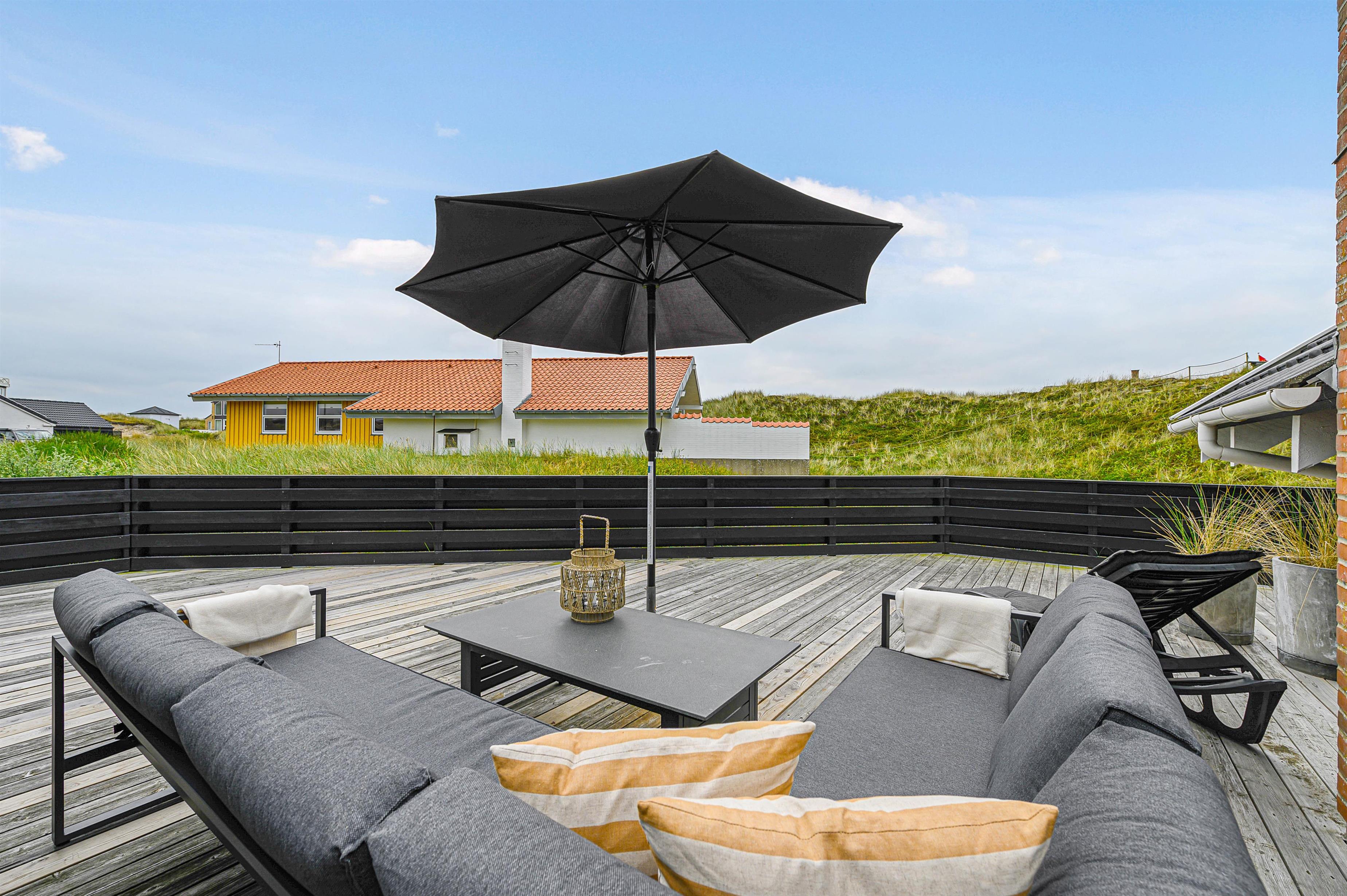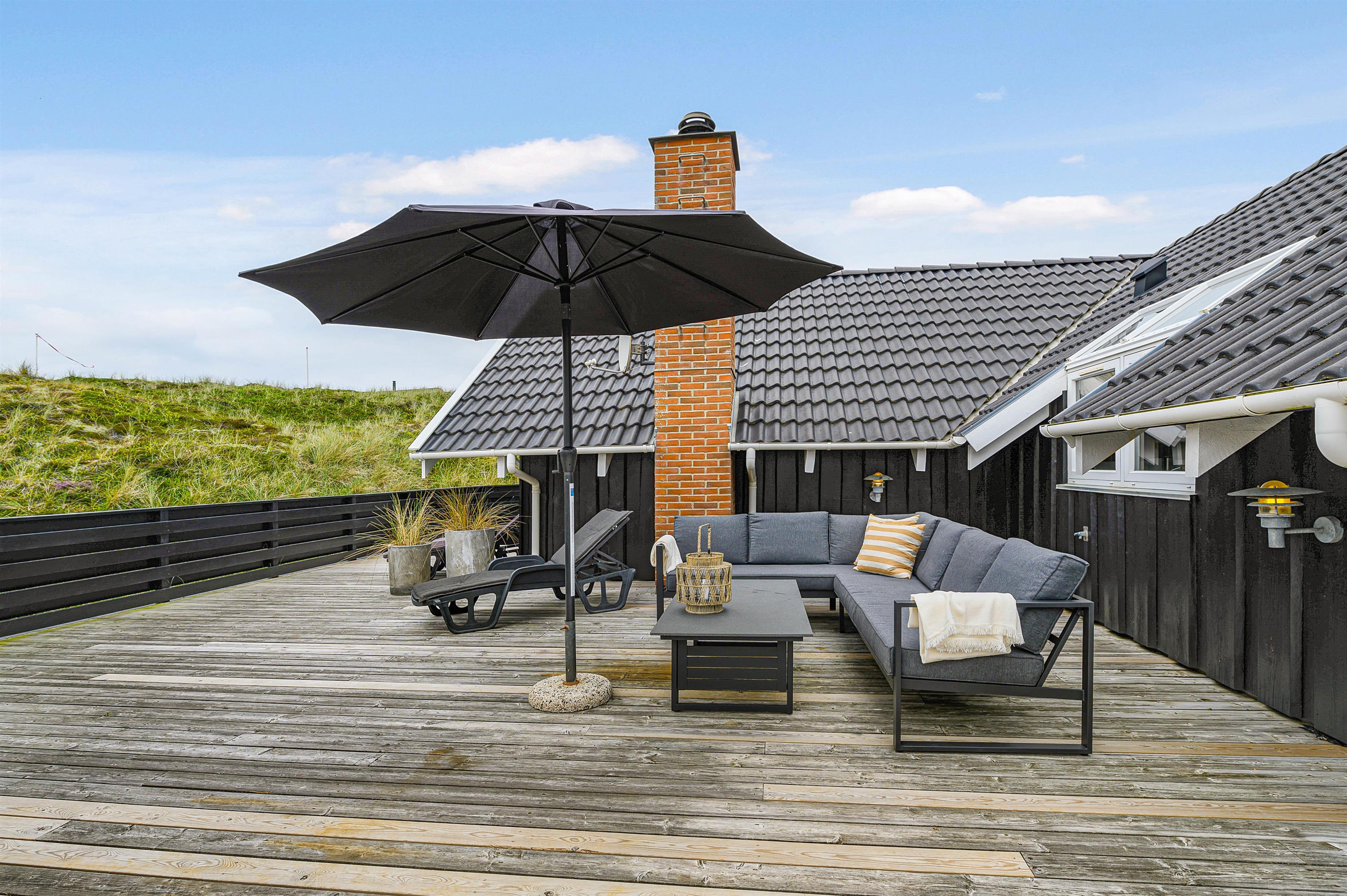 Terrassen er intet mindre end fantastisk. Den strækker sig omkring huset fra øst og mere end husets længde mod syd. Den er stor, helt lukker og delvist overdækker mod syd, så der er ofte mulighed for læ. Og området ved dette sommerhus er særdeles eftertragtet, dels fordi det ligger helt ud til det store fredede klitareal, som ligger helt op til Vesterhavet. Derudover er Søndervig centrum kun 1000 m væk, så skal der handles eller ønsker man at spise på en af byens restauranter, kan man klare dette uden at medbringe bil.
