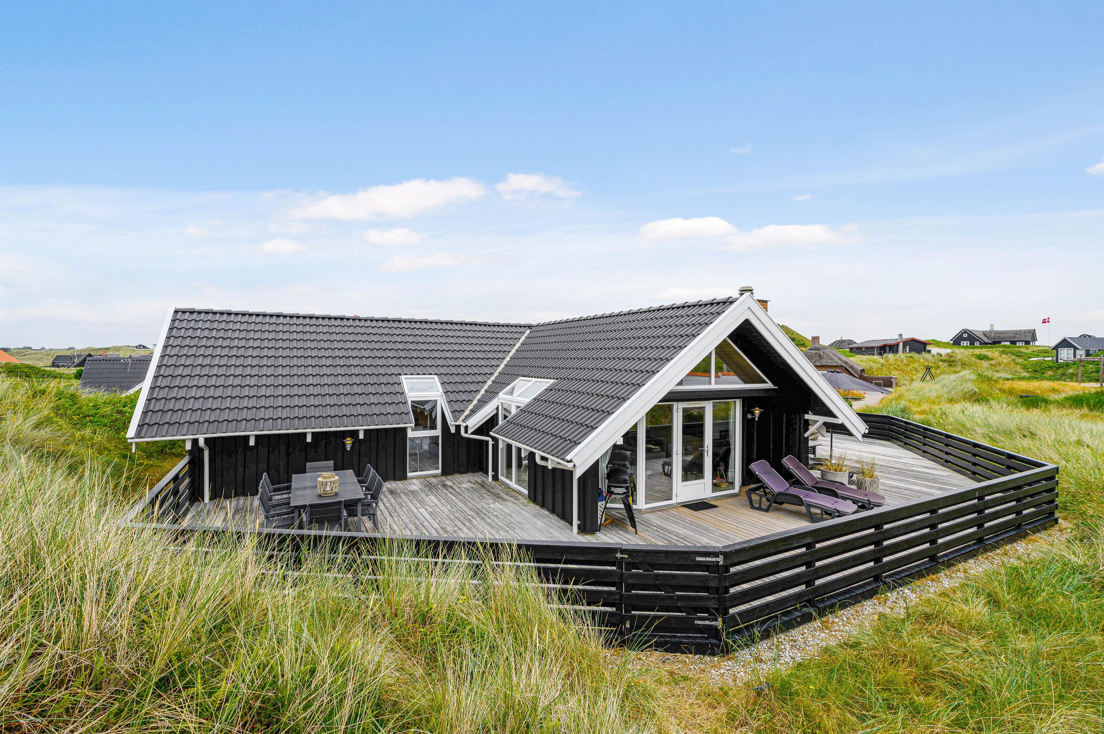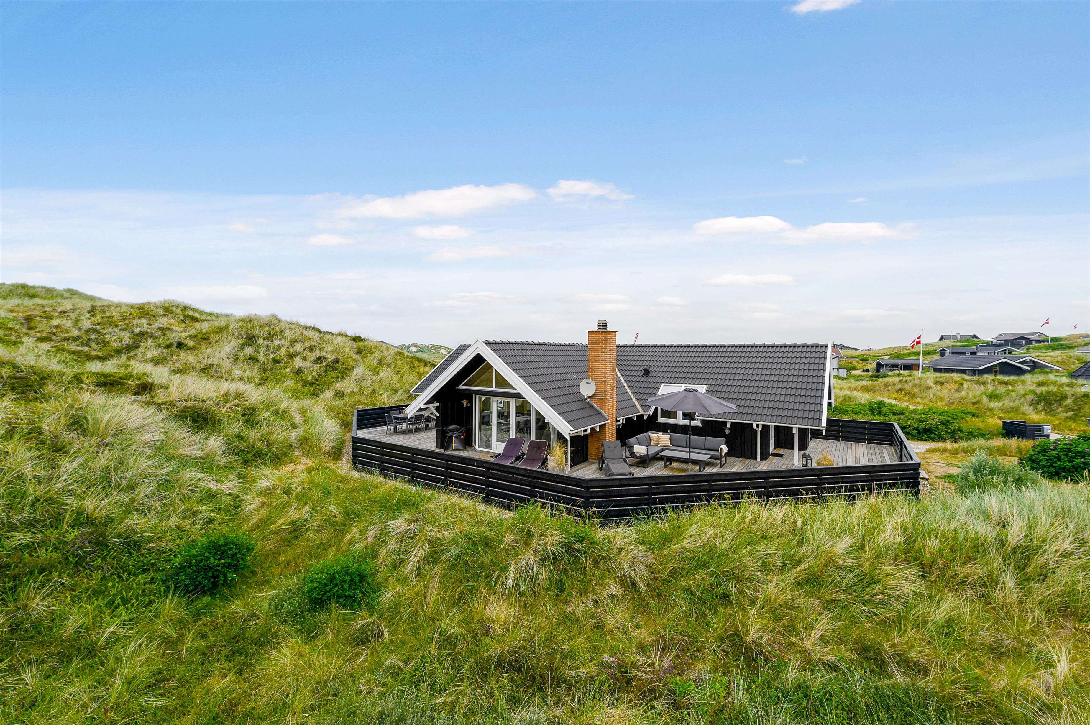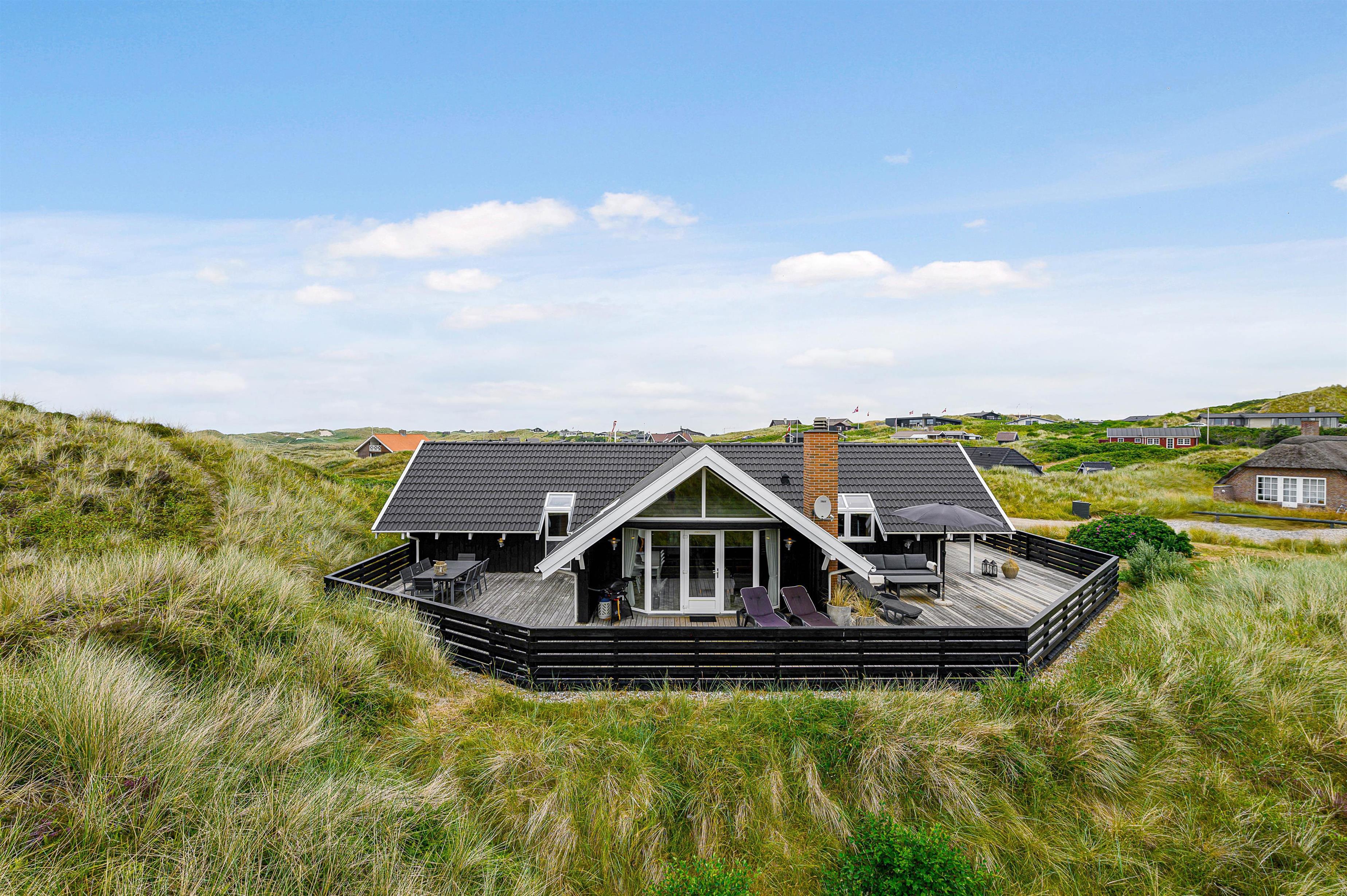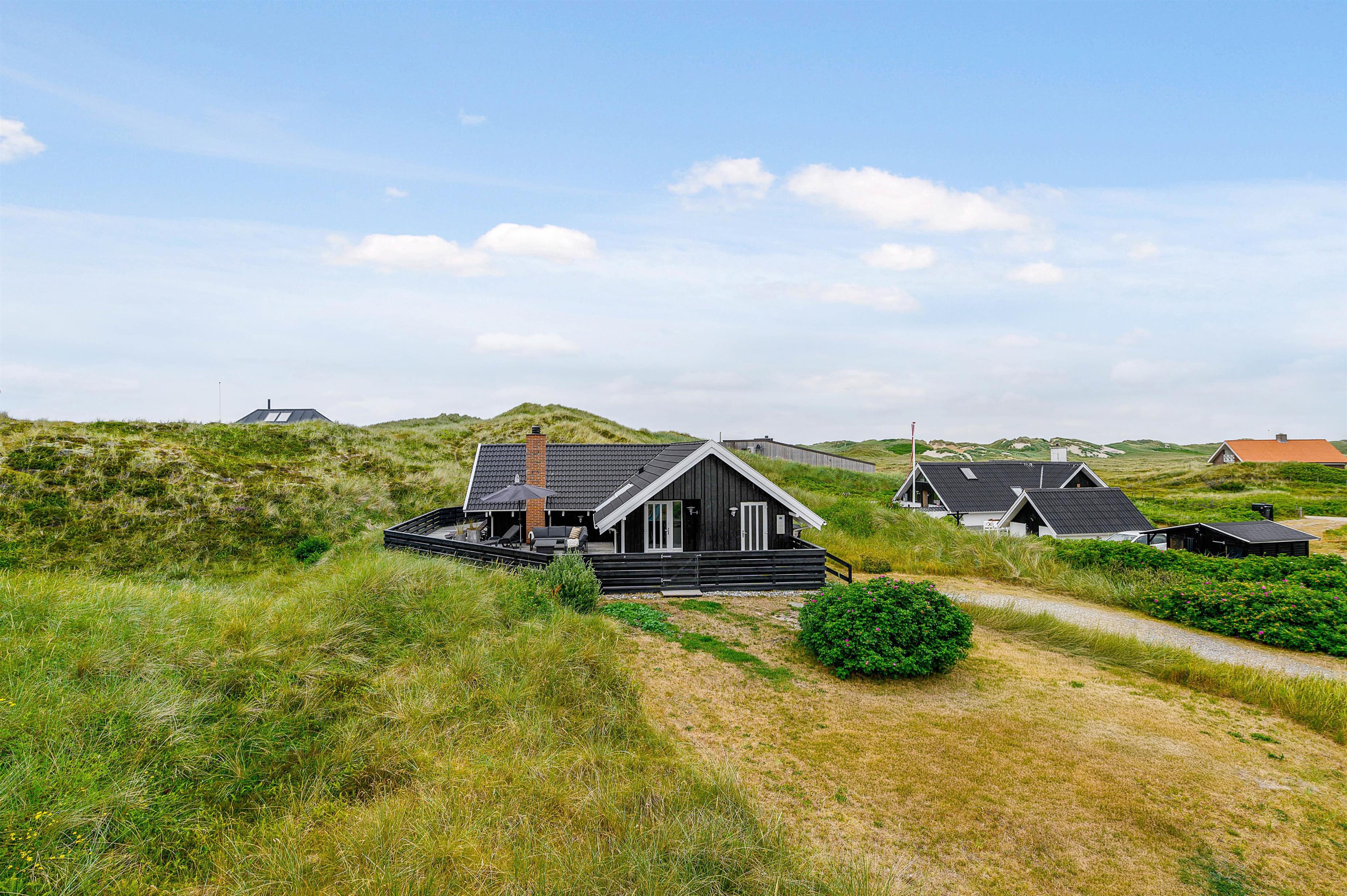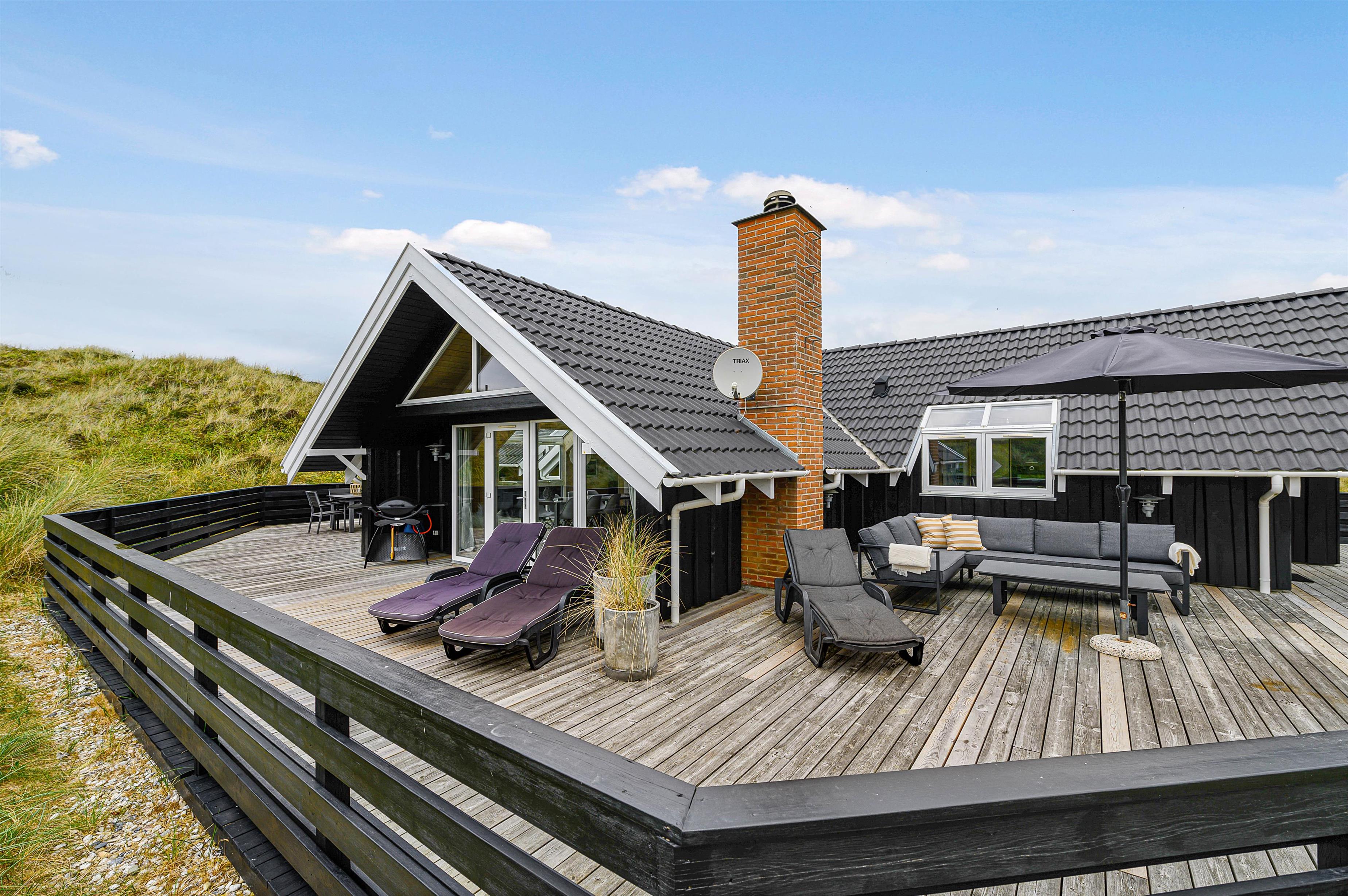 Terrassen er intet mindre end fantastisk. Den strækker sig omkring huset fra øst og mere end husets længde mod syd. Den er stor, helt lukker og delvist overdækker mod syd, så der er ofte mulighed for læ. Og området ved dette sommerhus er særdeles eftertragtet, dels fordi det ligger helt ud til det store fredede klitareal, som ligger helt op til Vesterhavet. Derudover er Søndervig centrum kun 1000 m væk, så skal der handles eller ønsker man at spise på en af byens restauranter, kan man klare dette uden at medbringe bil.