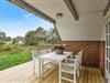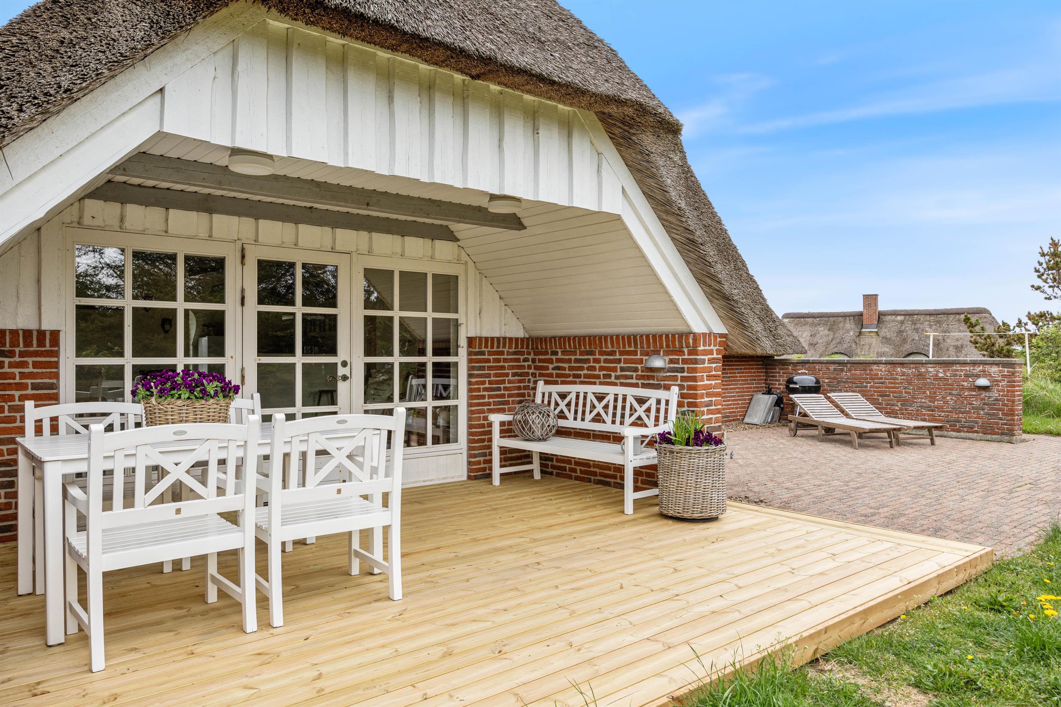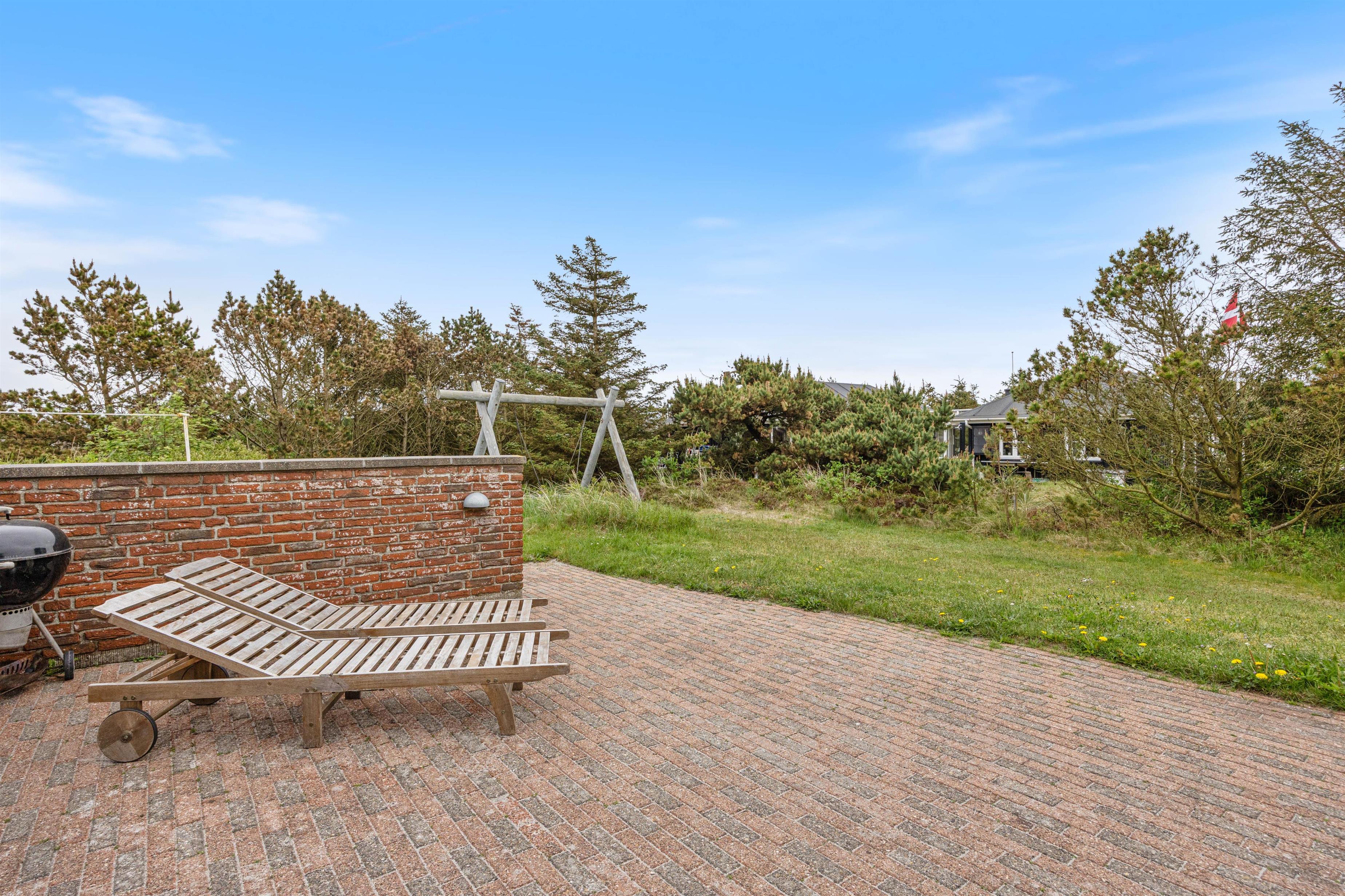 Fra stuen er der direkte udgang til den delvist overdækkede terrasse, hvor I kan nyde solens stråler eller krybe i ly for vind og vejr under taget. Det er flere hyggelige terrassekroge rundt om huset, så det er aldrig svært at finde en skøn og solrig krog, hvor I kan slå jer ned med en god bog eller en kølig forfriskning i hånden. Grunden er omkranset af træer og buske, som både skærmer jer for vind og vejr, men som også giver jer ekstra privatliv.
