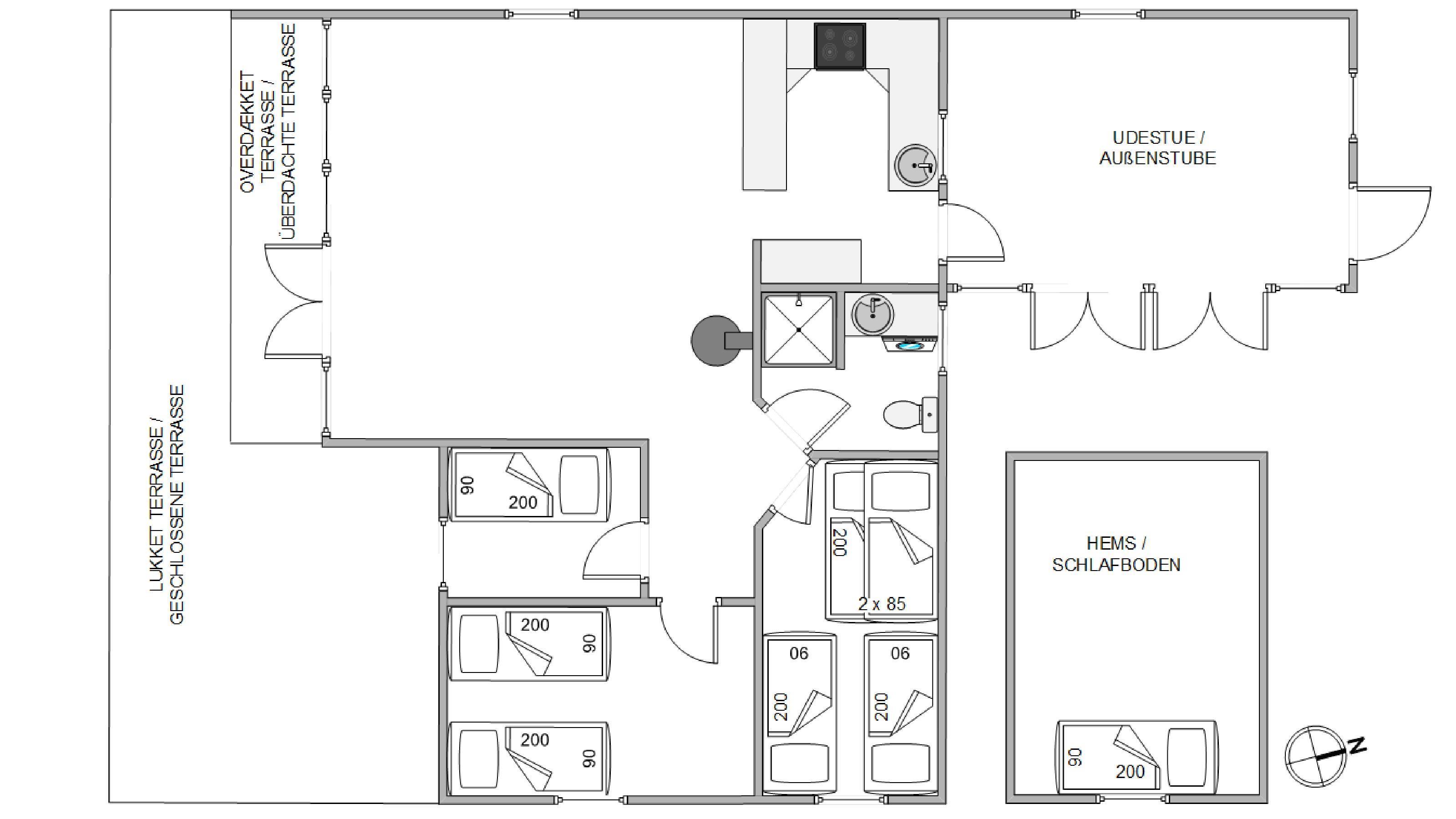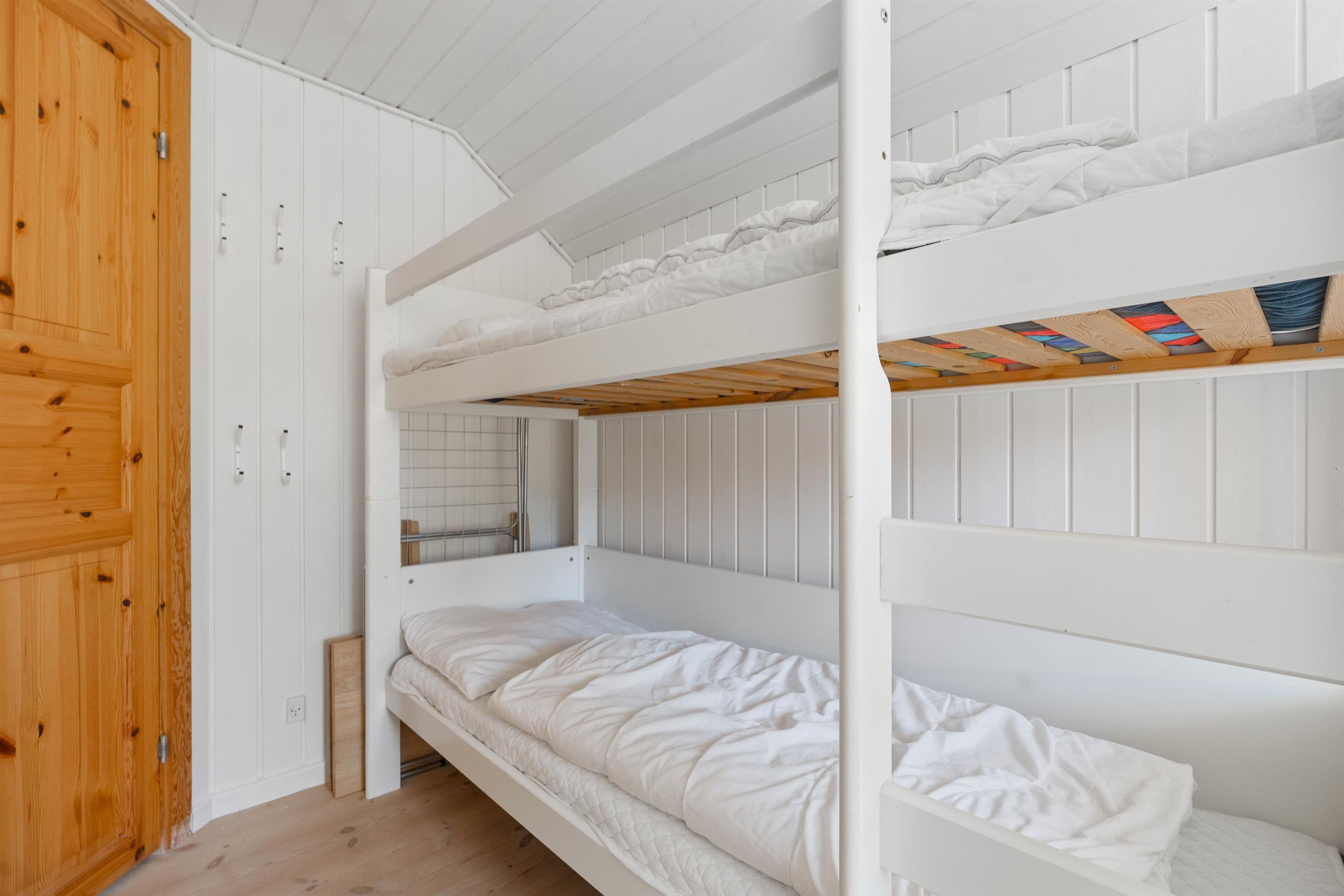 Et godt og hyggeligt sommerhus i Søndervig bygget i træ og med loft til kip, samt en god indretning. Der er tre soveværelser i sommerhuset, det ene værelse har en enkelt seng, derudover er der et værelse med to senge og endelig et værelse med to senge og to køjesenge i.