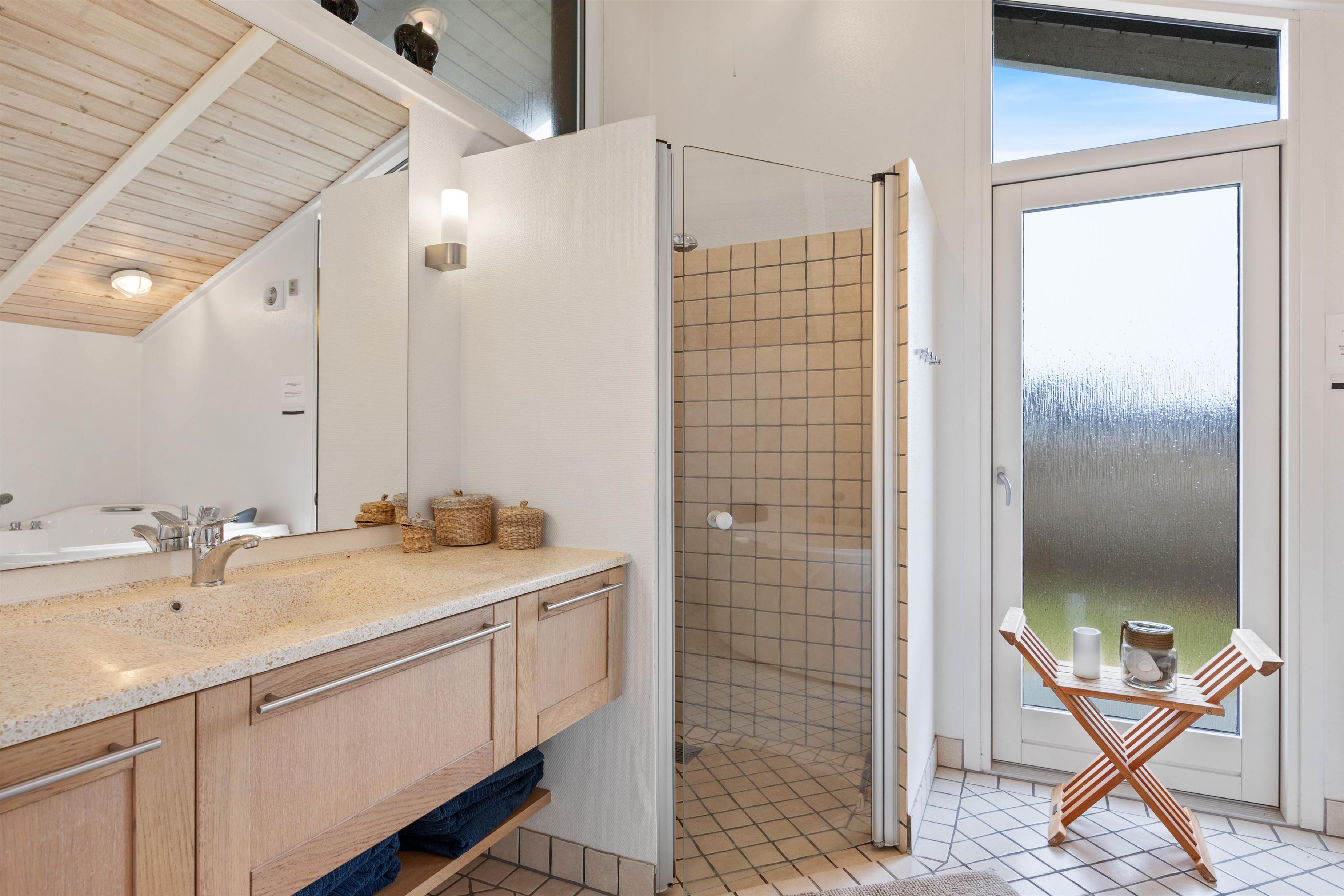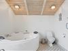 Sommerhuset har 1 badeværelse med gulvvarme og 1 gæstetoilet – så er der ingen risiko for kø til toilettet. På badeværelset er der en stor bruseniche samt feriehusets store højdepunkt; spaen. Læn jer tilbage i det varme vand og lad boblerne forkæle jer med ekstra meget afslapning.