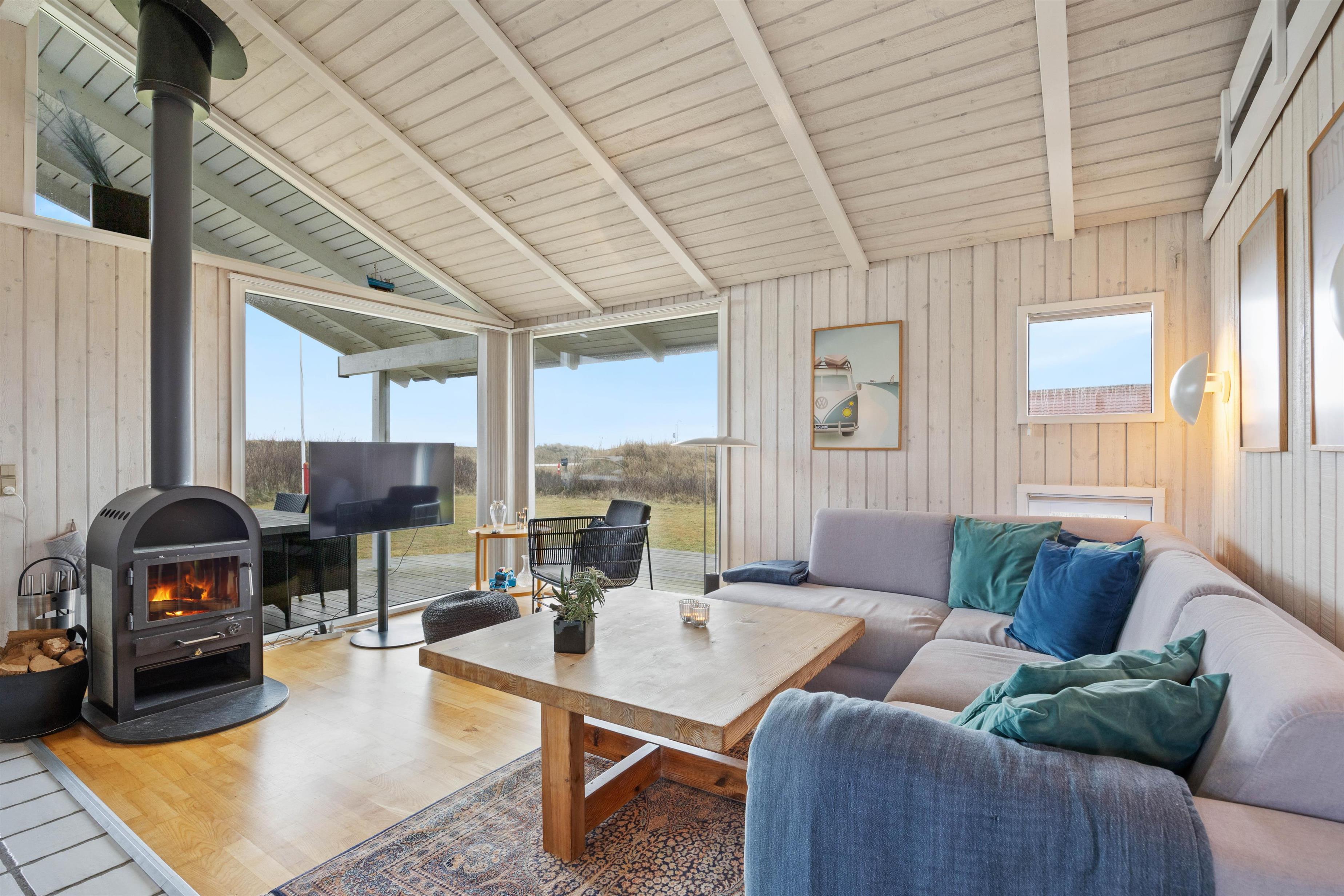 Gennem hele sommerhuset vil I møde en lys og moderne indretning, hvor de lyse trævægge, loft til kip og det store lysindfald danner rammerne for en hyggelige ferieatmosfære – I vil straks føle jer hjemme i disse dejlige omgivelser.