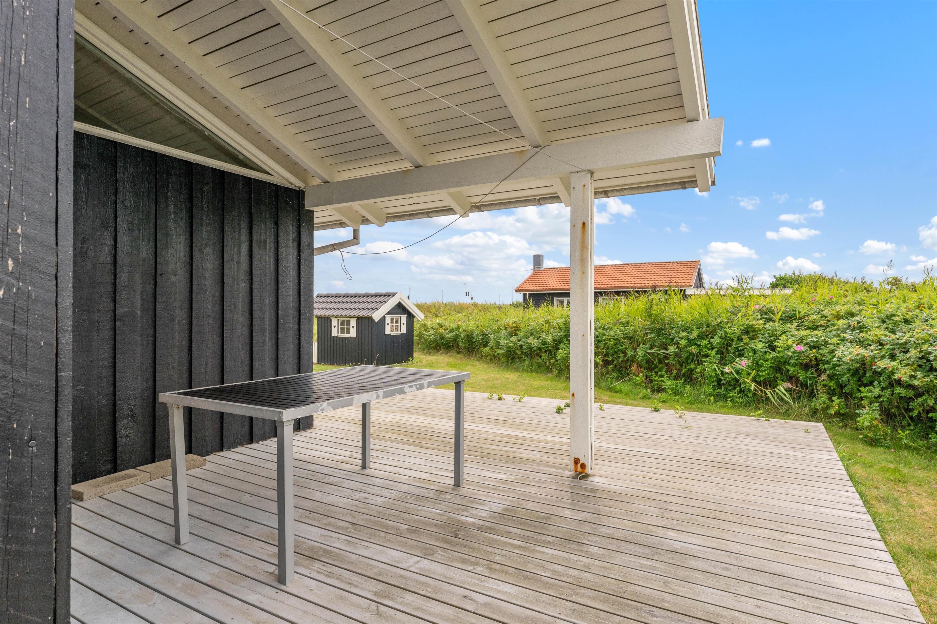 Rundt om sommerhuset løber en stor delvist overdækket terrasse. Her vil I hele dagen lang kunne finde jer en god plads i solen, hvor I kan gøre jeg tilpas i havemøbler og liggestole. Trænger I til en stund i skyggen, kan I rykke ind under den overdækkede del af terrassen.