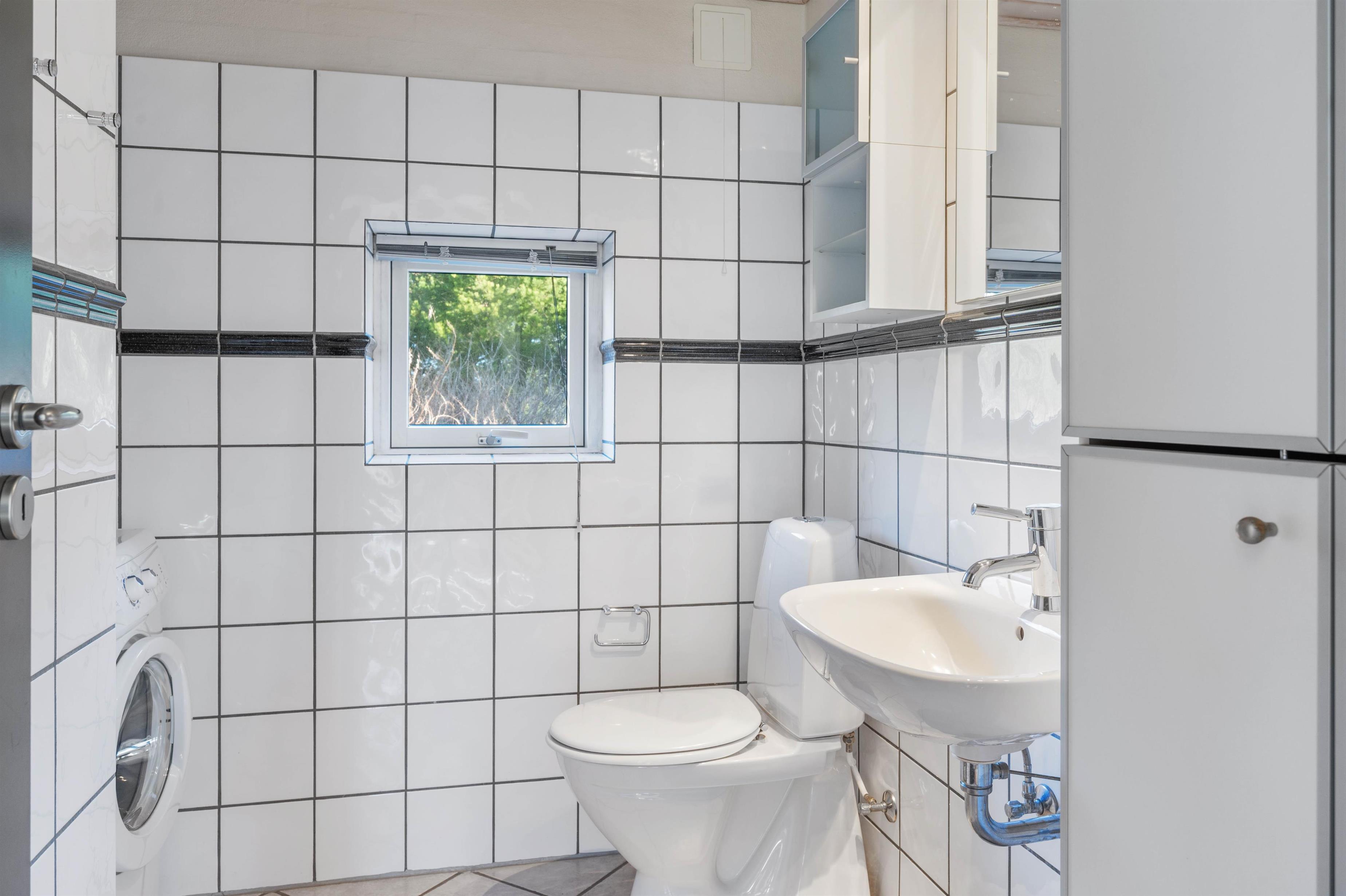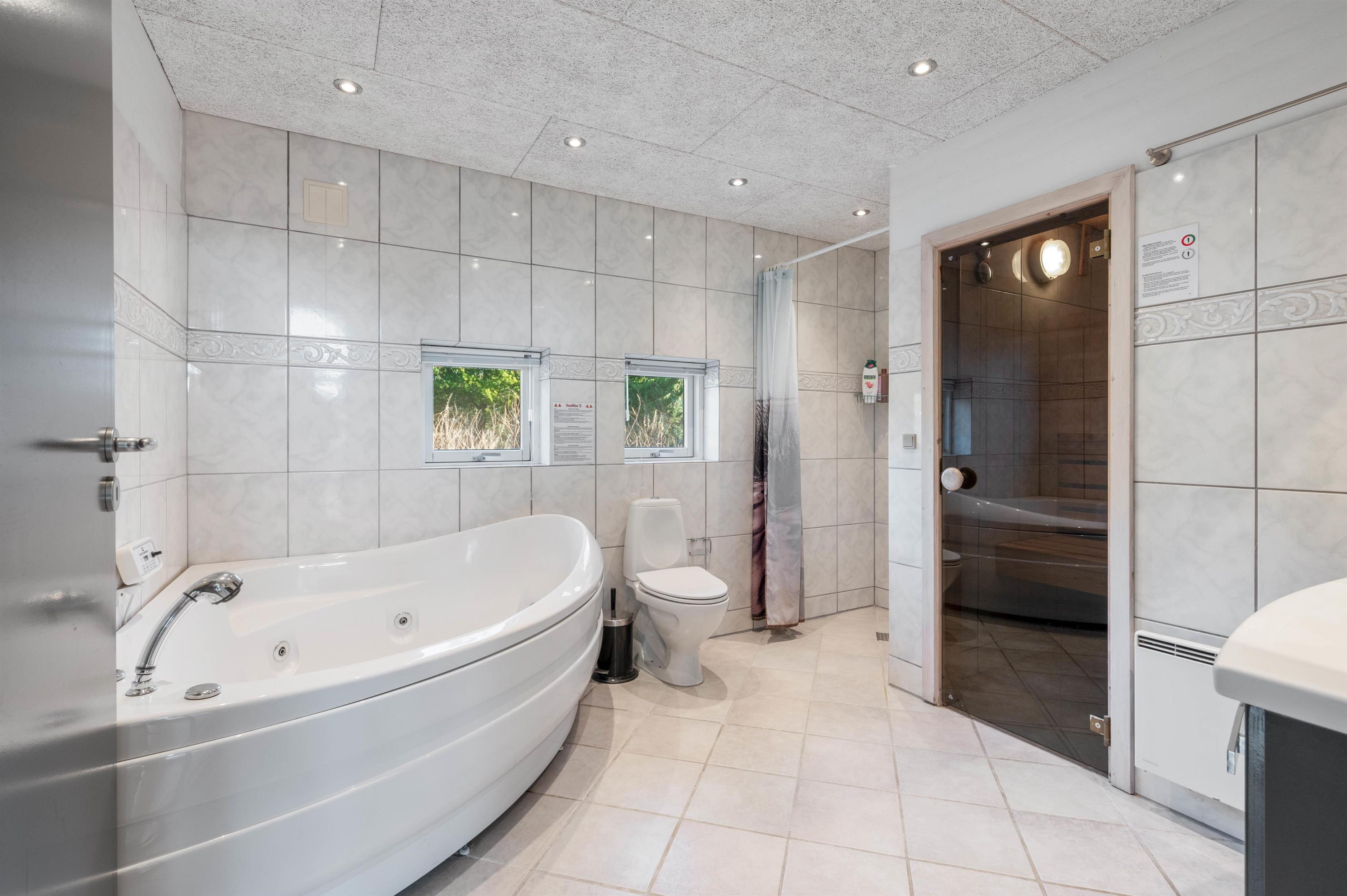 Derudover er der et stort, flot badeværelse med gulvvarme i sommerhuset. På badeværelset finder I også sommerhusets spa og sauna, hvor I kan blive forkælet med masser af afslapning på jeres ferie. Udover badeværelset er der også et gæstetoilet med gulvvarme.