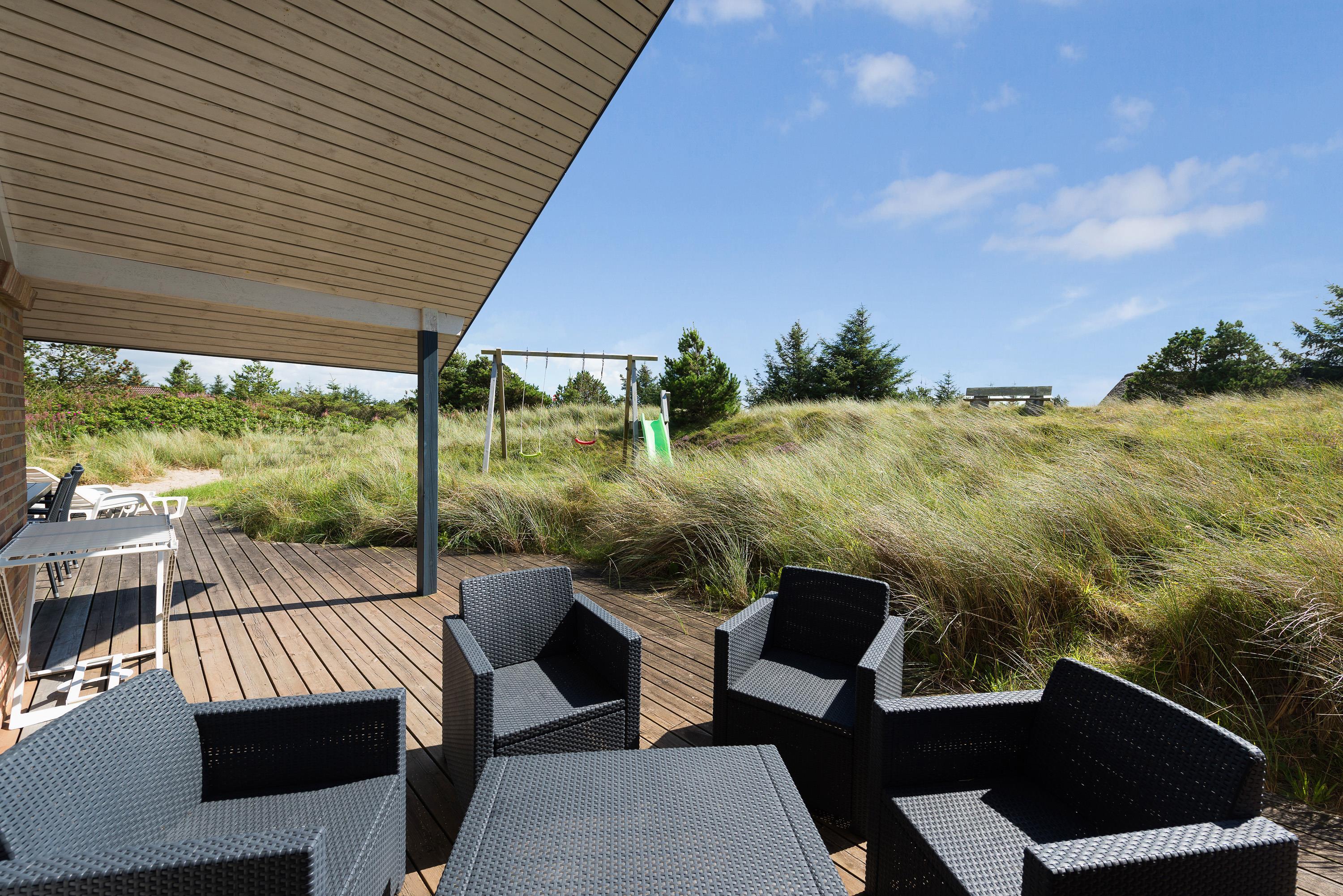 Det fine sommerhus er velbeliggende på en naturlig, afskærmet grund, hvor I uforstyrret kan nyde jeres ferie i de skønne omgivelser. Sommerhuset har en skøn, sydvendt terrasse, som er udstyret med havemøbler, liggestole og grill til en rigtig dasedag eller en hyggelig grillaften. På terrassen er der også flere gode lækroge.