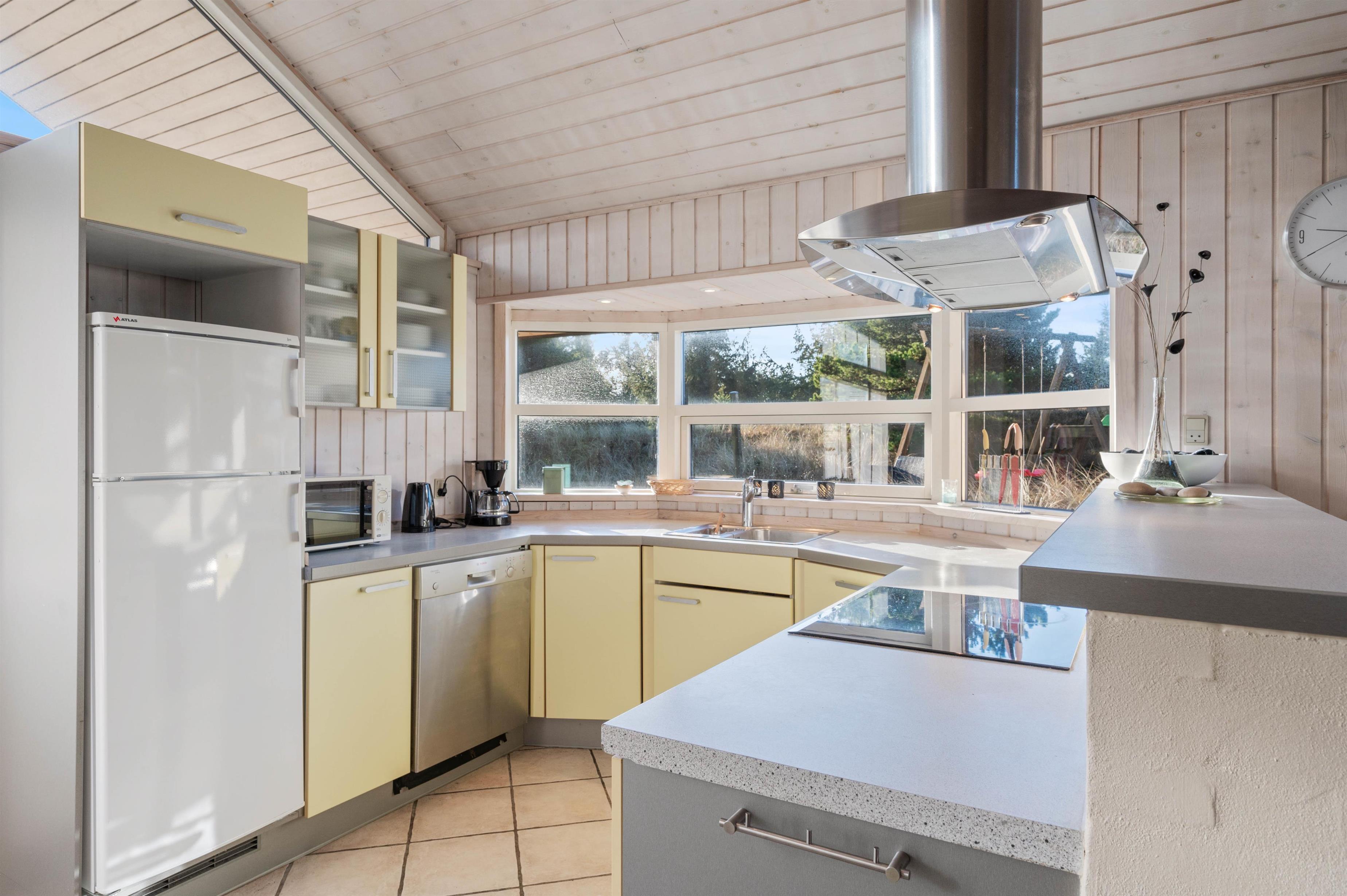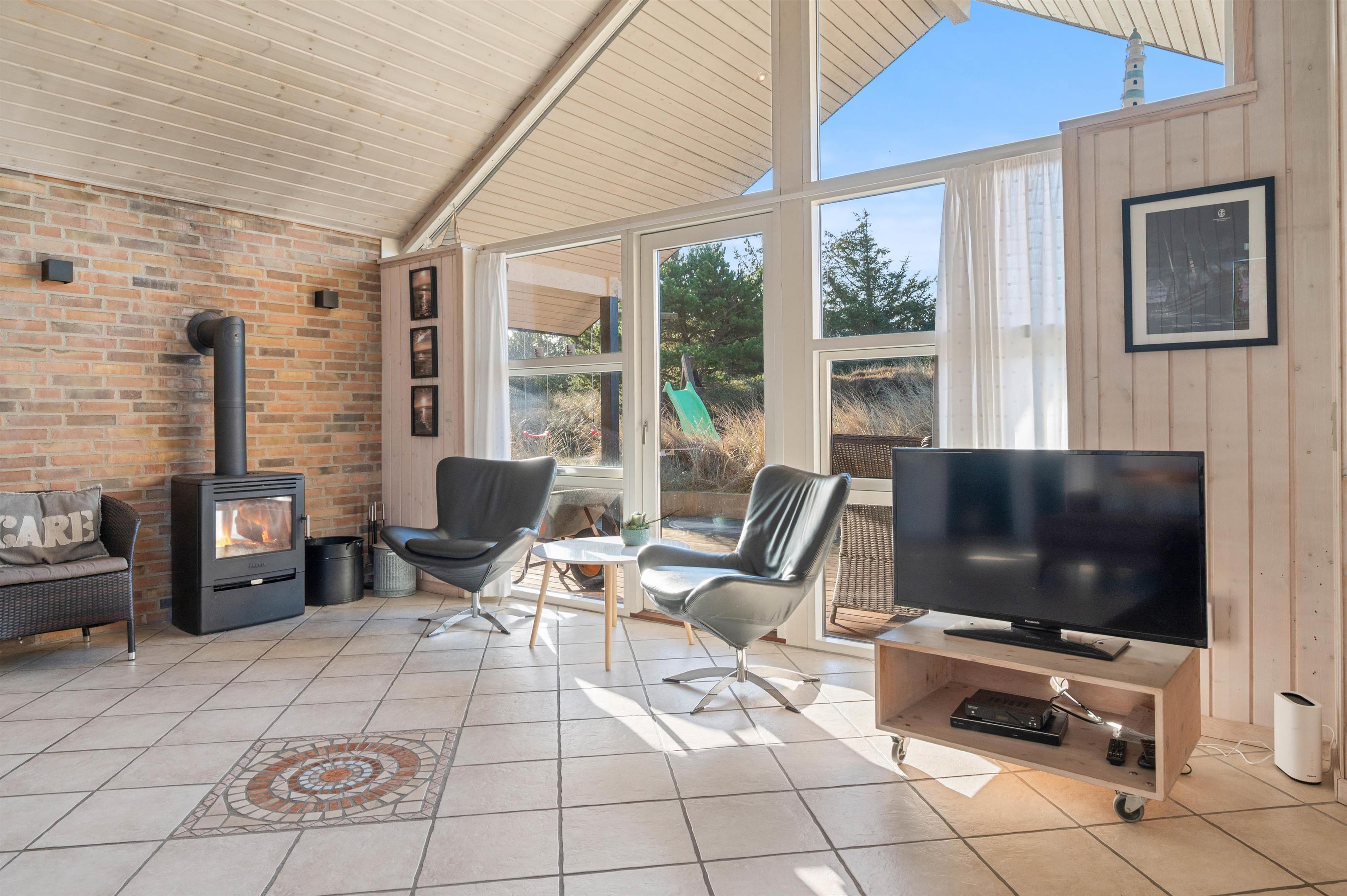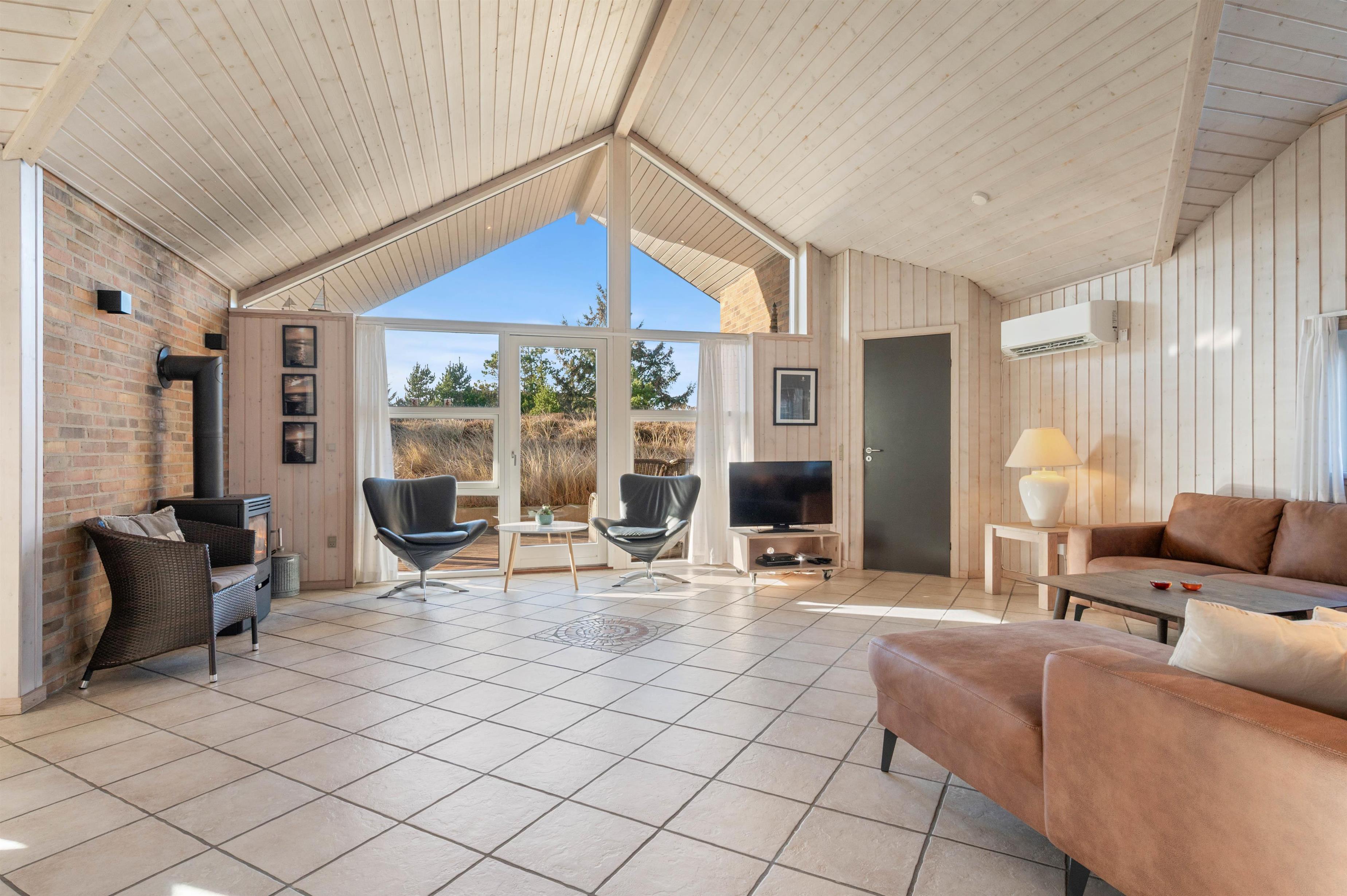 Sommerhusets store og veludstyrede køkken ligger i åben forbindelse med spisestue og stue, hvor I utvivlsomt vil komme til at tilbringe mange hyggelige og dejlige feriestunder. Her sørger brændeovnen desuden for at sætte prikken over i’et for feriestemningen. Derudover sørger den installerede luft-luft varmepumpe for et behageligt indeklima i sommerhuset.