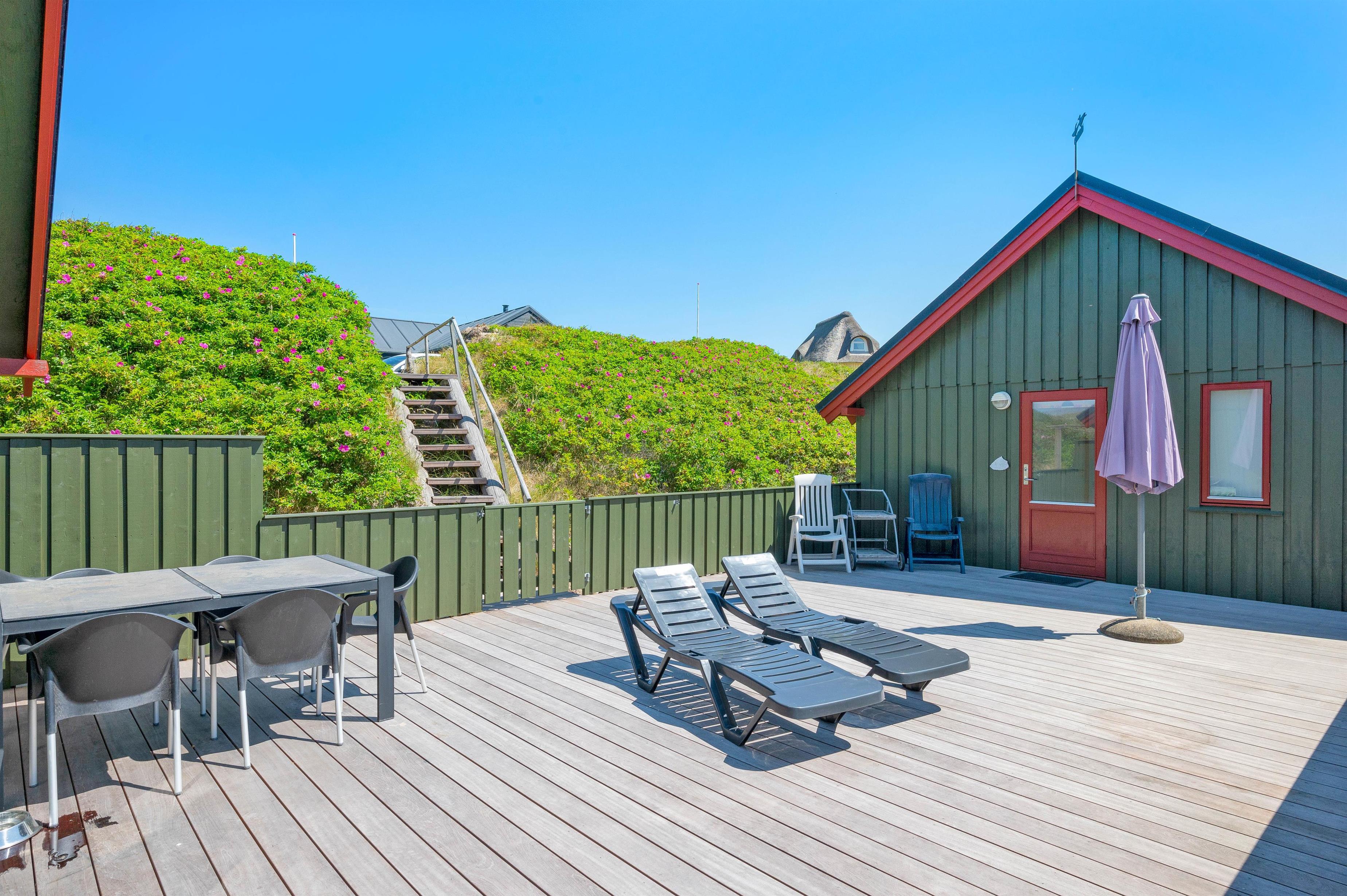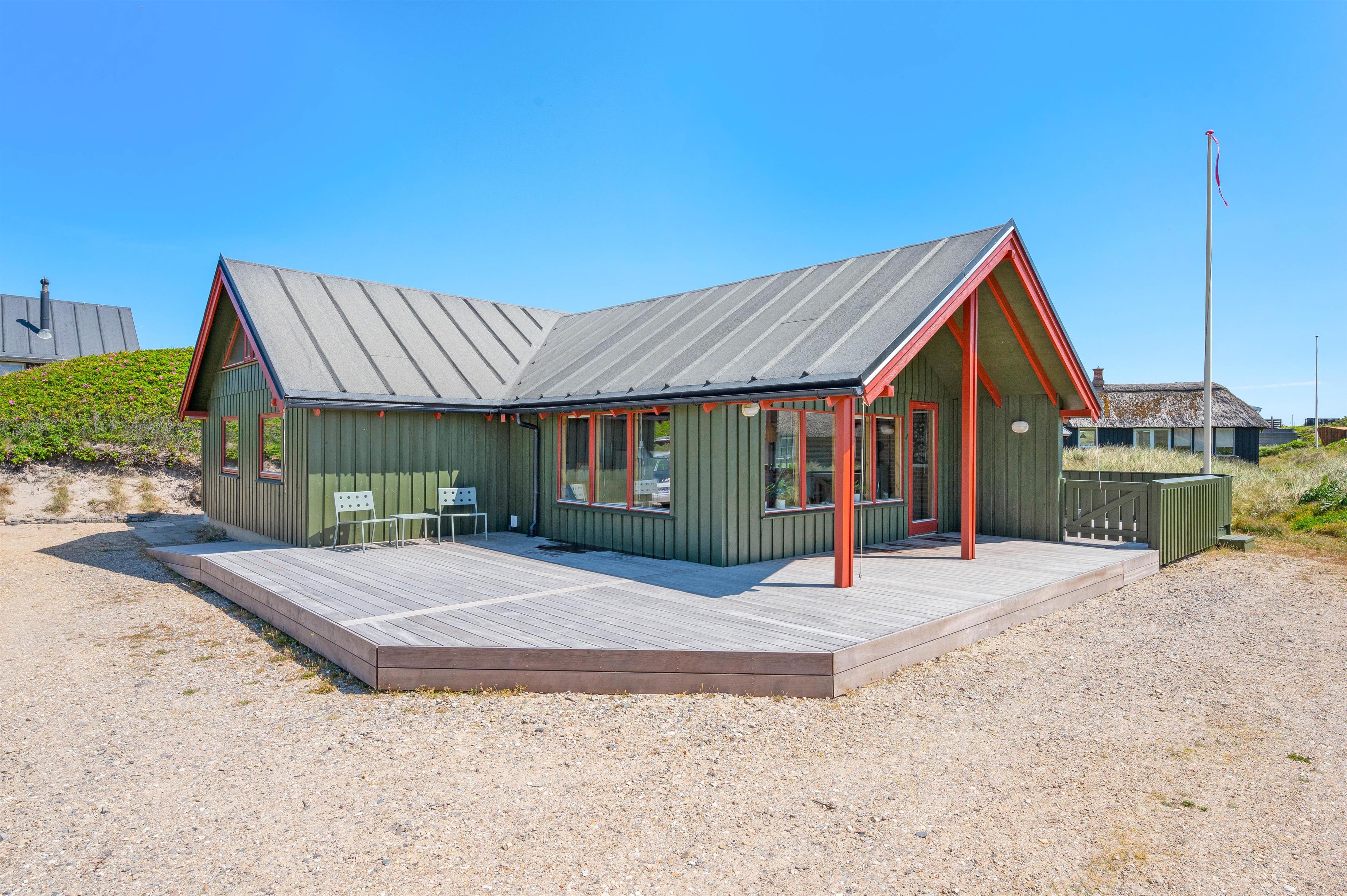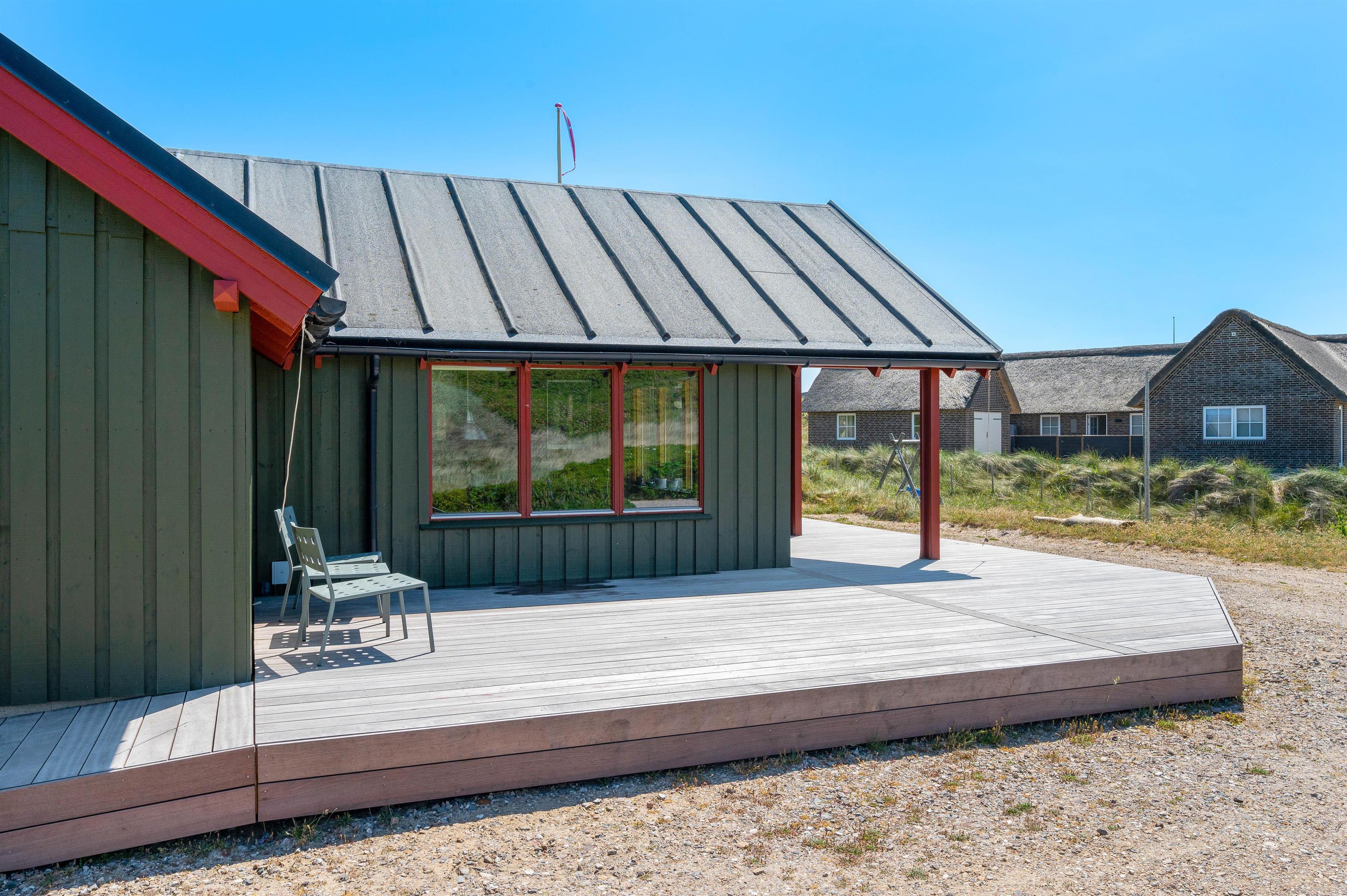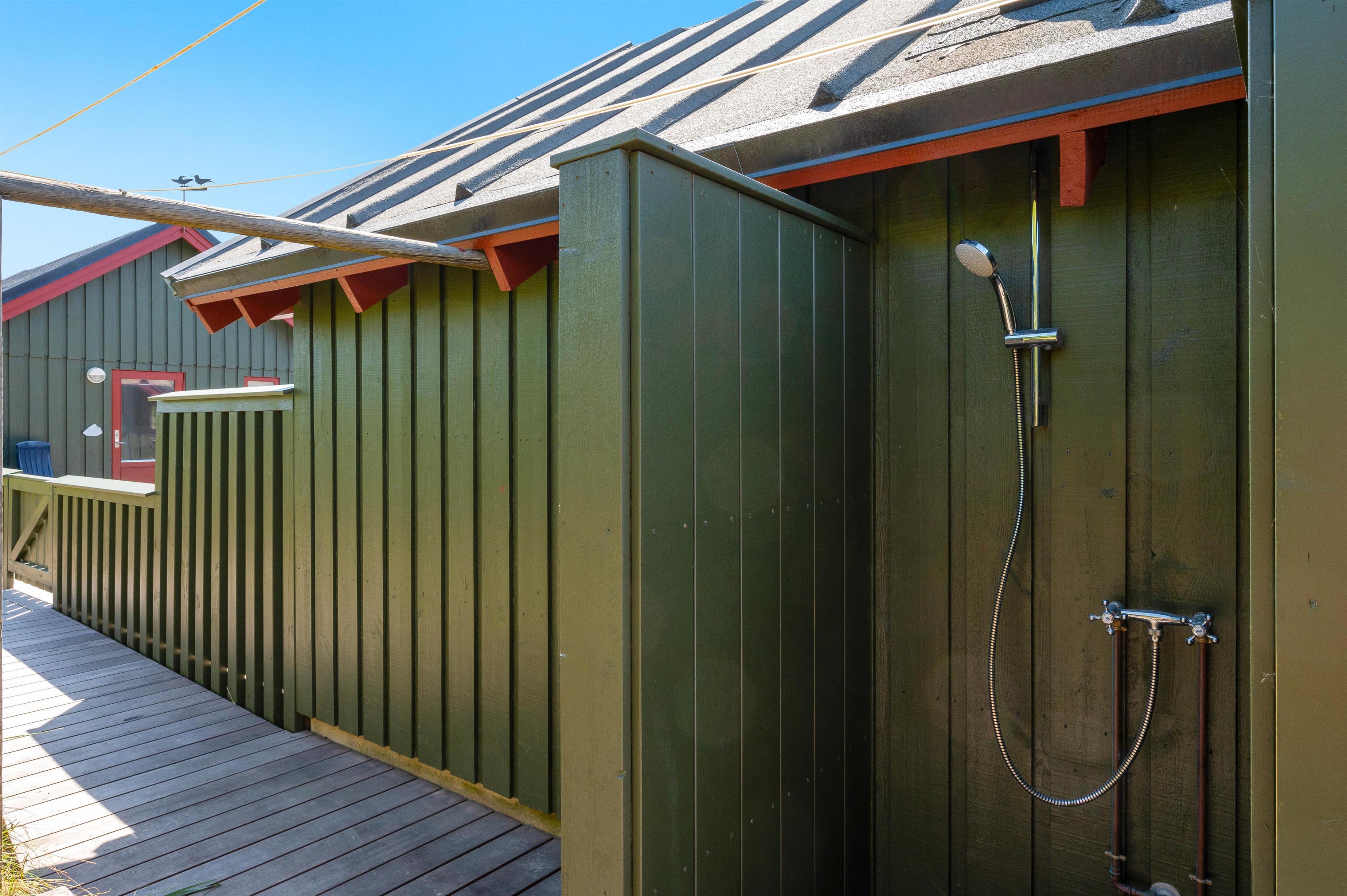 Grundet husets fantastiske beliggenhed er der garanti for bølgebrus i baggrunden. På husets lukkede terrasse kan I nyde morgenmaden under åben himmel og langsomt vågne op til endnu en god dag i det jyske. Også en fordel er, at terrassen på den anden side er delvist overdækket og er perfekt til en mere blæsende dag. Et gyngestativ og sandkasse er højdepunktet for børnene! Desuden er der monteret en udebruser ved feriehuset, hvor I efter en dejlig tur ved stranden igen kan skylle sandet af kroppen. Udebruseren kan bruges fra april måned til november måned.
