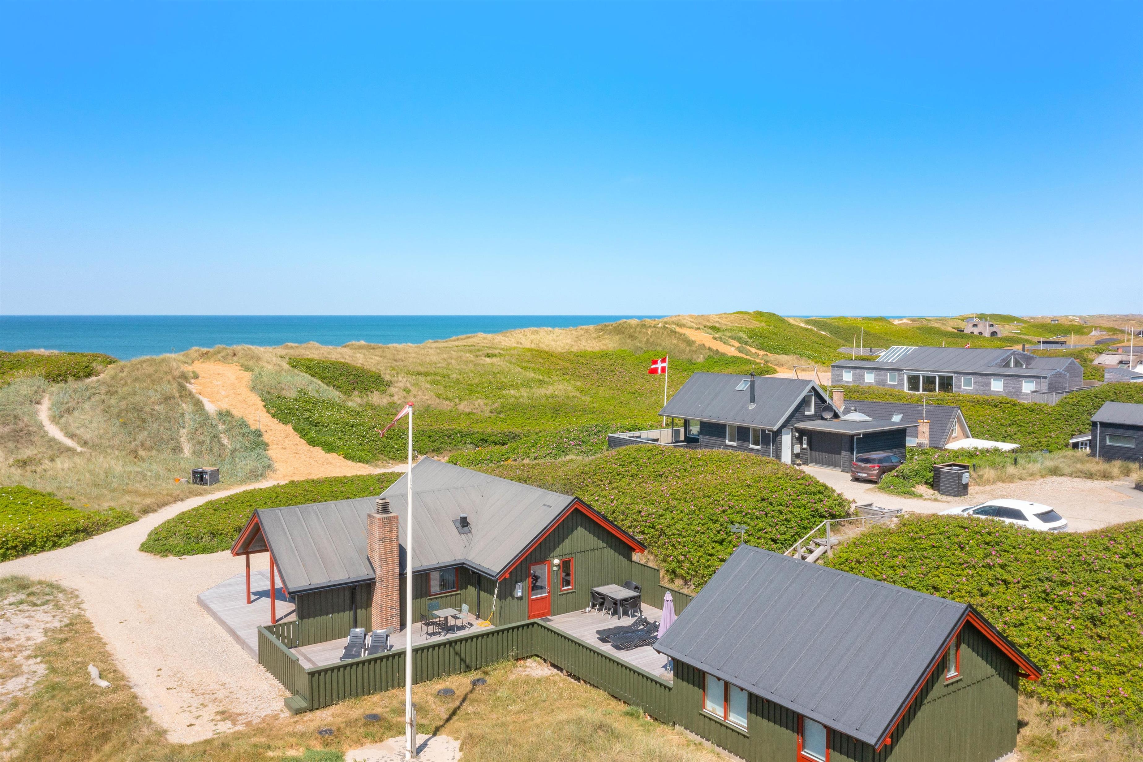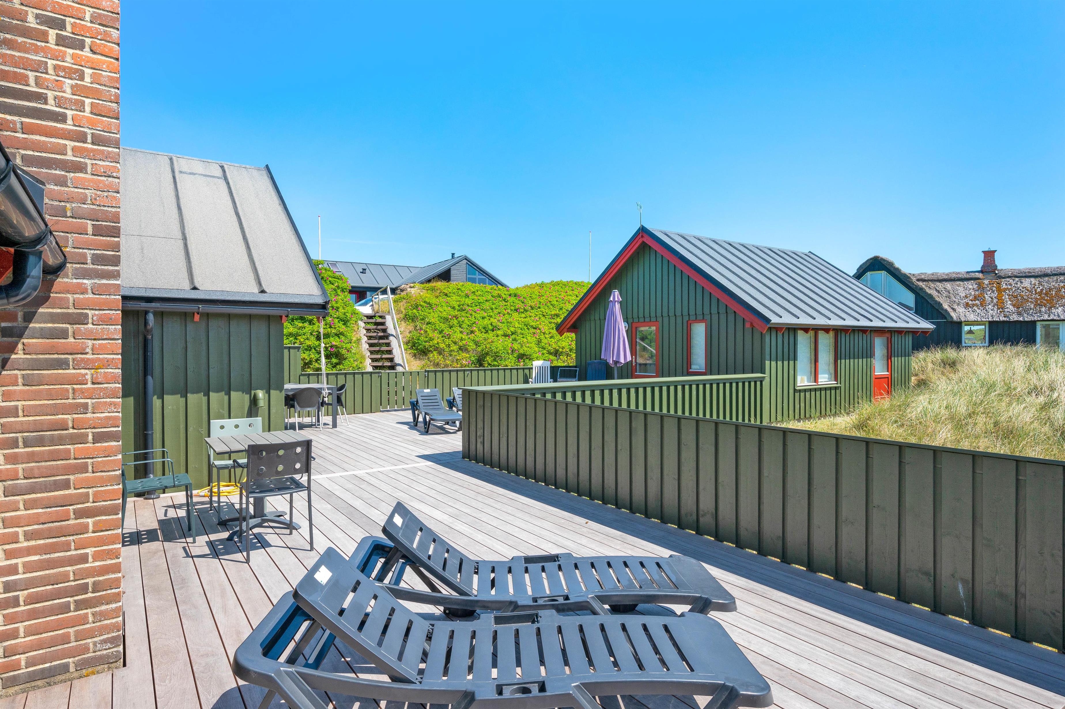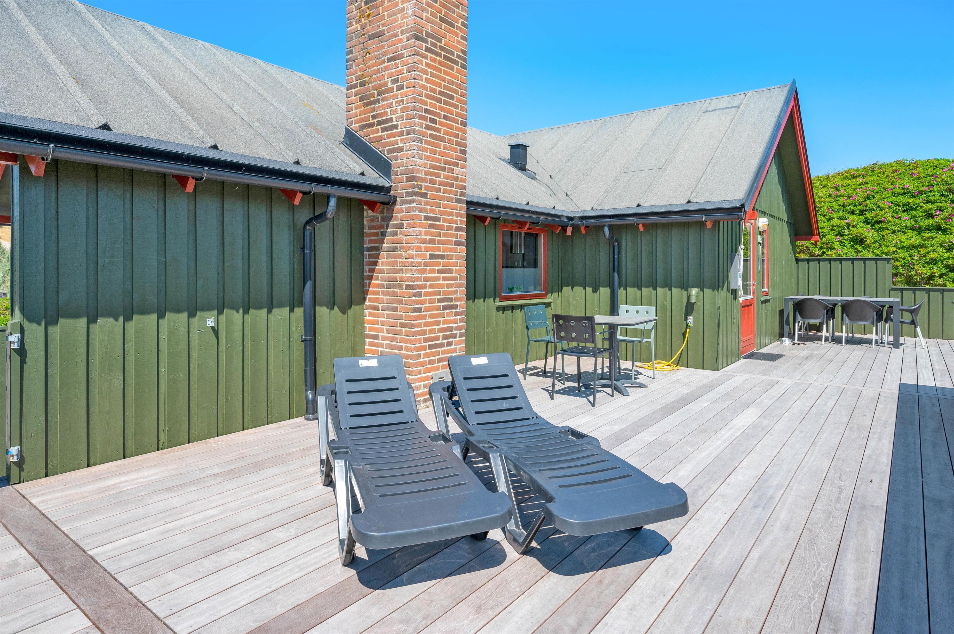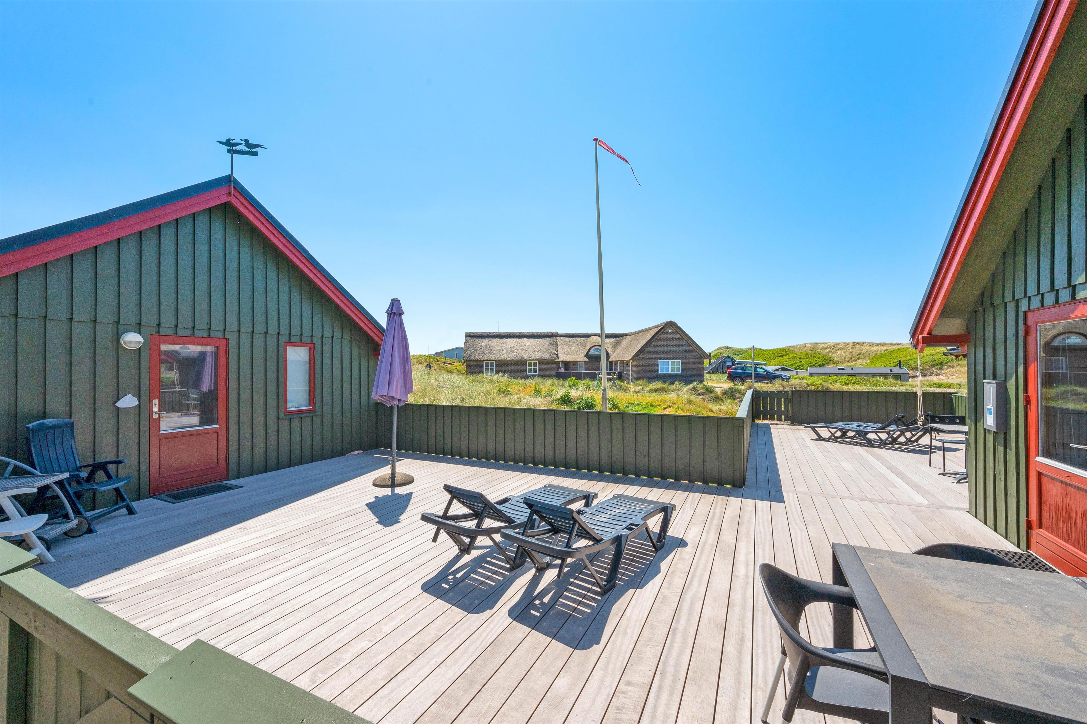 Grundet husets fantastiske beliggenhed er der garanti for bølgebrus i baggrunden. På husets lukkede terrasse kan I nyde morgenmaden under åben himmel og langsomt vågne op til endnu en god dag i det jyske. Også en fordel er, at terrassen på den anden side er delvist overdækket og er perfekt til en mere blæsende dag. Et gyngestativ og sandkasse er højdepunktet for børnene! Desuden er der monteret en udebruser ved feriehuset, hvor I efter en dejlig tur ved stranden igen kan skylle sandet af kroppen. Udebruseren kan bruges fra april måned til november måned.