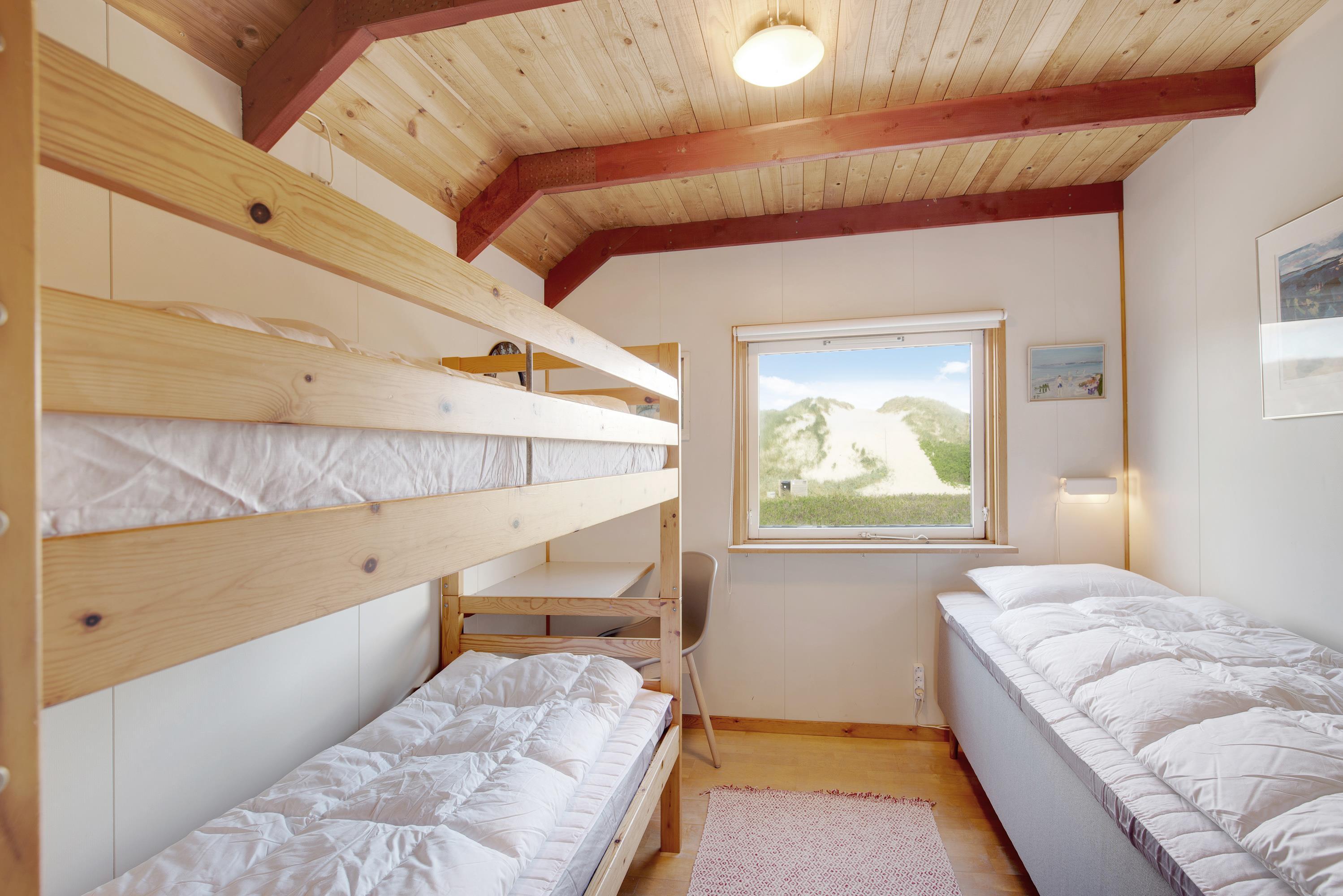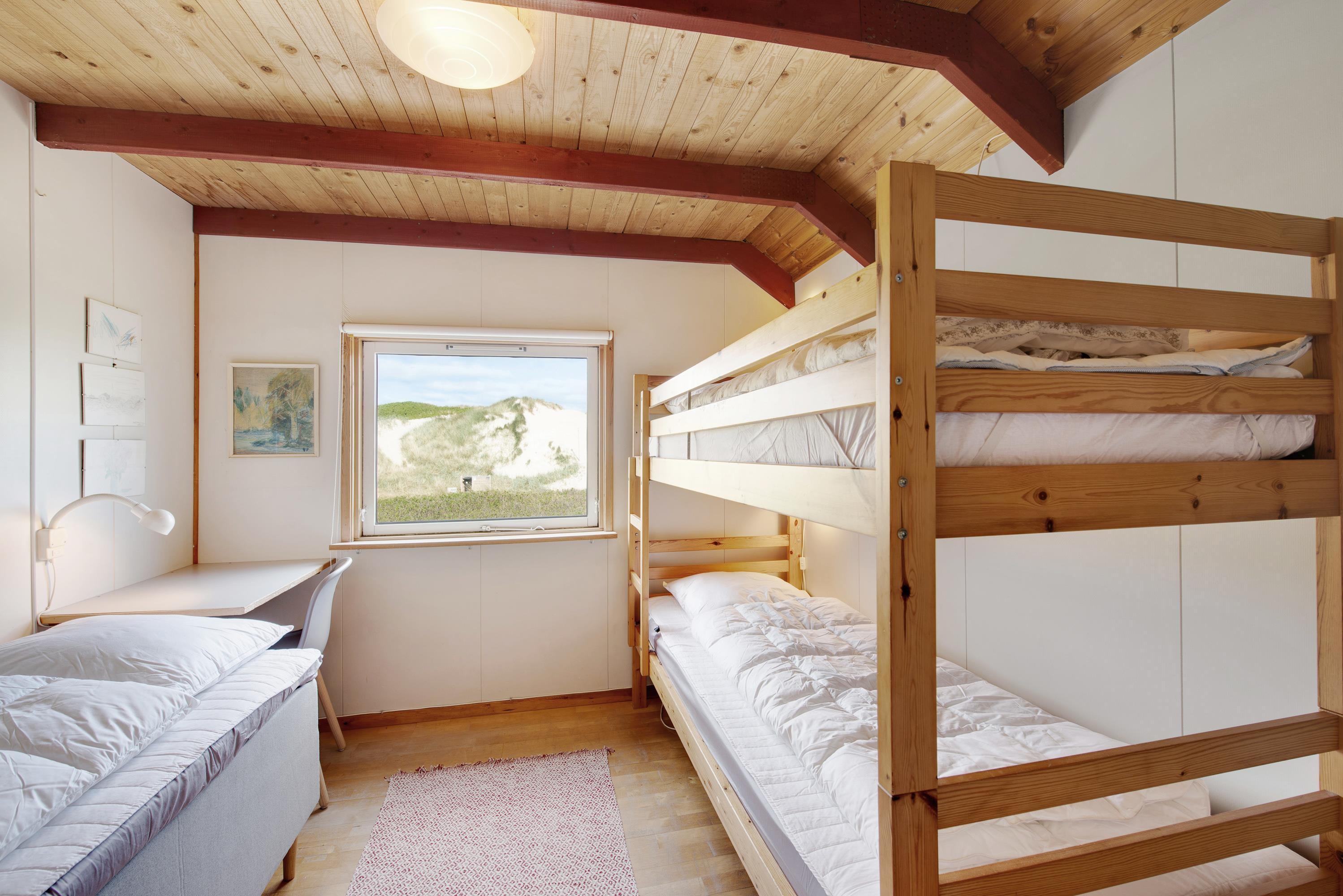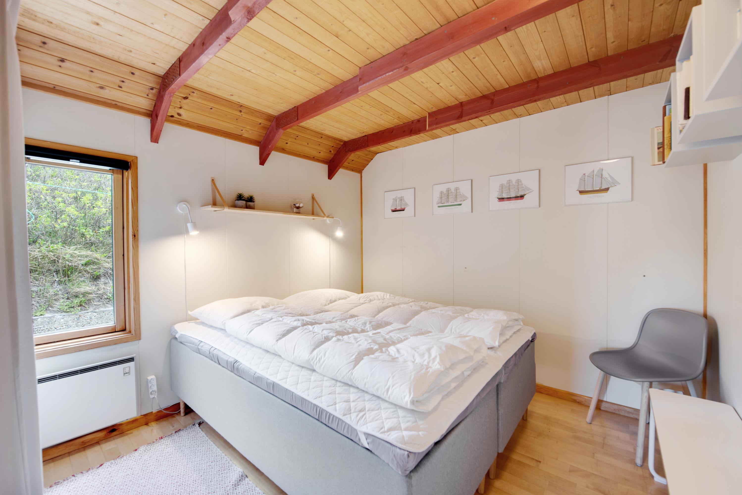 Husets 6 sovepladser er fordelt over 3 soveværelser. 2 af soveværelserne har enkeltsenge og den sidste er udstyret med en dobbeltseng. Udover de 3 soveværelser er der et rummeligt badeværelse med gulvvarme. Efter en dag ud i den friske havluft kan I blive varmet godt igennem i saunaen, som ligger i forlængelse af badeværelset.