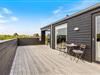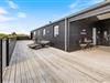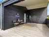 Sommerhuset imponerer ikke kun indenfor. Udenfor finder I nemlig en skøn træterrasse, som er fuldstændig lukket. Terrassen lægger op til masser af gode udestunder her på vestkysten. Dele af den er helt overdækket og afskærmet, hvilket er med til at forlænge udetiden for jer, da I her kan nyde en hyggelige grillmiddag til langt ud på aftenen. For jeres komfort og velvære, er her naturligvis også solvogne og andre havemøbler som I kan slappe af på. Fordi at terrassen er så stor og lukket, kan I også uden bekymringer lade børnene lege her, eller lade hunden gå og nyde noget friskt luft.