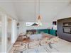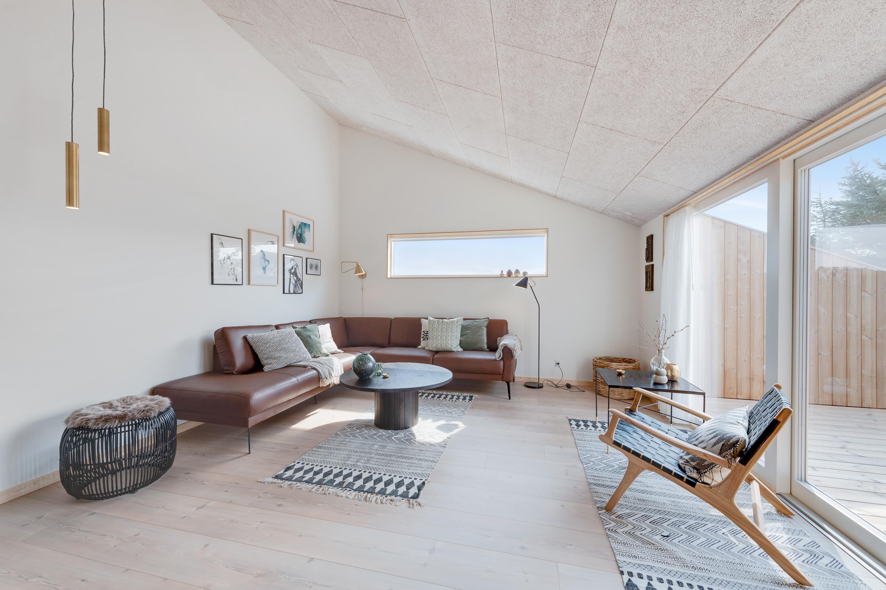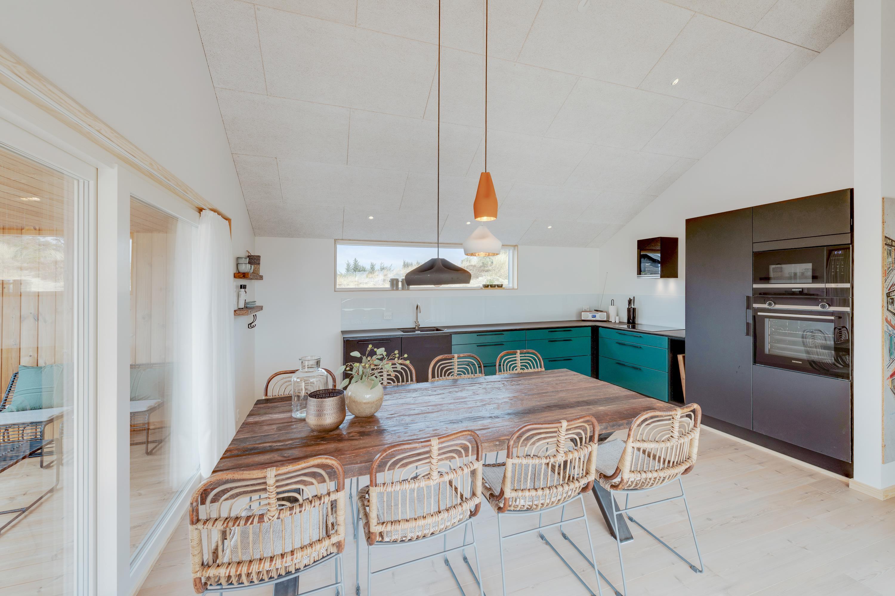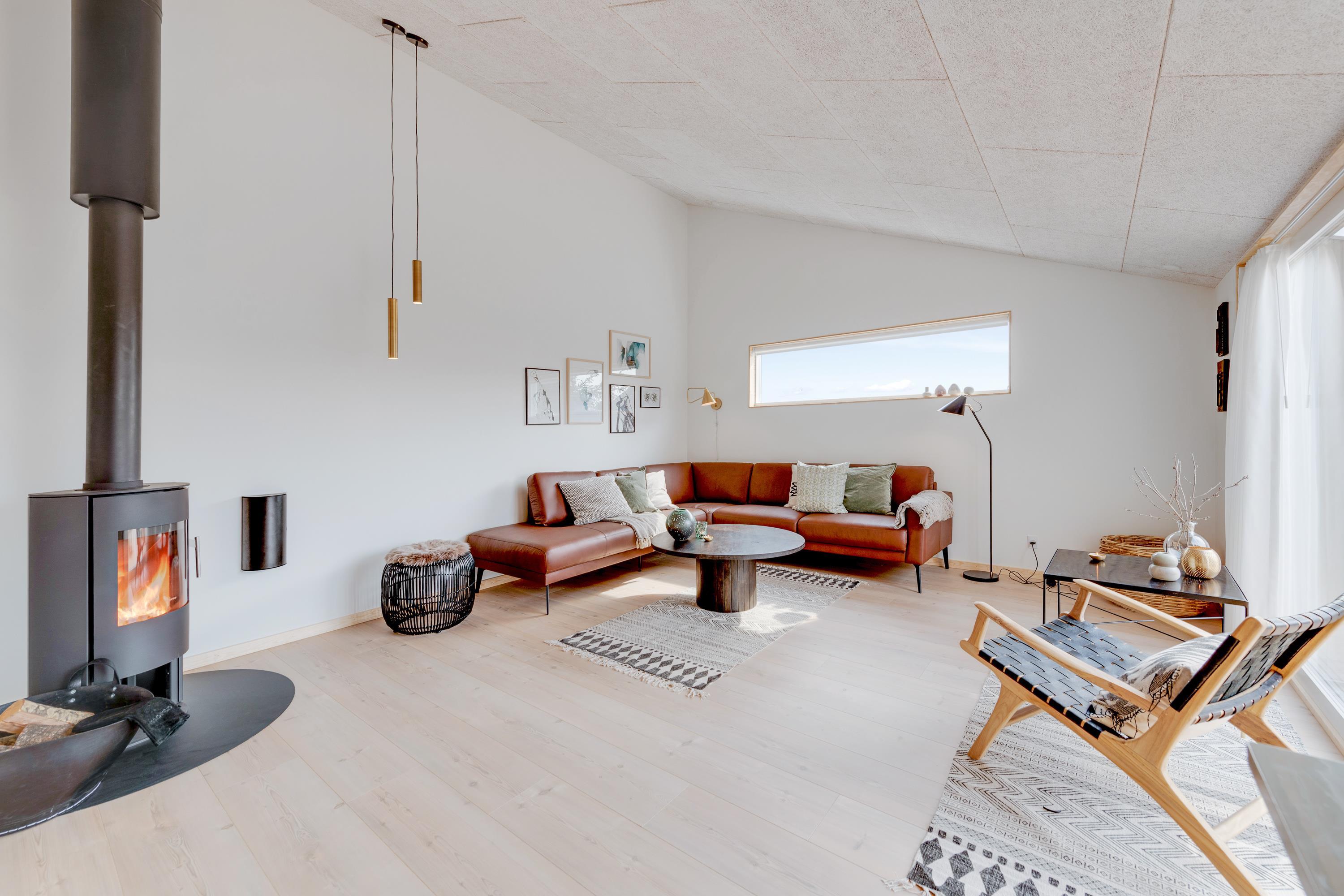 Stuen og køkkenet ligger i åben forbindelse med hinanden, og her sørger store vinduespartier for lys og udsyn til den flotte natur. Her er der også rig mulighed for at bruge ferietiden sammen.