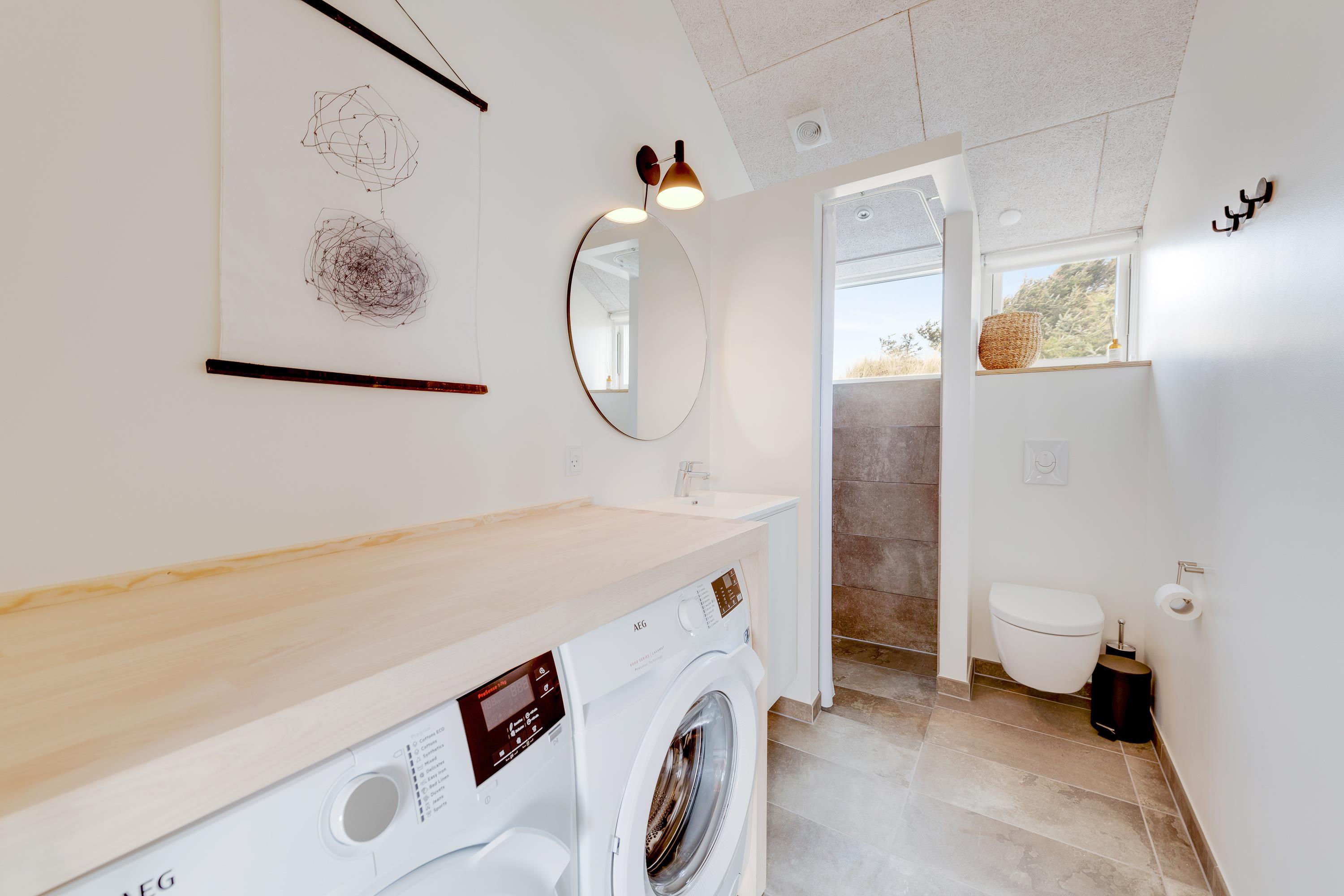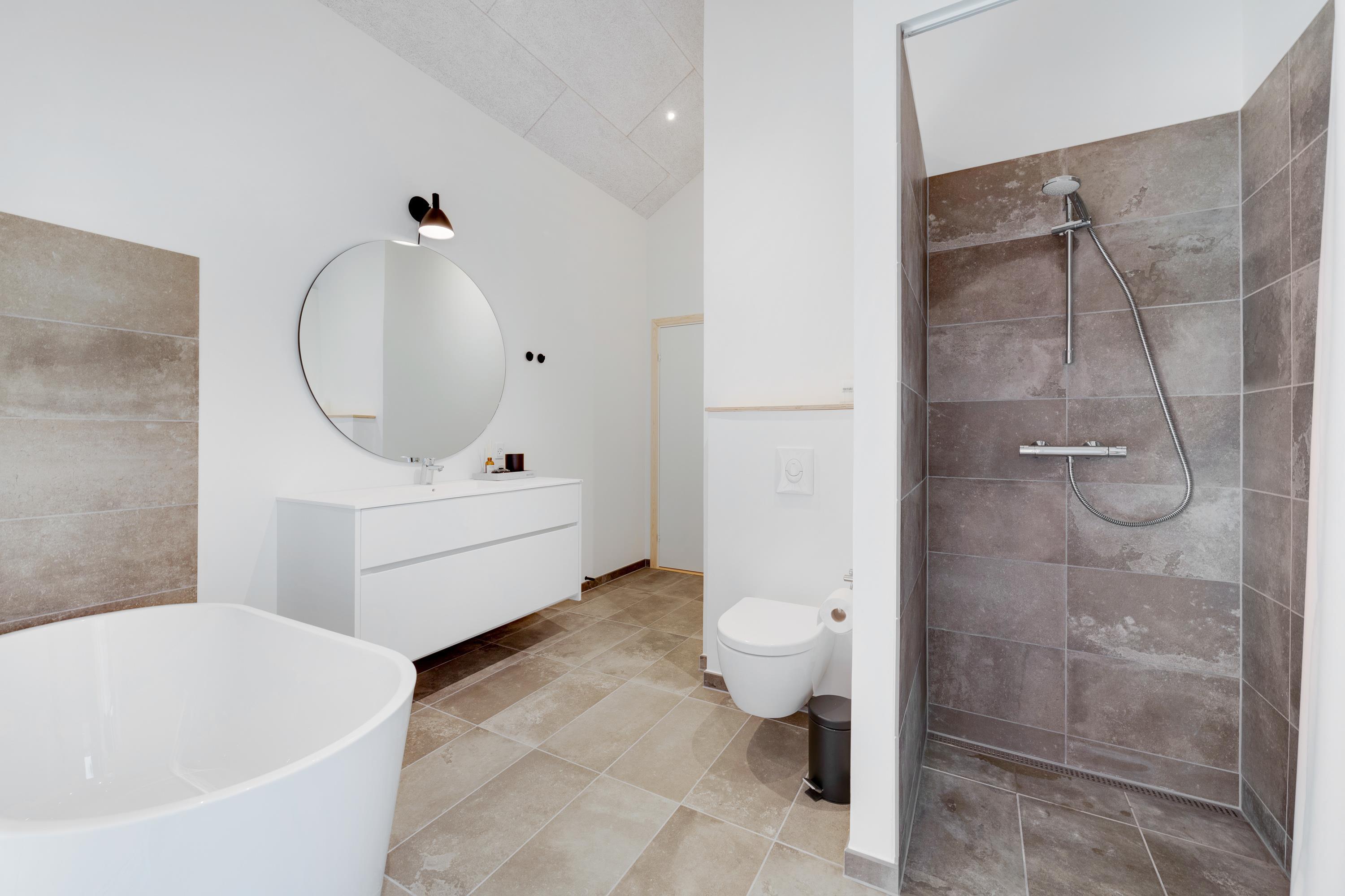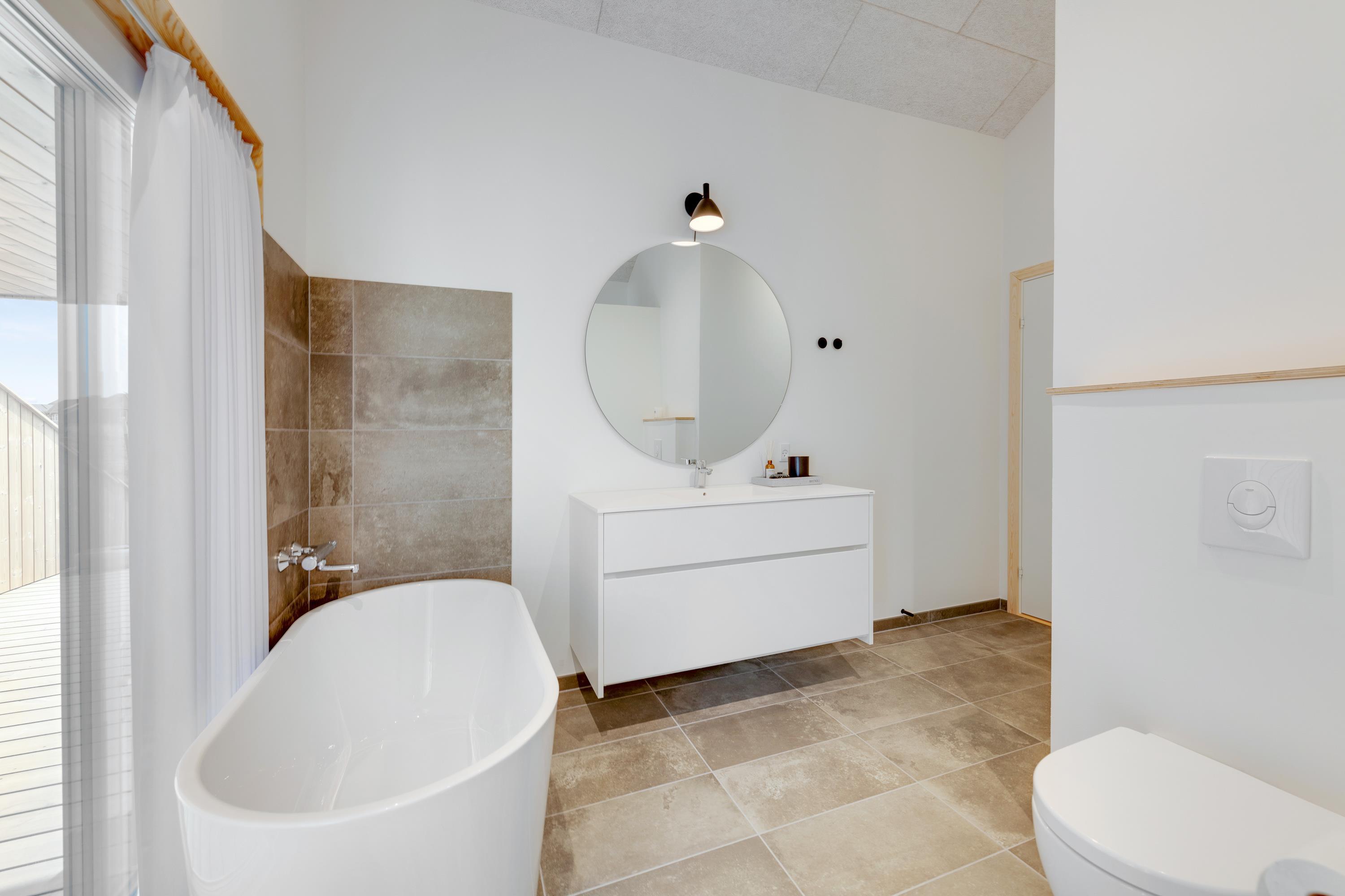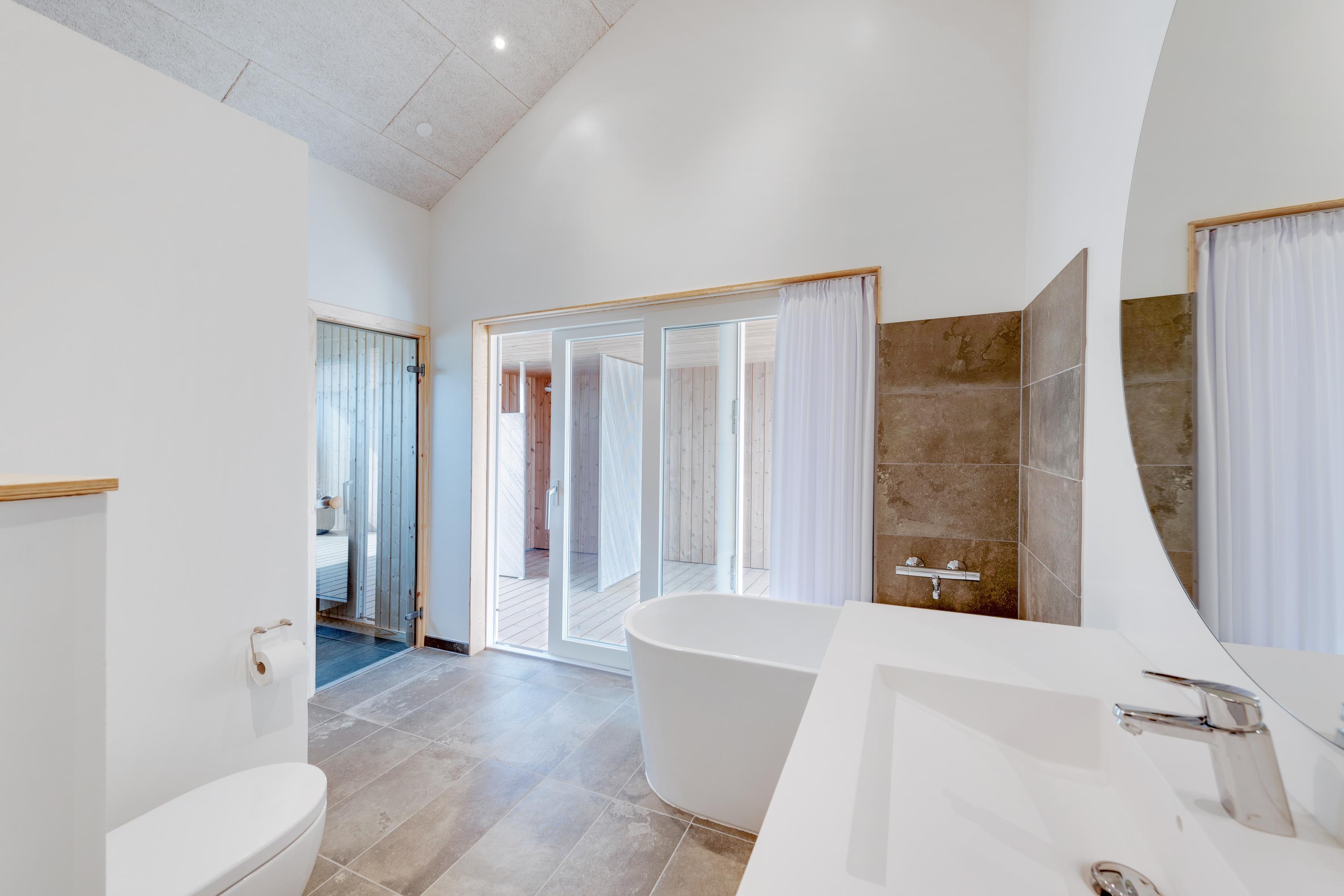 Huset er rigtig praktisk indrettet med 2 badeværelser, og på det største badeværelser er der både badekar og tilgang til saunaen, hvor I kan forkæle jer selv lidt ekstra på ferien med wellness og velvære i top.