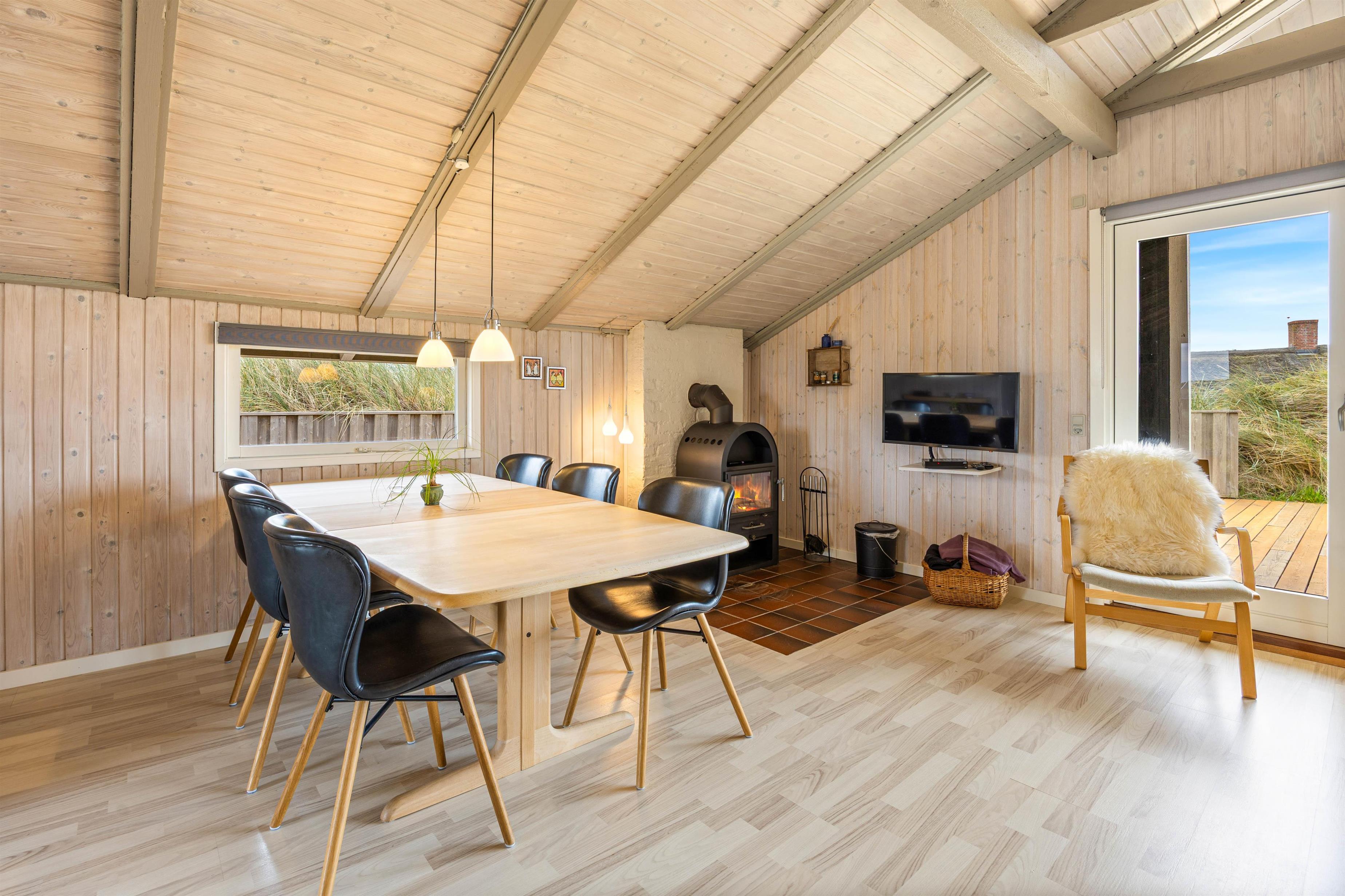 Midt i Søndervigs flotte klitlandskab, kun 400 meter fra det brusende Vesterhav, ligger dette klassiske sommerhus og venter på jer. Sommerhuset er løbende blevet renoveret, senest i 2020, og har et virkelig indbydende indre med blandt andet brændeovn og 2 badeværelser. En stor træterrasse omgiver hele feriehuset, og prikken over i’et er den skønne beliggenhed på en kuperet klitgrund, hvor I ugeneret kan nyde udsigten til området.