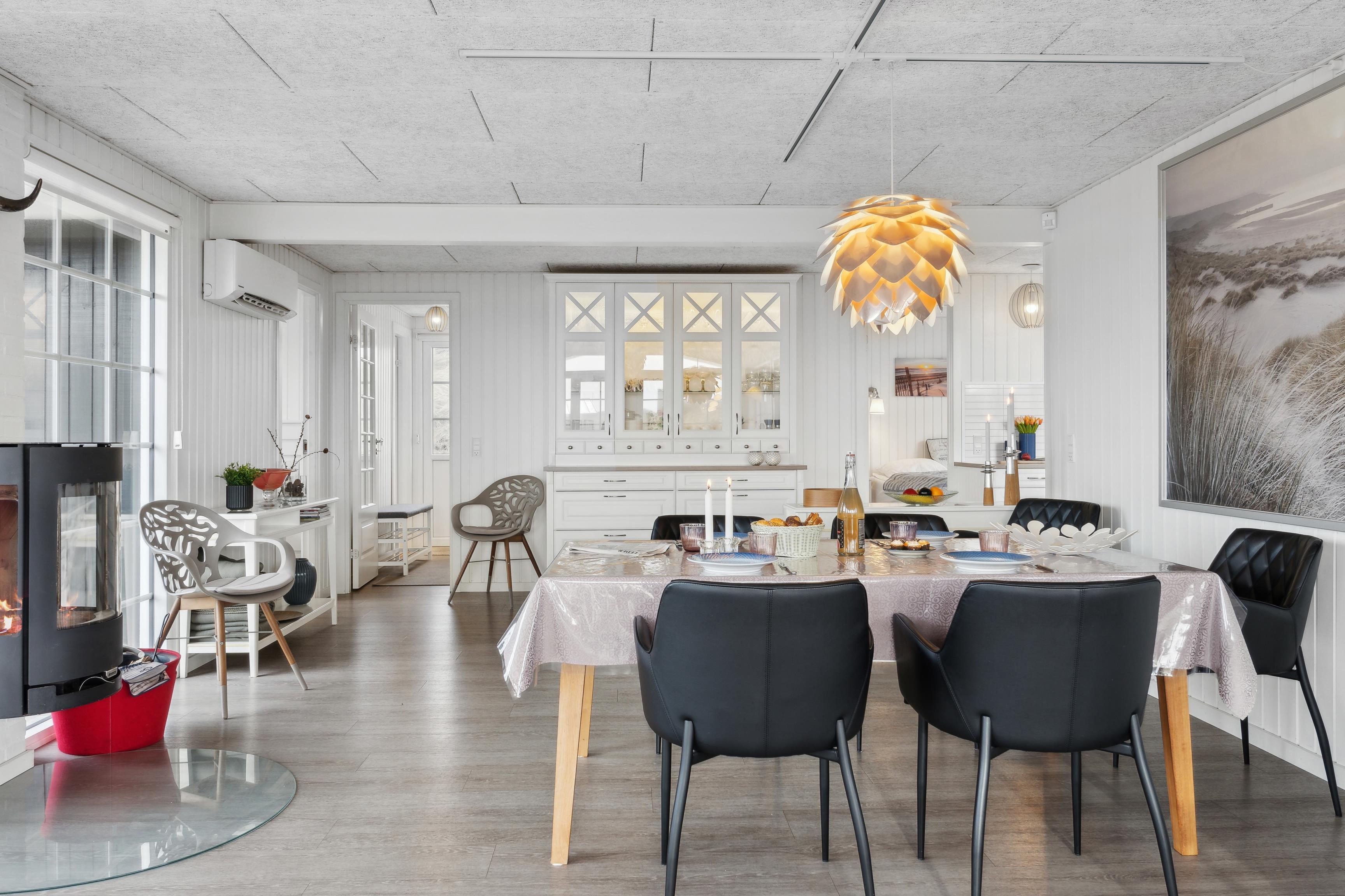 Huset har tre lyse og smagfuldt indrettede soveværelser, der giver god plads til både familie og venner. I opholdsrummet kan I nyde varmen fra brændeovnen på de køligere aftener, mens I slapper af med en god bog eller en kop te.