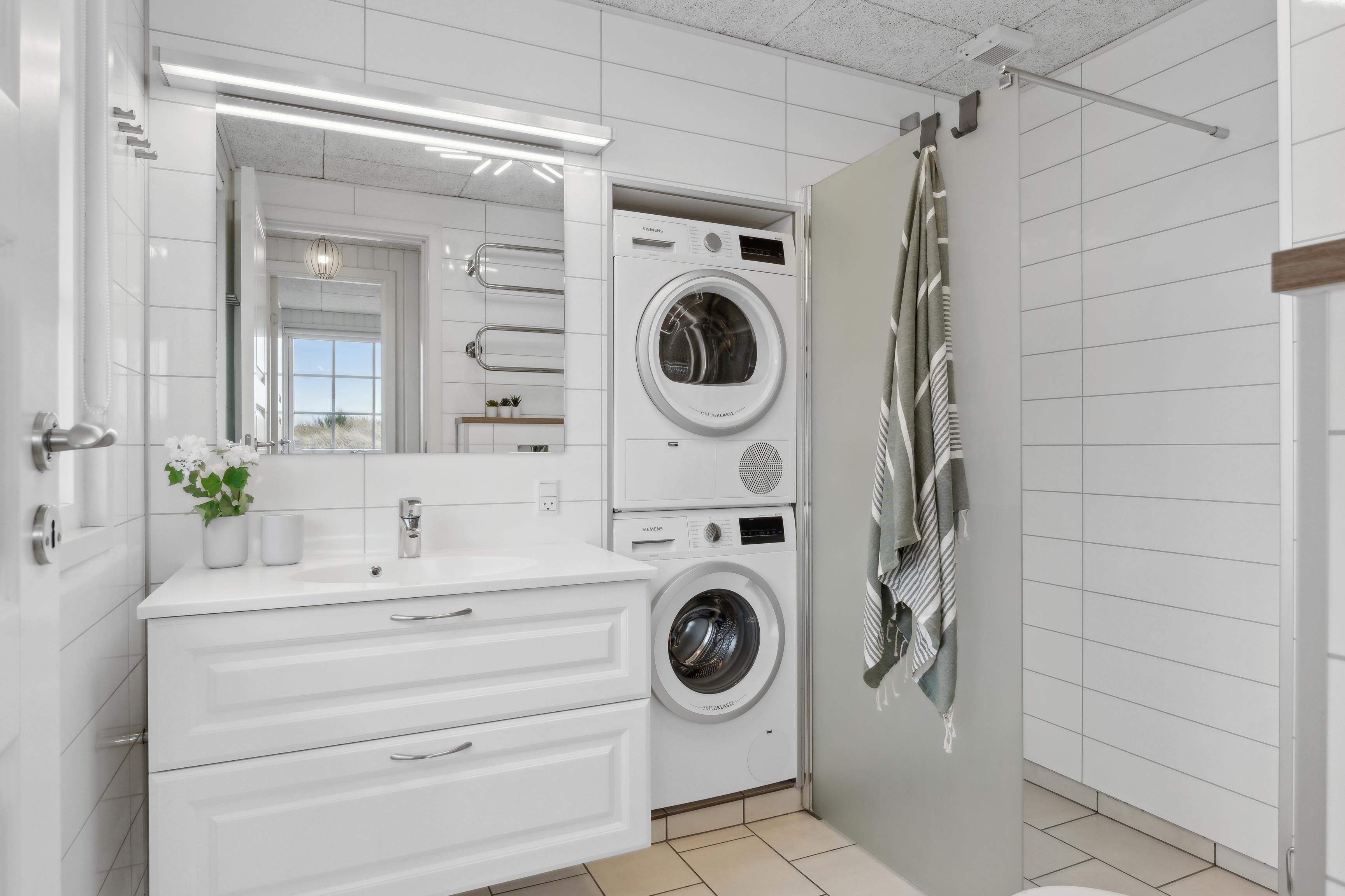 Badeværelset er rummeligt og har en stor brusekabine, perfekt til et afslappende bad efter en dag ved stranden. Derudover er der både vaskemaskine og tørretumbler, så I nemt kan holde tøjet friskt under opholdet.