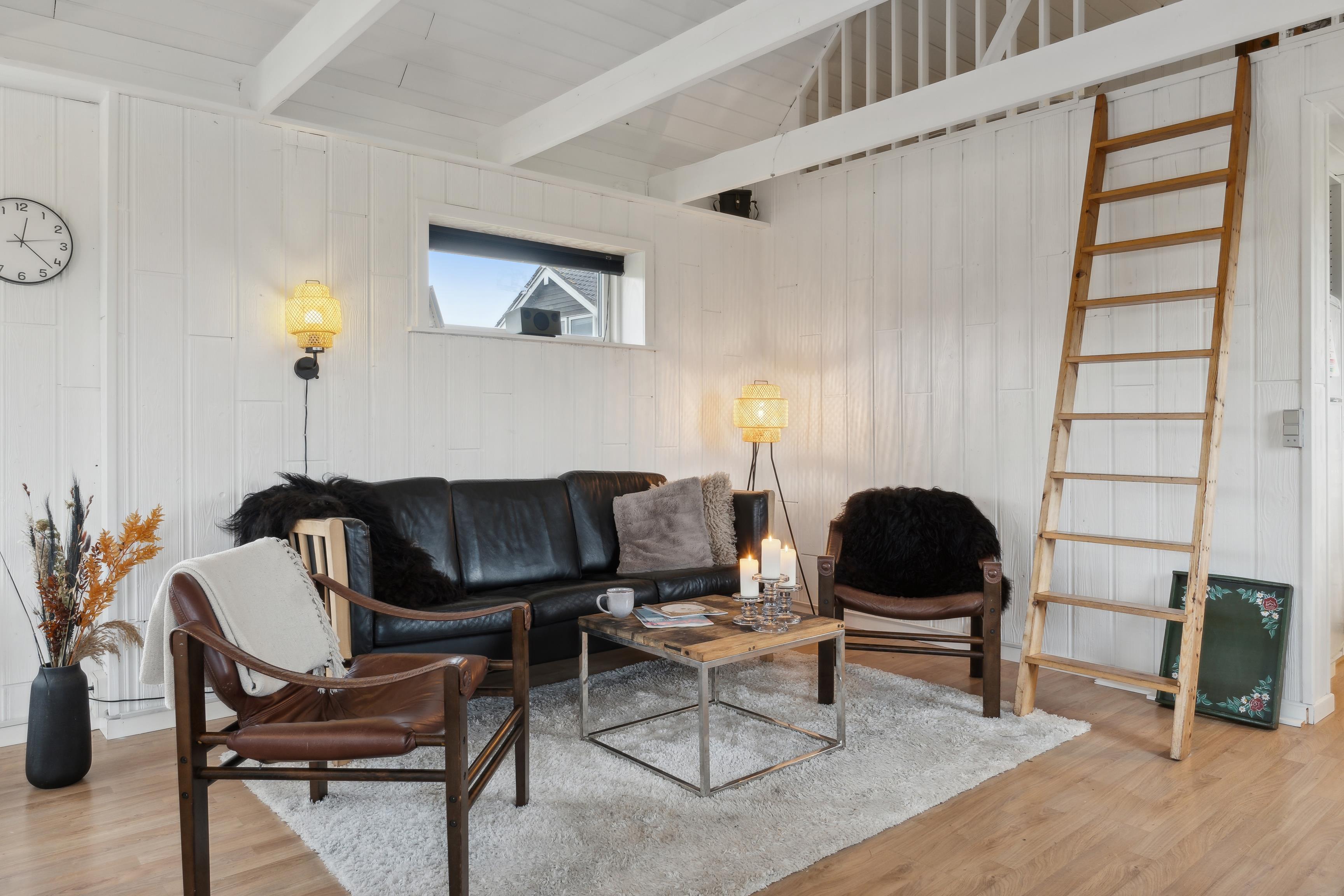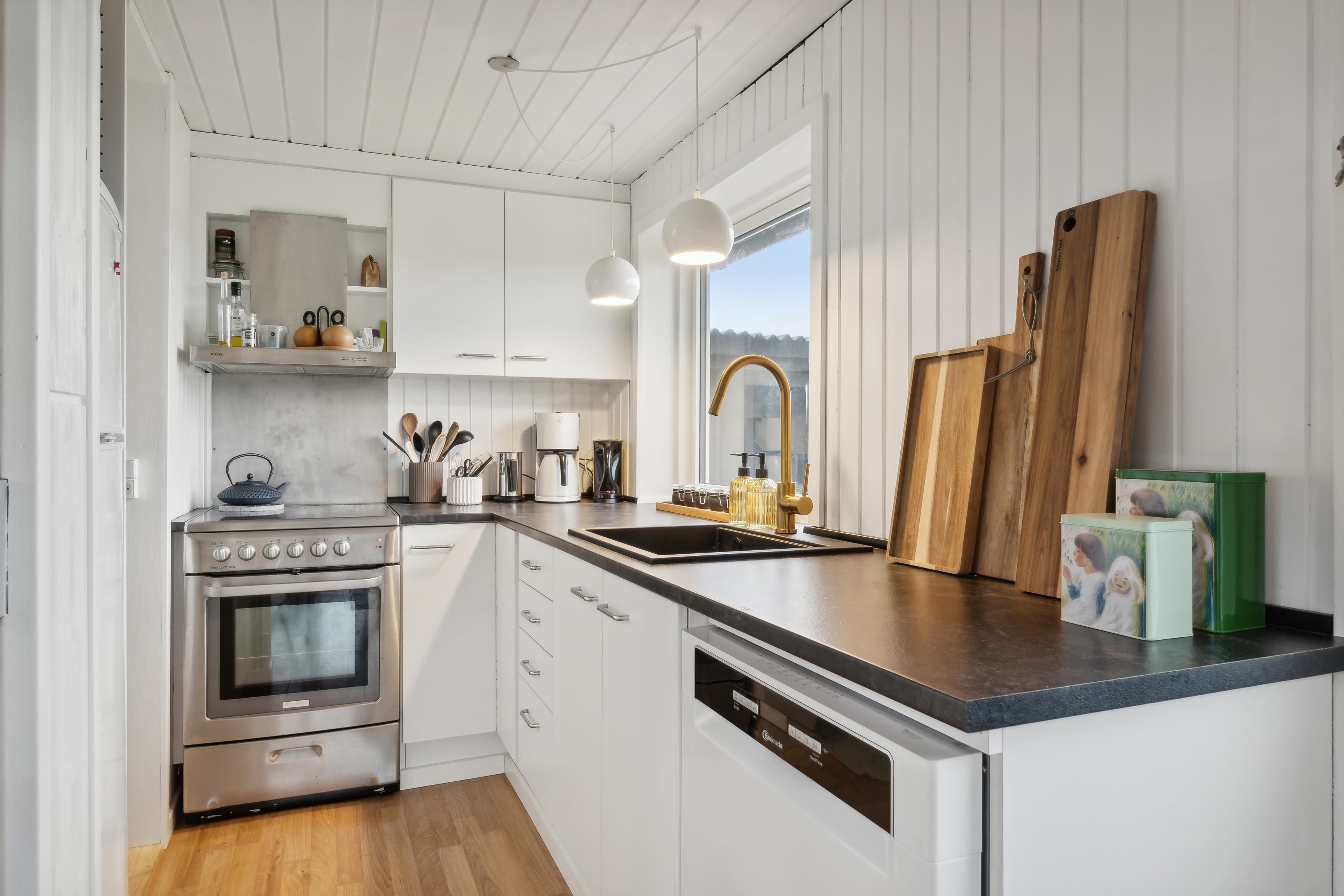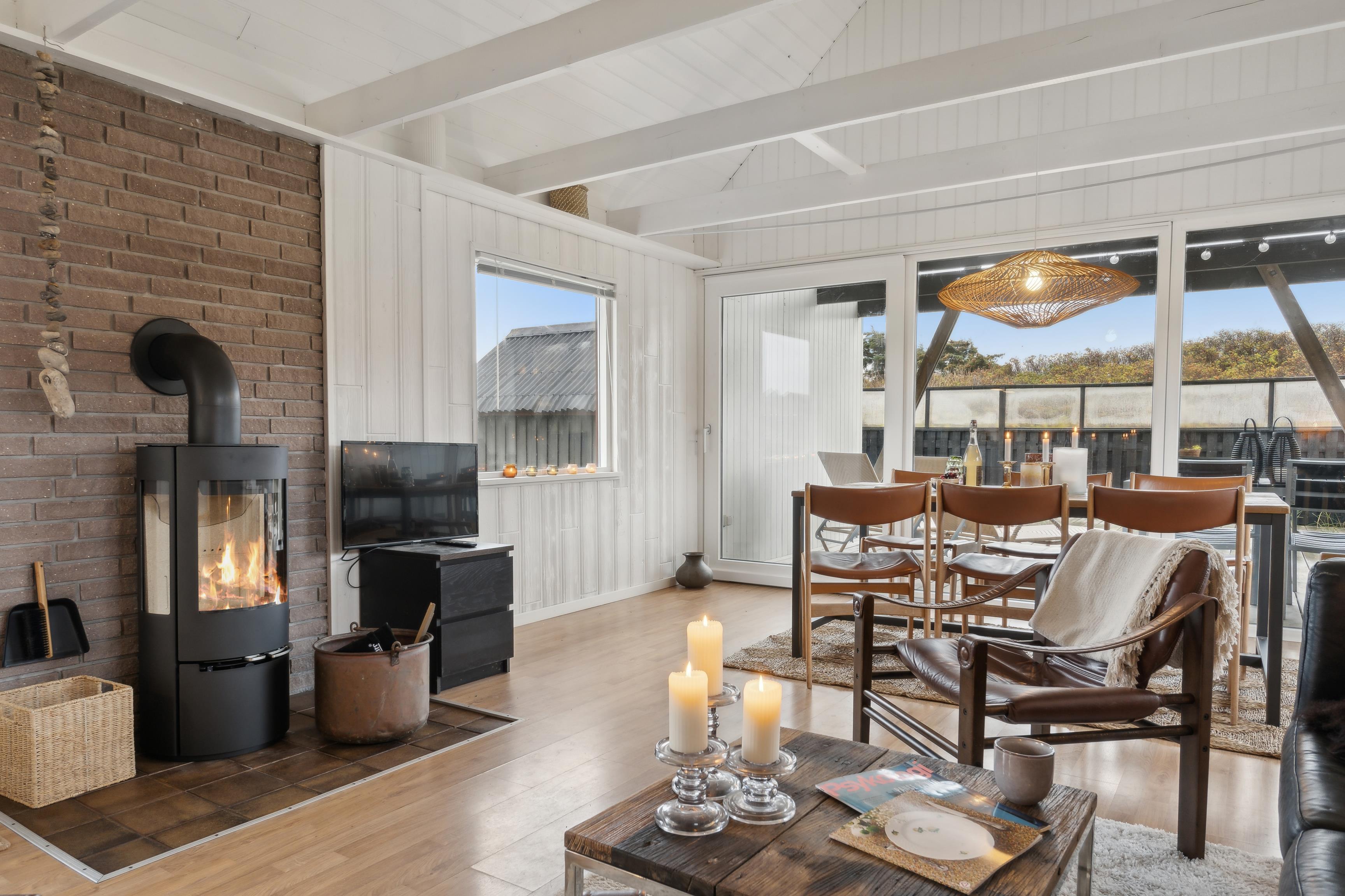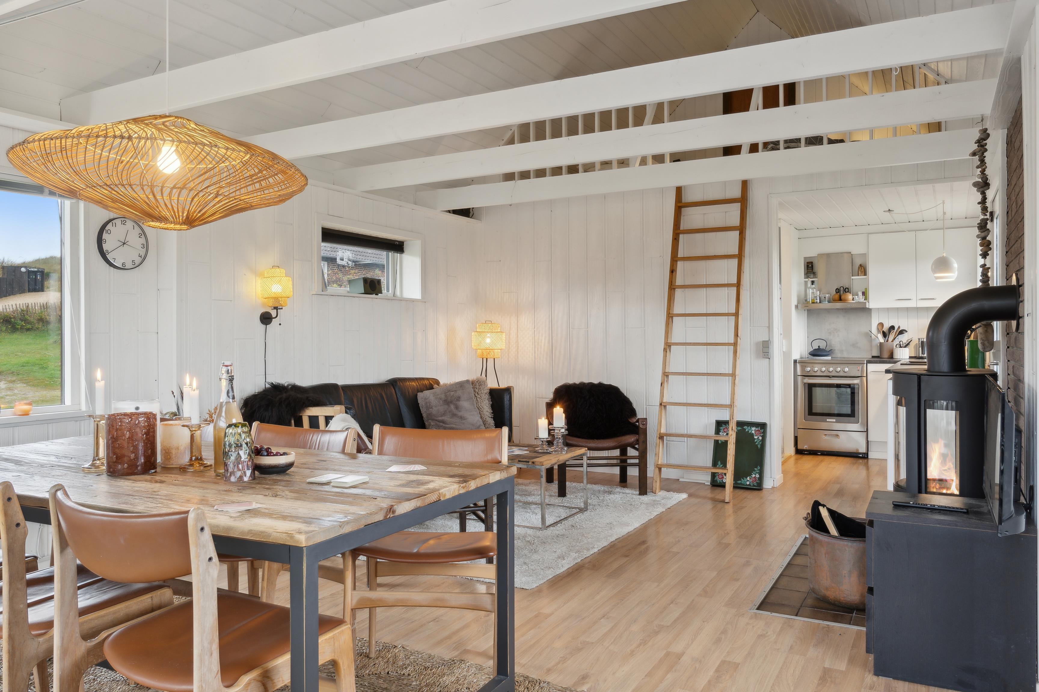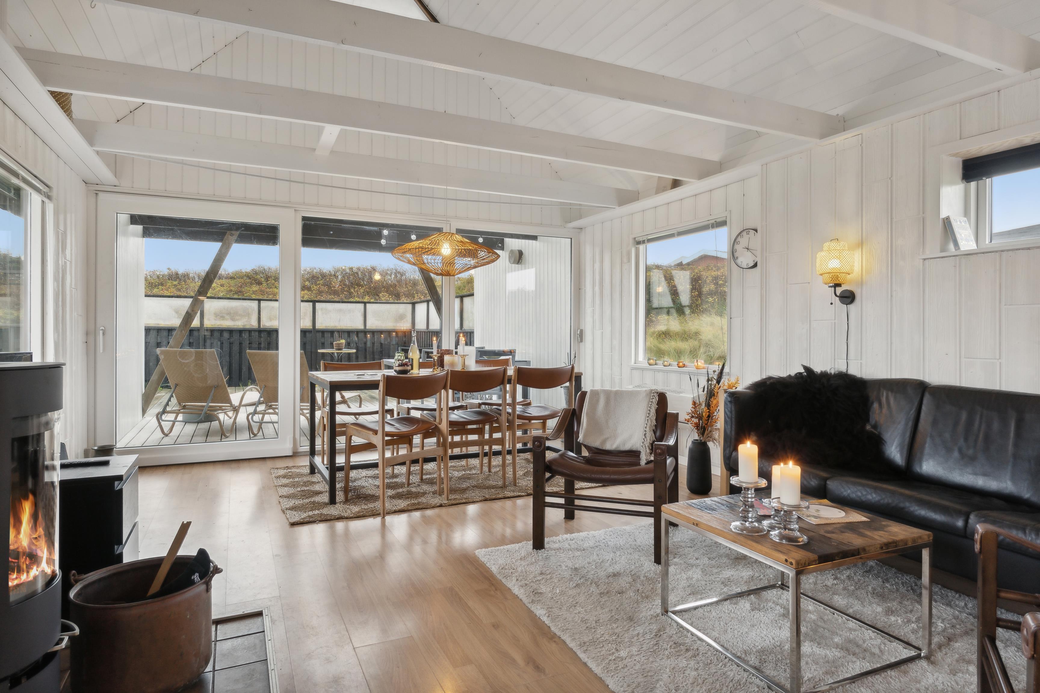 Indretning og faciliteter: Sommerhuset byder på en lys og rummelig stue med store vinduespartier, der giver et fantastisk lysindfald og en skøn udsigt over de omkringliggende klitter. Den åbne planløsning forbinder stuen med et lille køkken, udstyret med alle nødvendige faciliteter til at tilberede lækre måltider.
