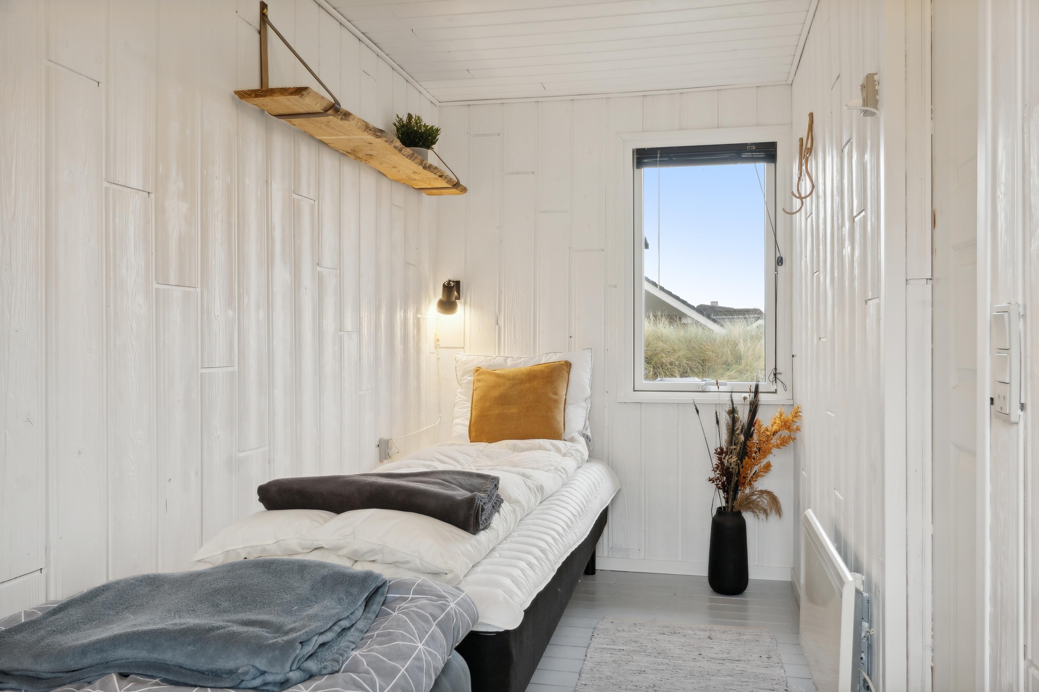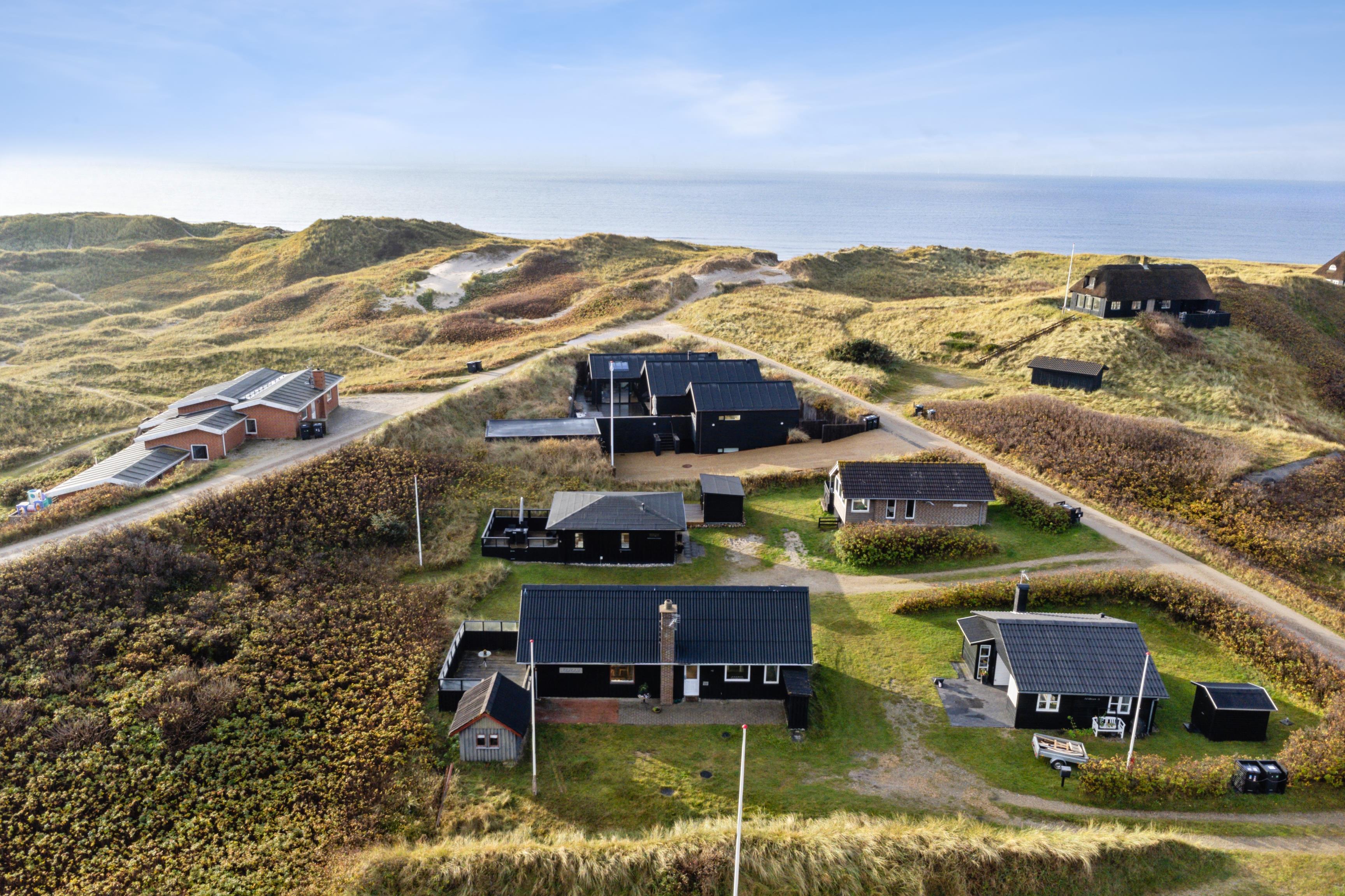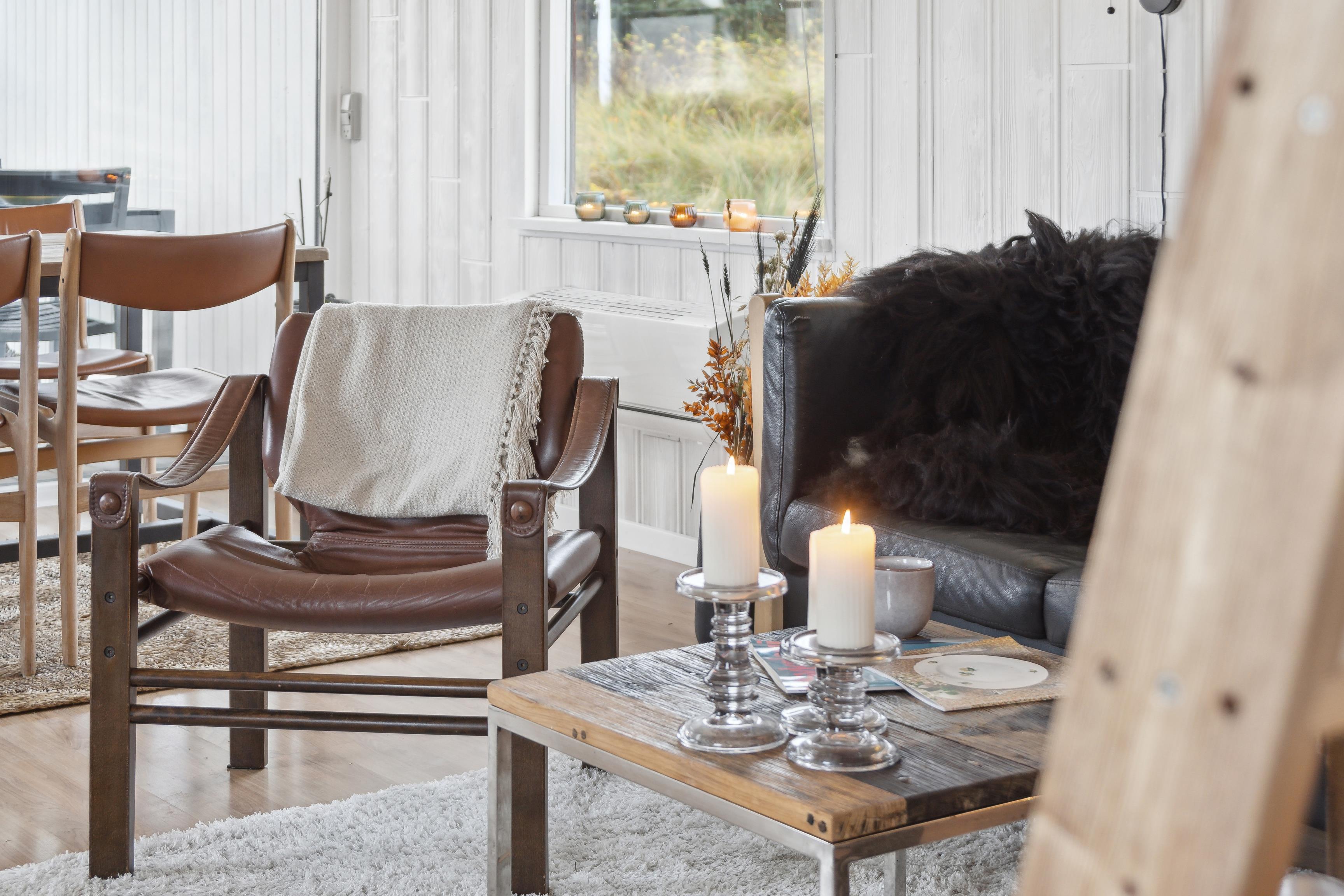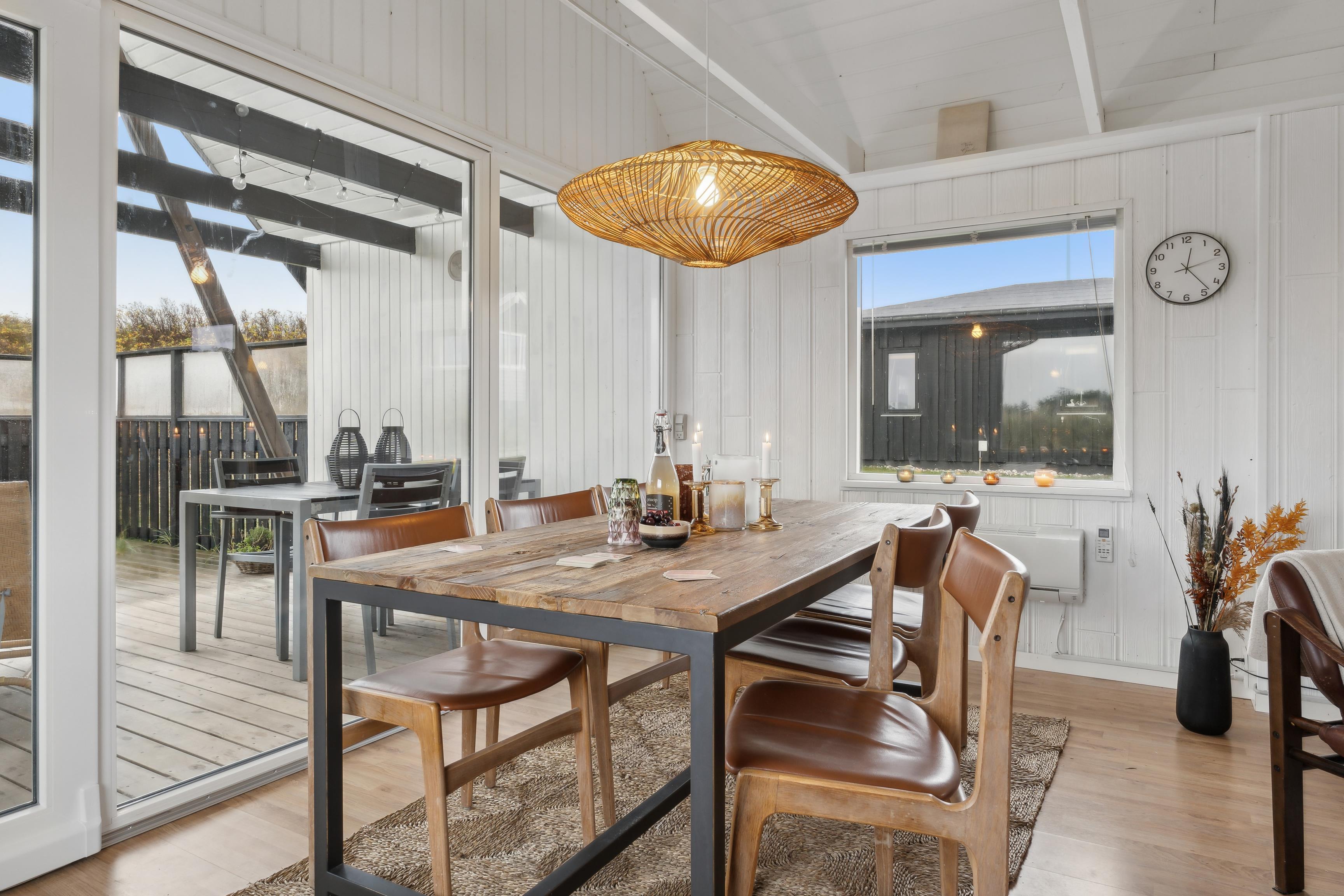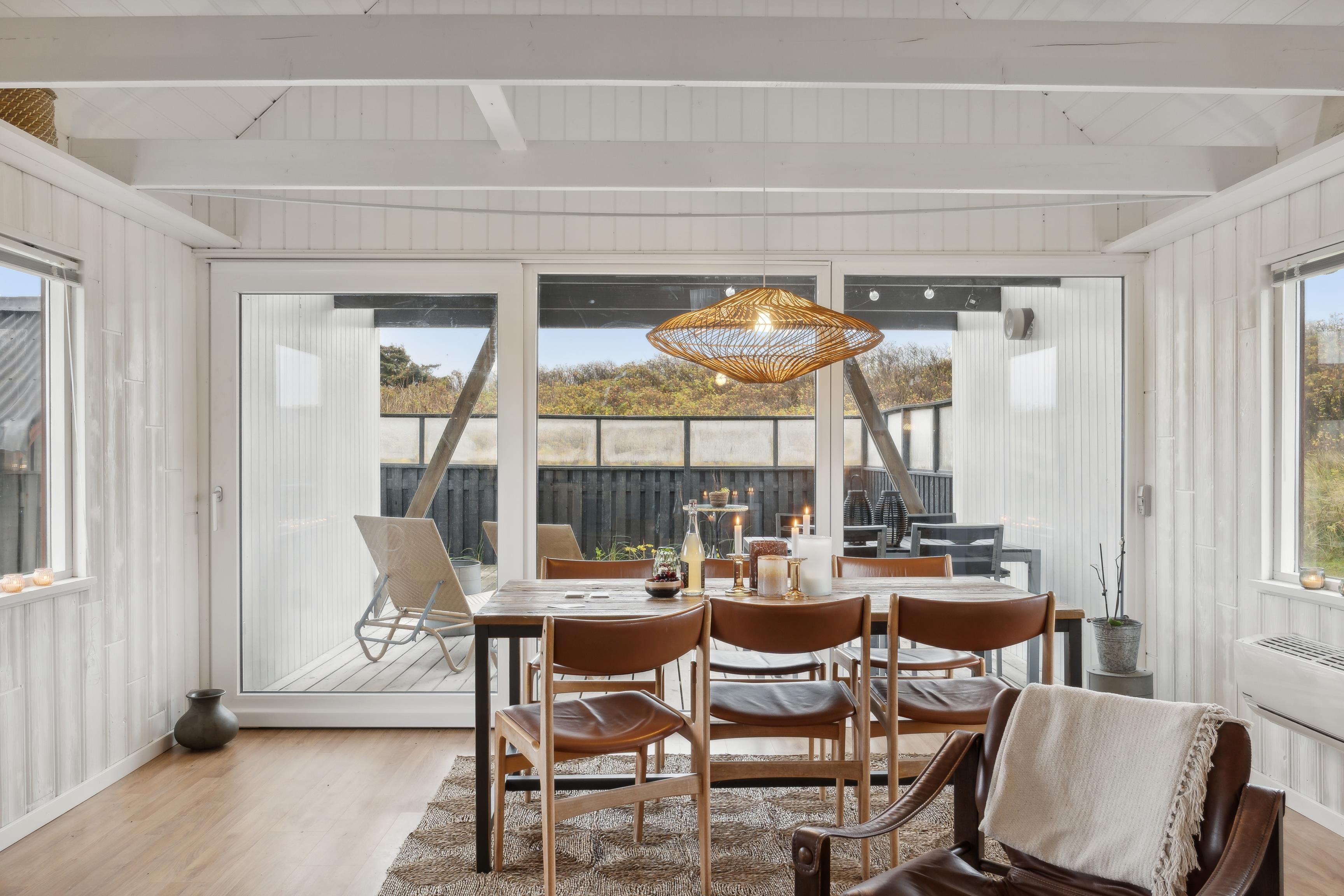 Indretning og faciliteter: Sommerhuset byder på en lys og rummelig stue med store vinduespartier, der giver et fantastisk lysindfald og en skøn udsigt over de omkringliggende klitter. Den åbne planløsning forbinder stuen med et lille køkken, udstyret med alle nødvendige faciliteter til at tilberede lækre måltider.