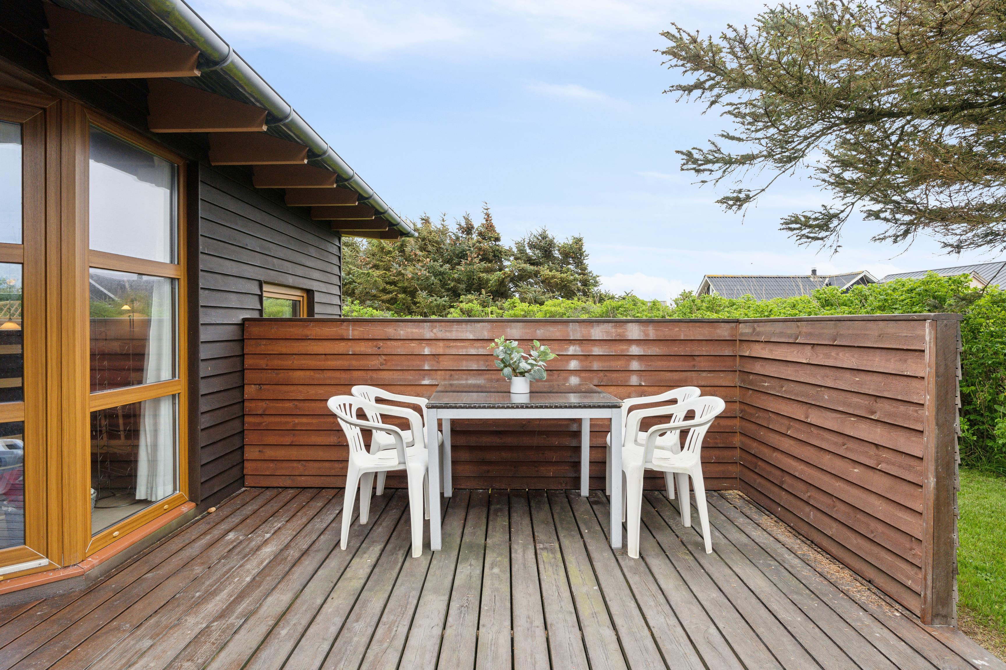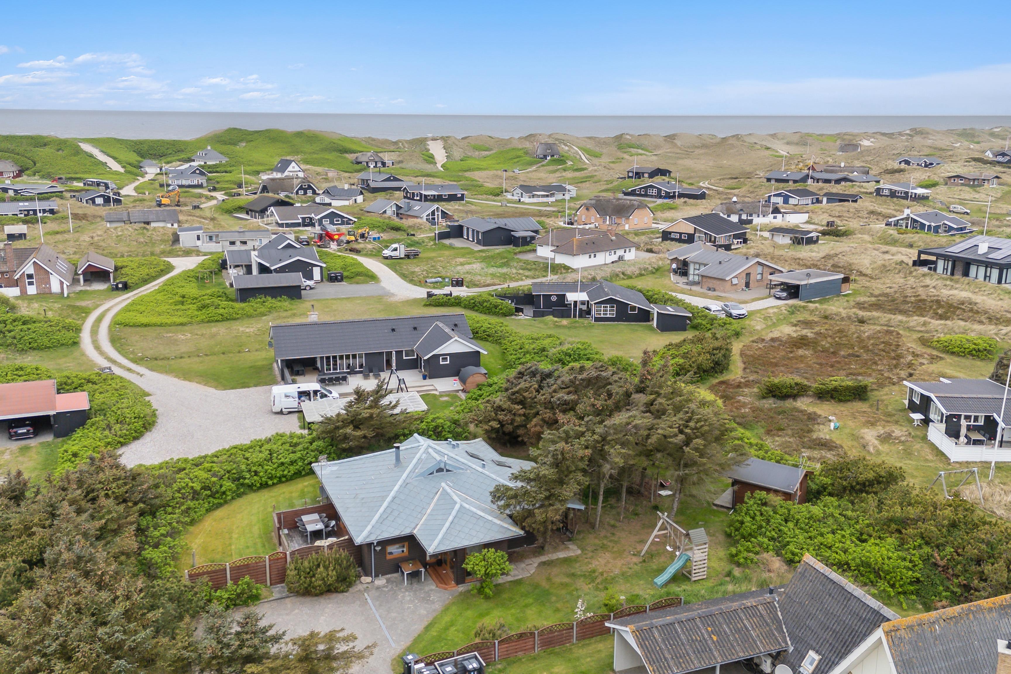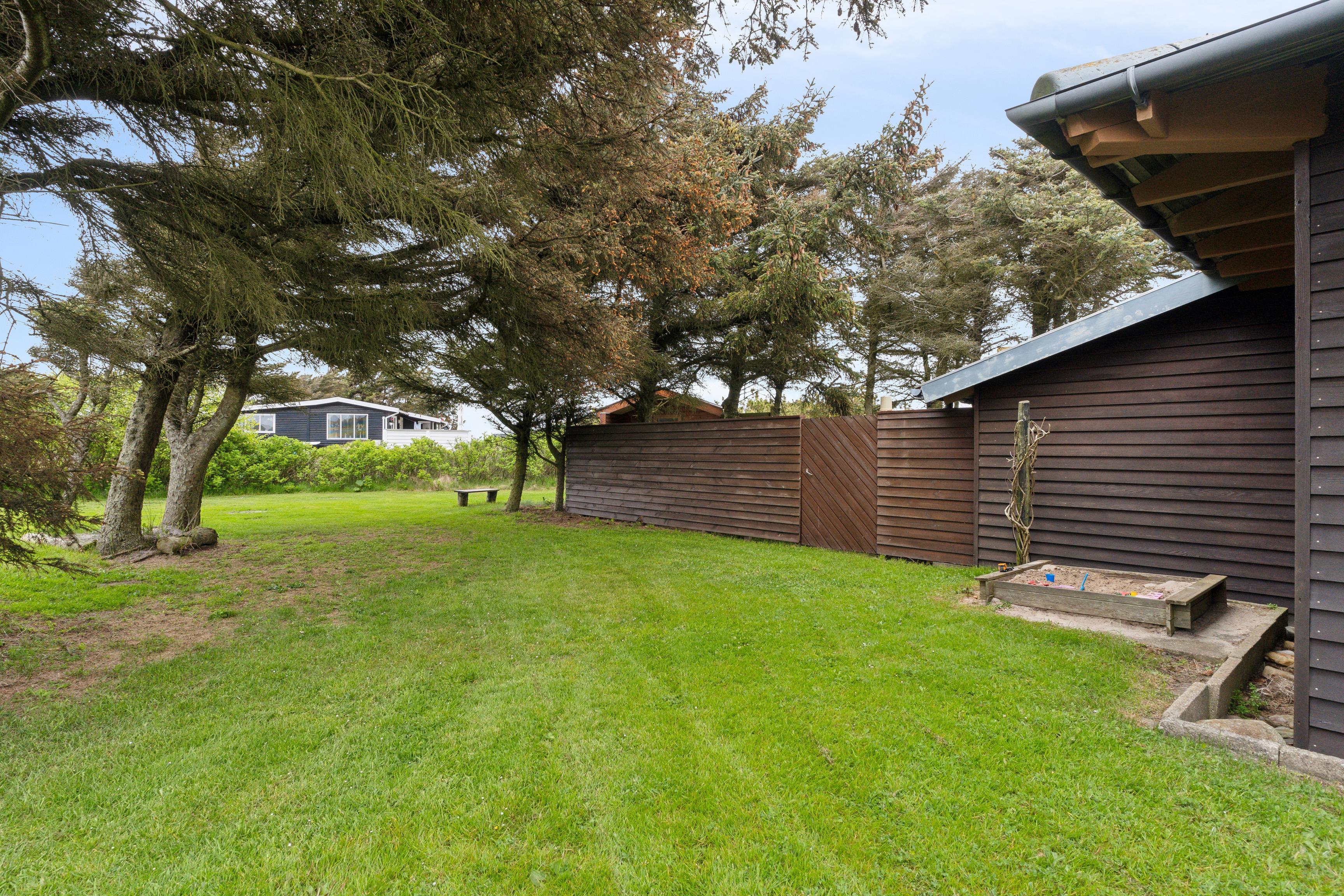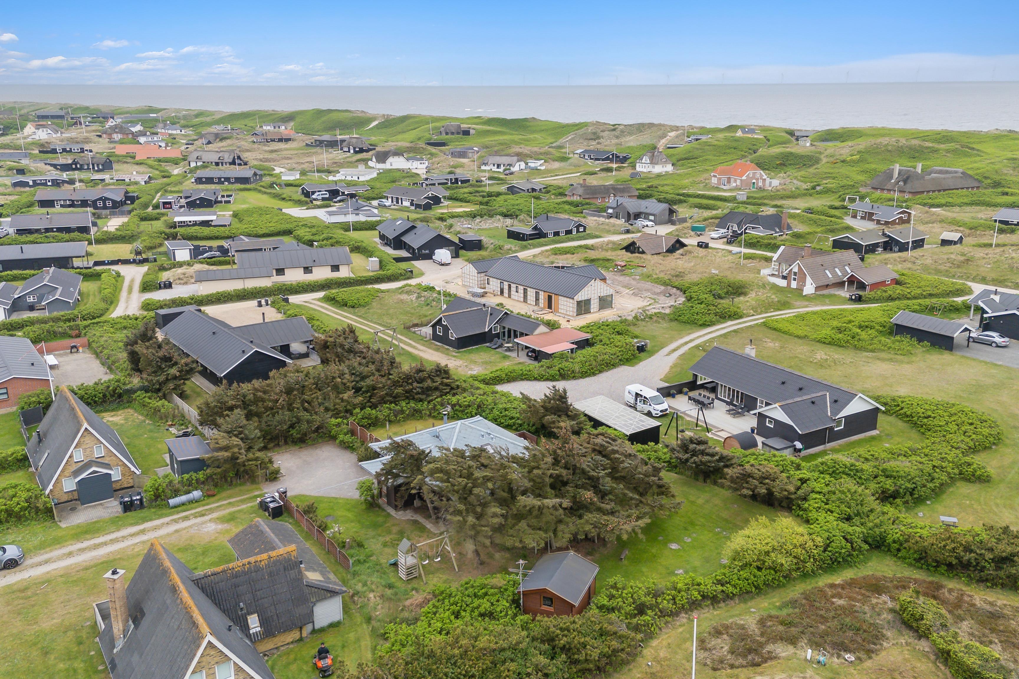 Dette sommerhus på 100 m² ligger på en smuk, græsklædt grund, omkranset af buske og træer, der giver både læ og privatliv. Der er to afskærmede terrasser på hver side af huset, så I kan følge solens gang hele dagen. Huset ligger kun 350 meter fra det kraftfulde Vesterhav, hvor der er rig mulighed for at bade eller gå lange ture. Den friske havluft og de åbne vidder giver både plads til leg og afslapning.
